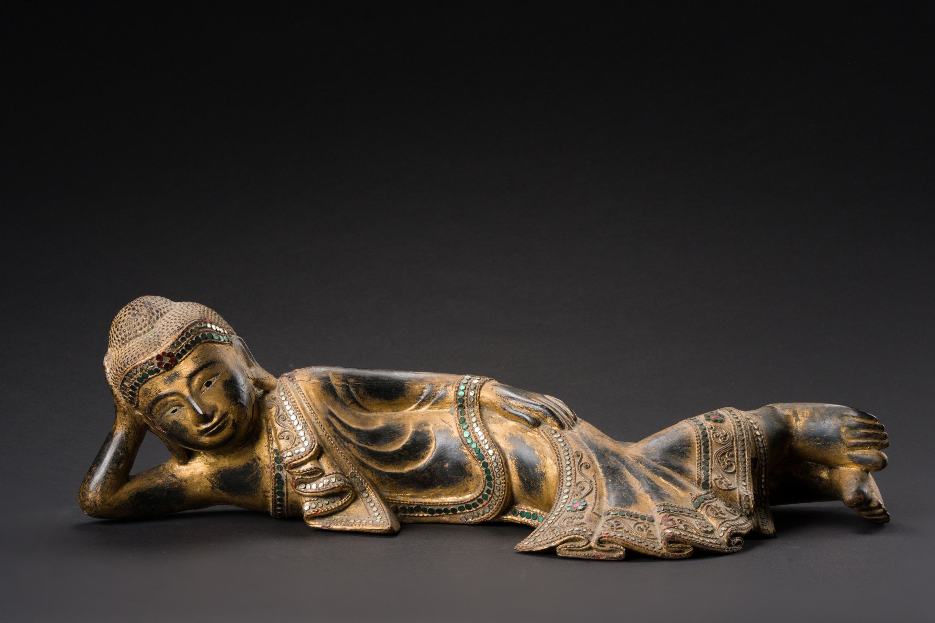 A carved wooden subject with a patiently gilded patina embellished with verroterie depicting Buddha in the Nirvāna position.