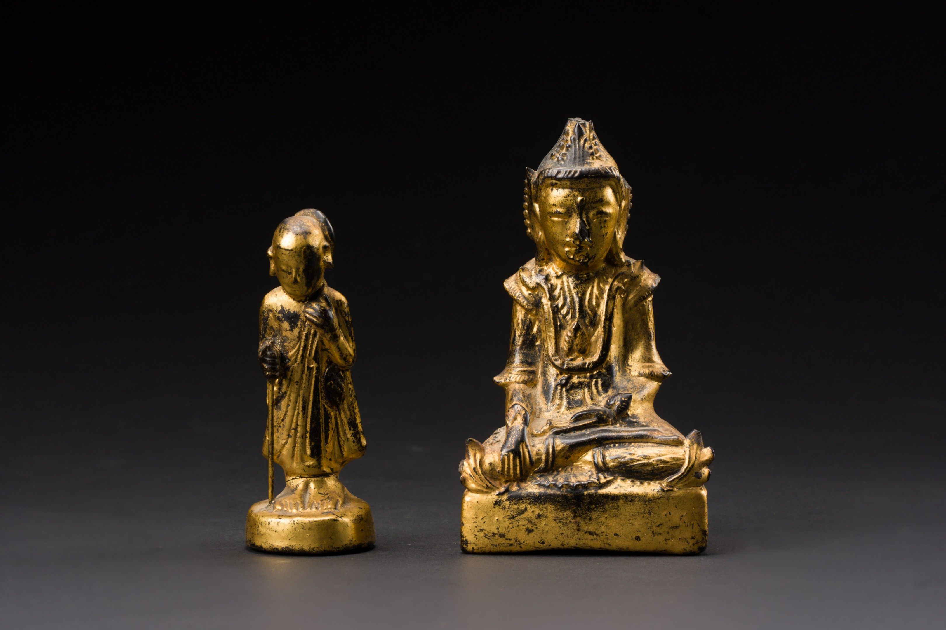 Two gilt patina wooden subjects depicting Phra Sivali and Buddha in Māravijaya posture.