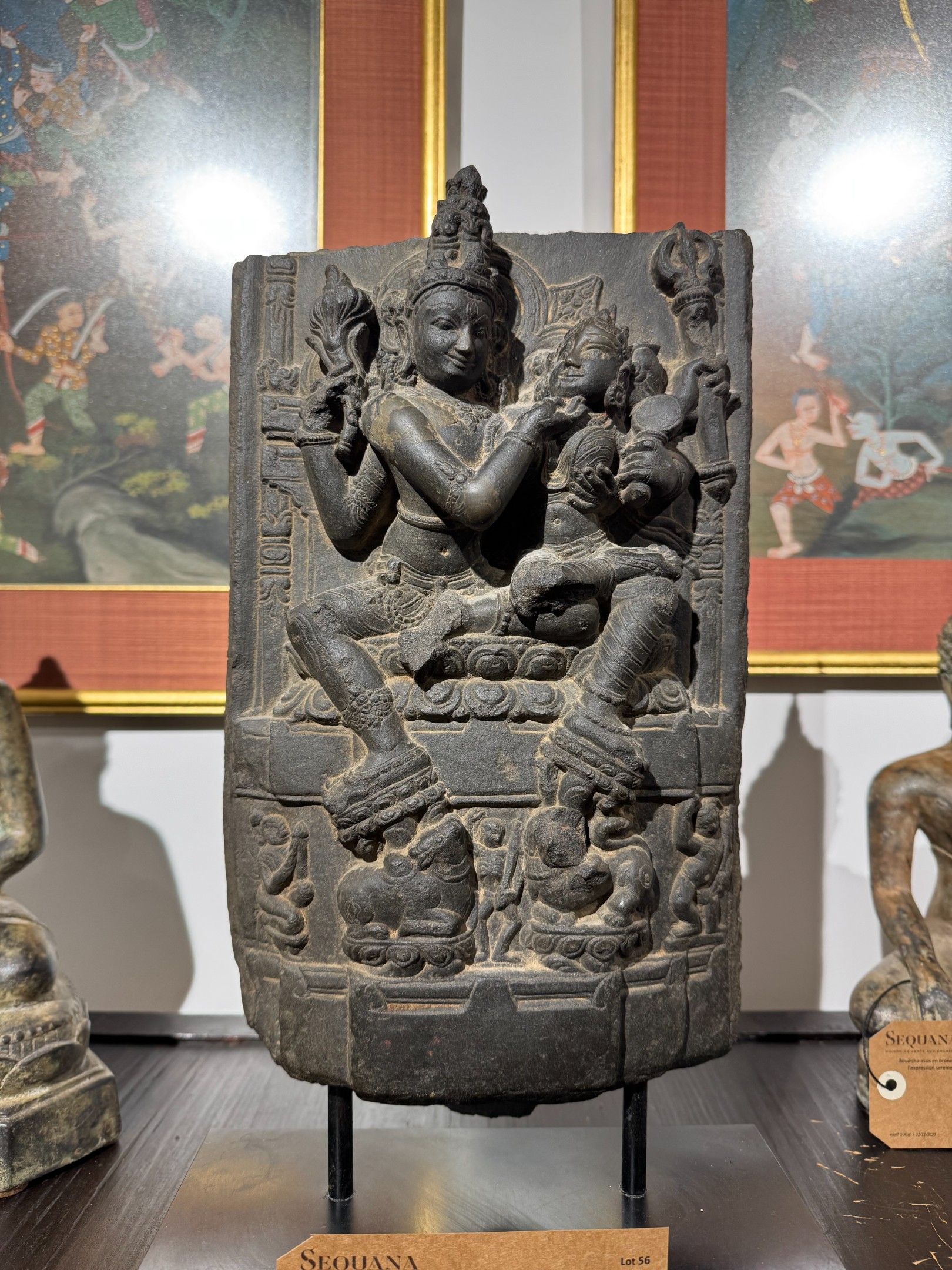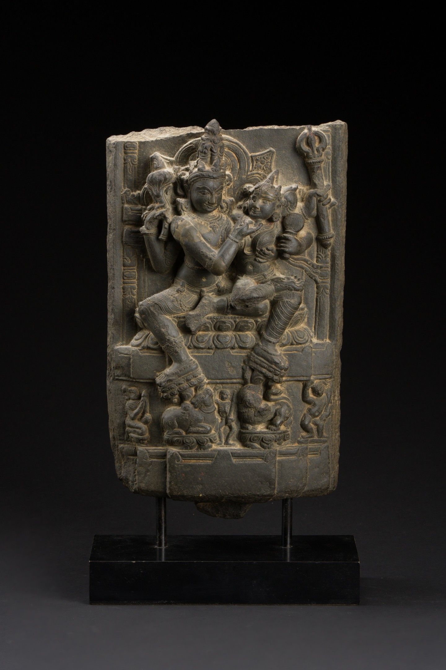 Sculpted stone stele showing Shiva in a relaxed position, delicately embracing his consort Parvati.