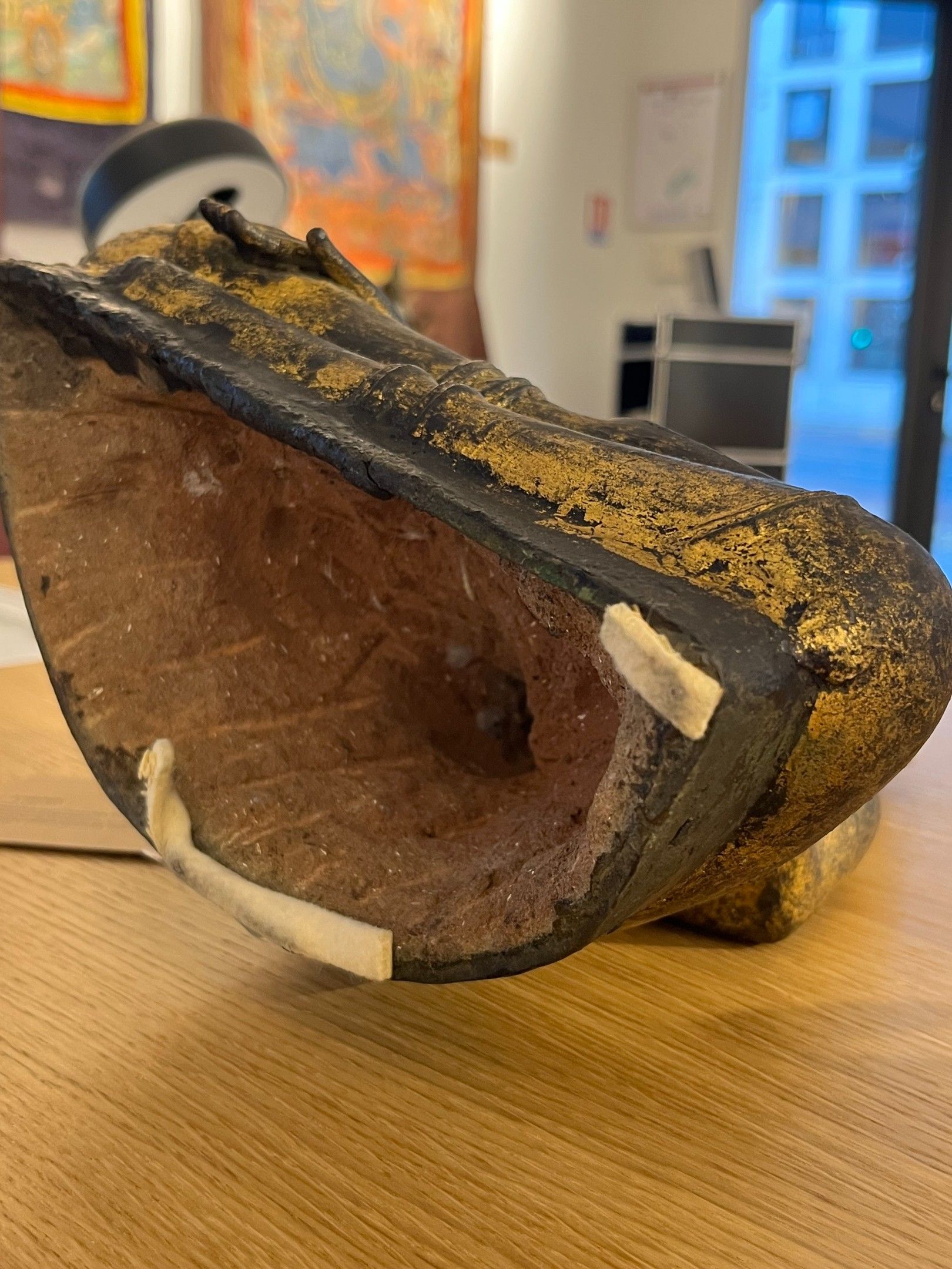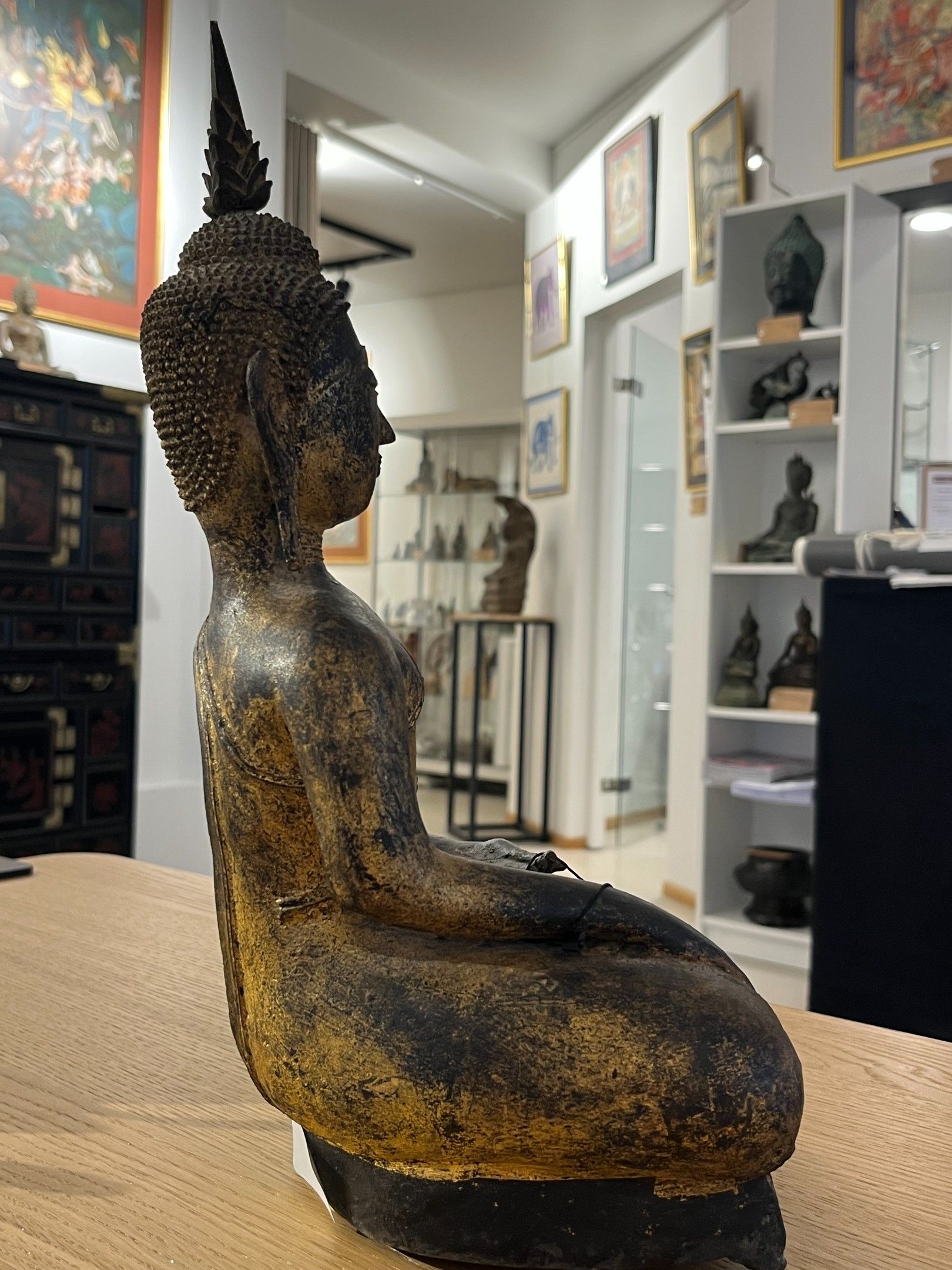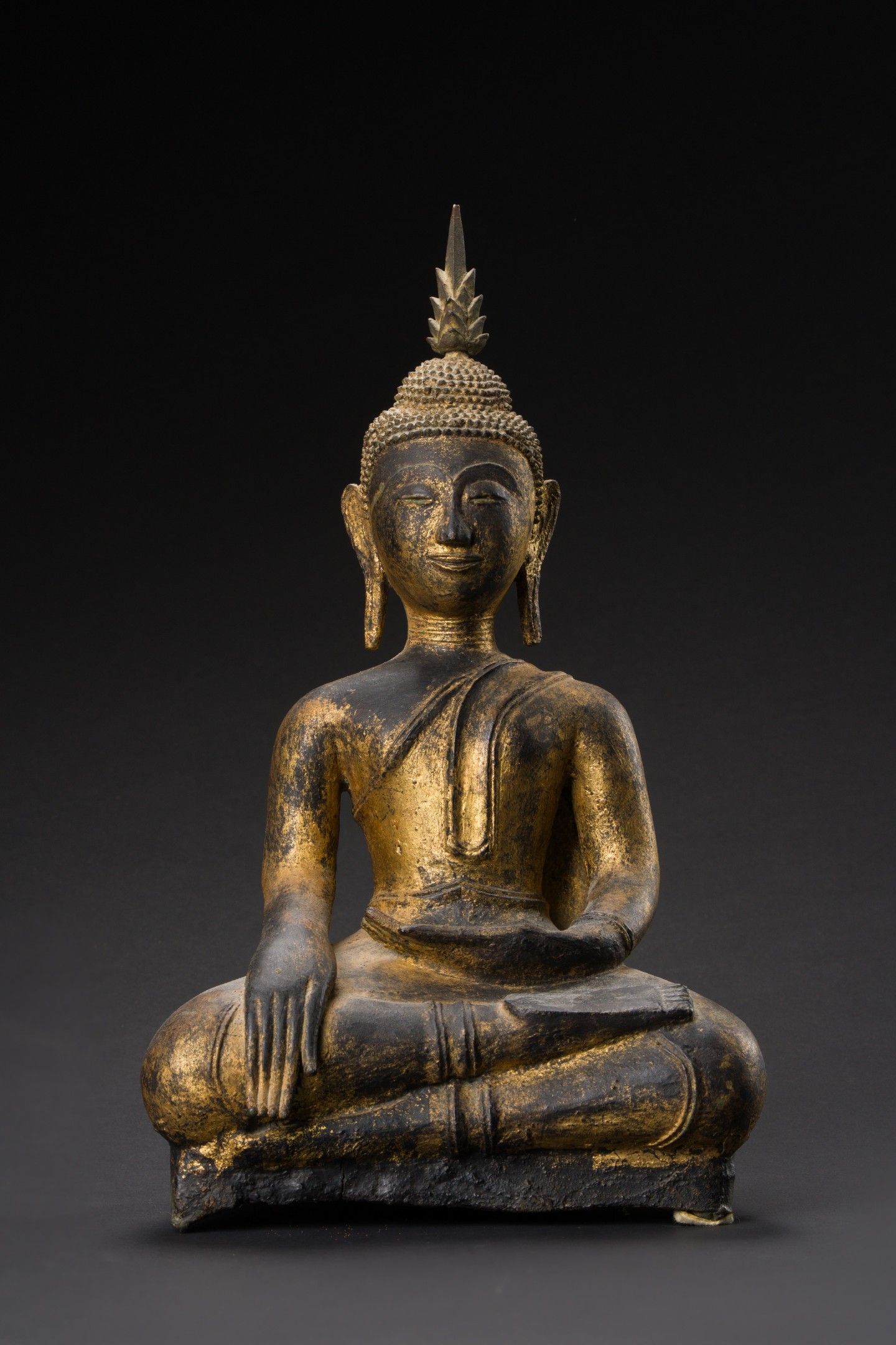 Seated bronze Buddha, hands in bhumisparsa mudra, wearing a sanghati, face with serene expression, eyes lowered, eyebrows arched, hair in curls topped with the ushnisha.