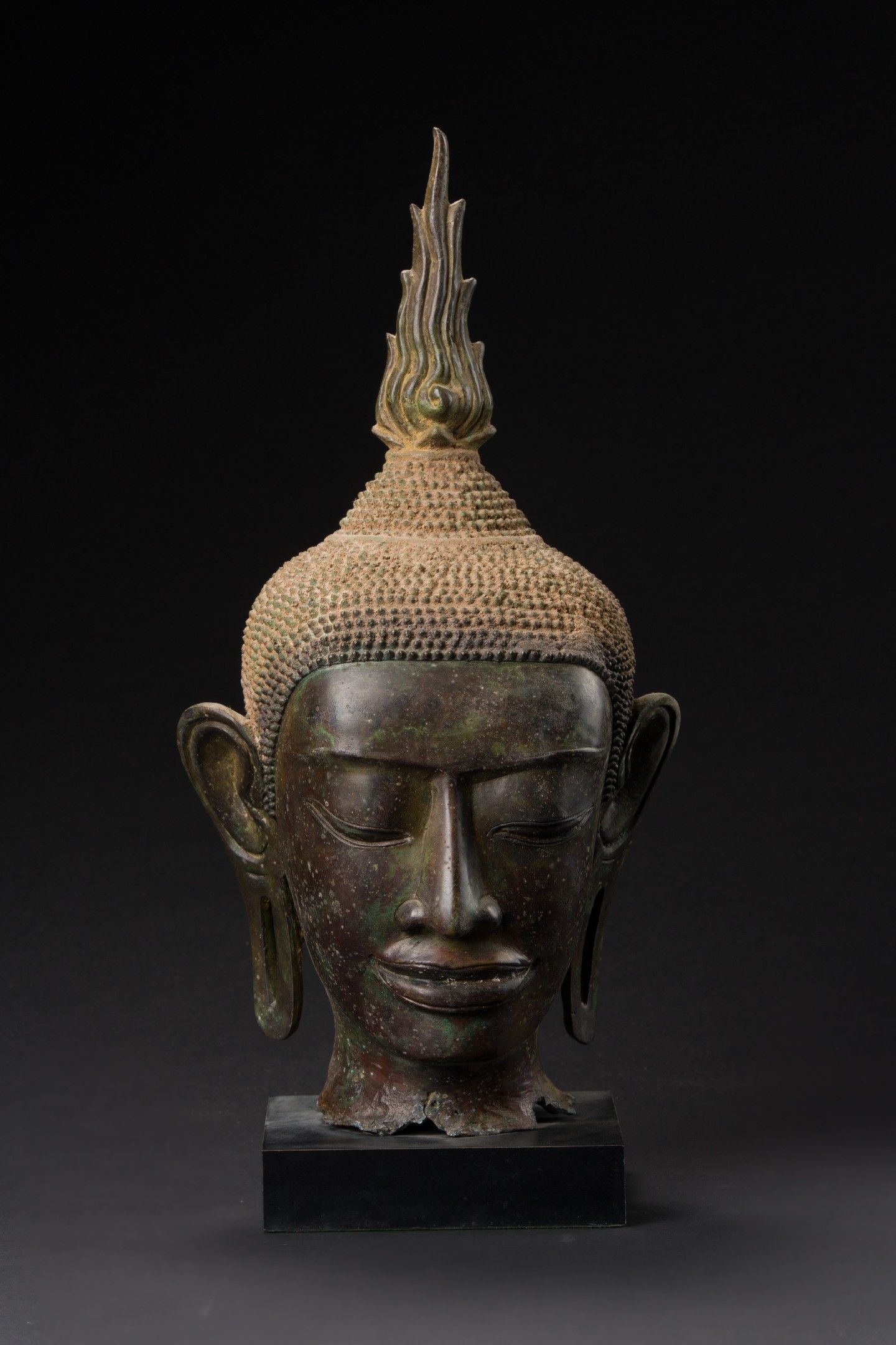 Patinated bronze Buddha head with curls of hair surmounted by the ushnisha.