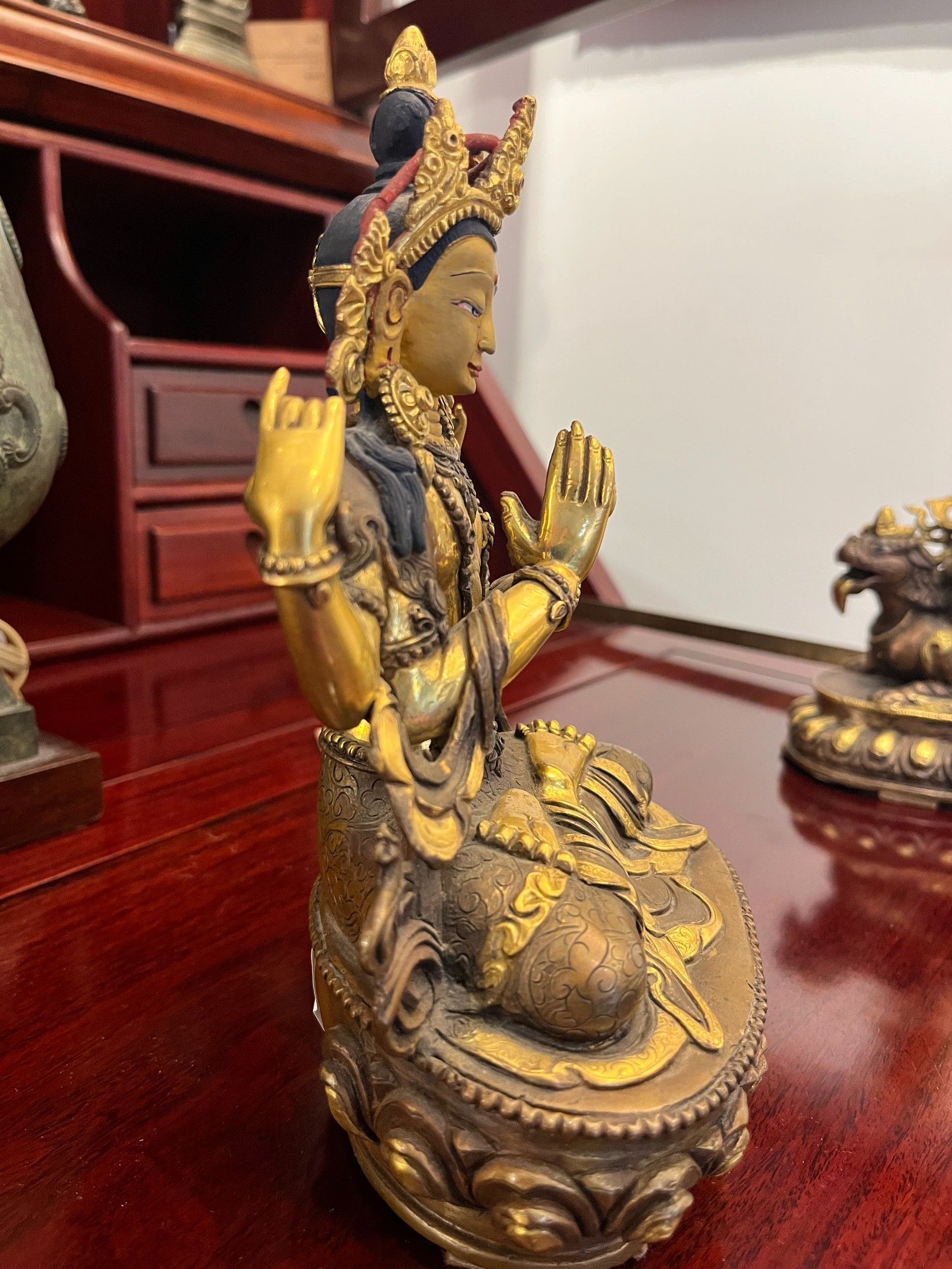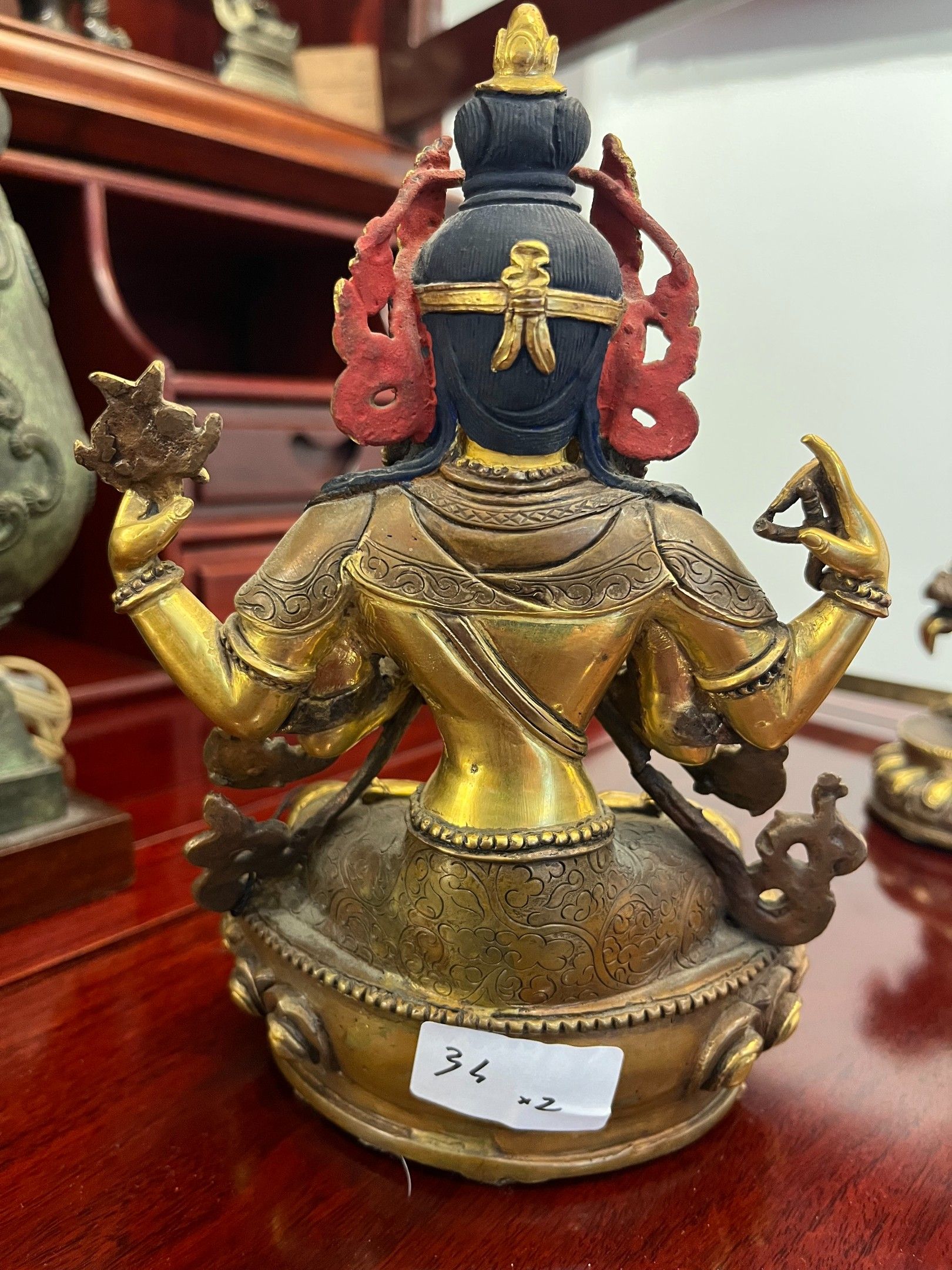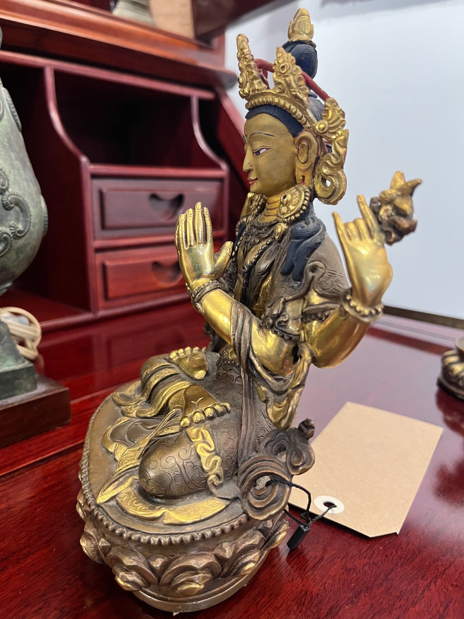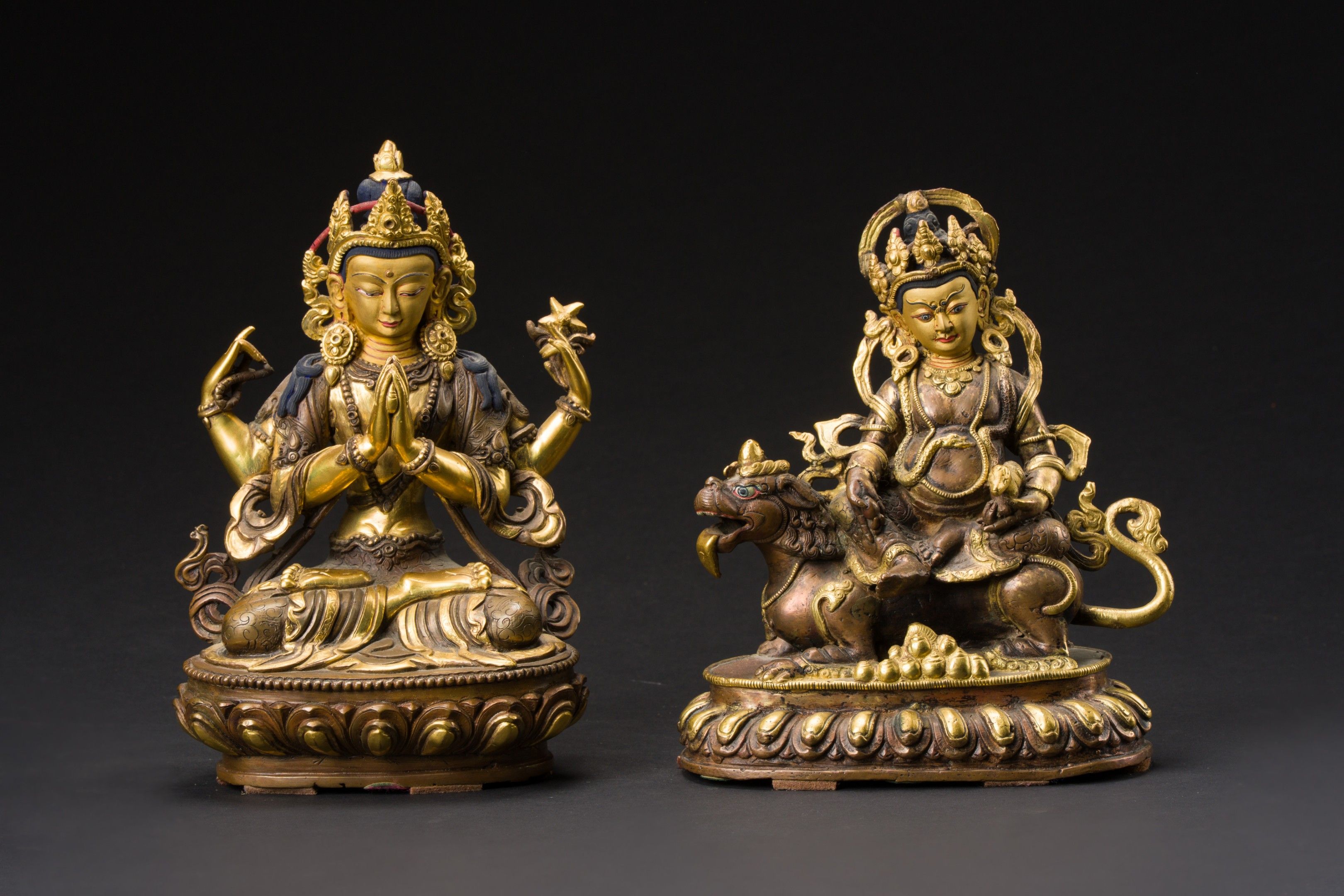 Two metal subjects with double brown and gold patina depicting Sita Jambhala on a Lotus flower and Chenrezig.