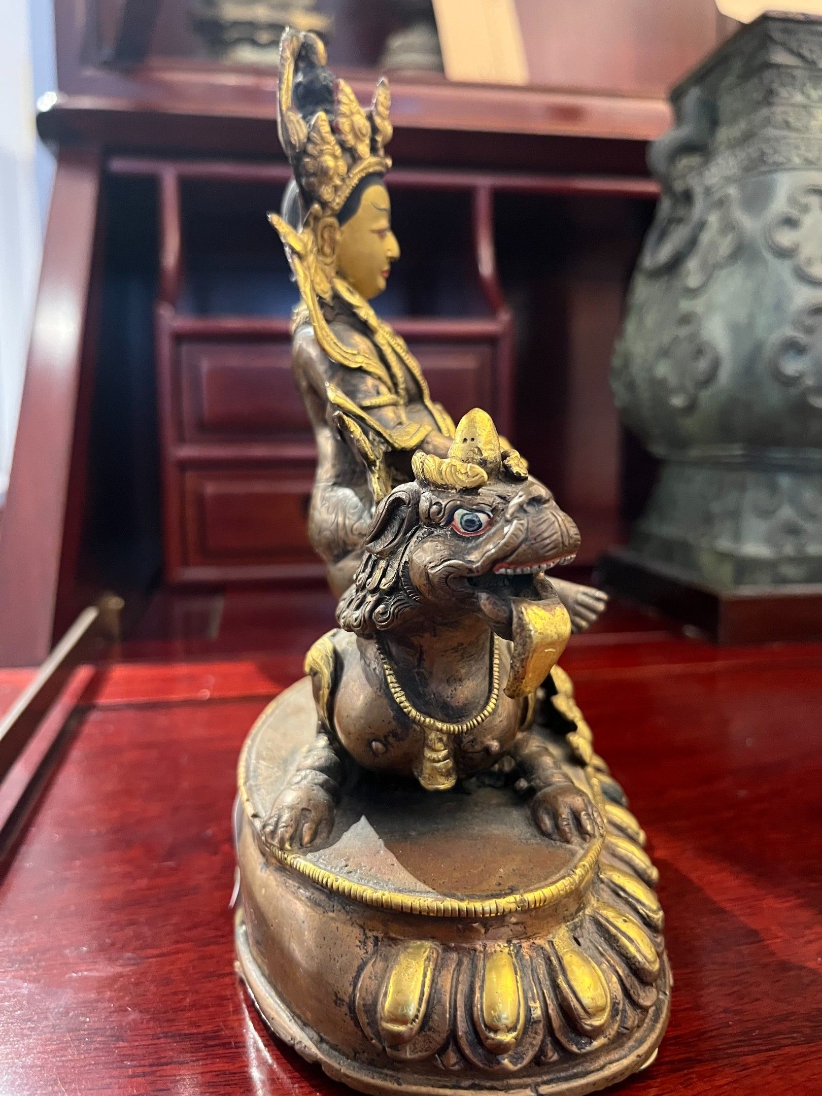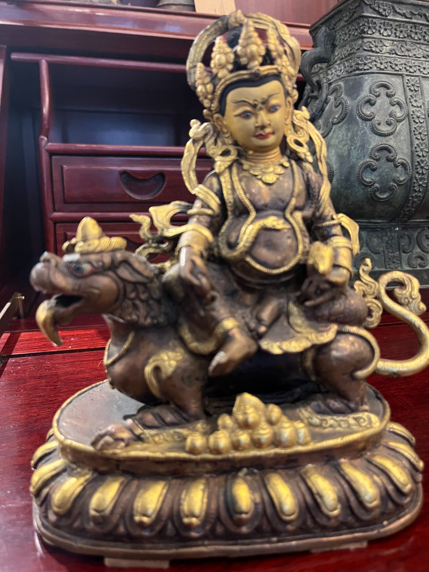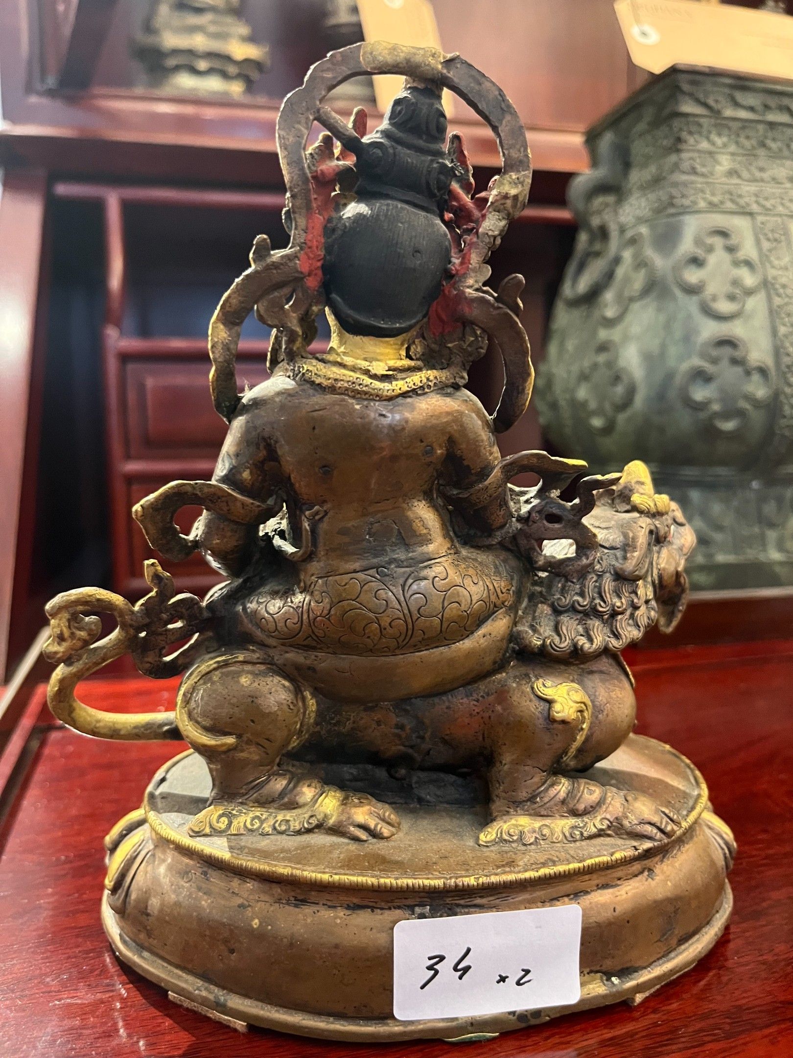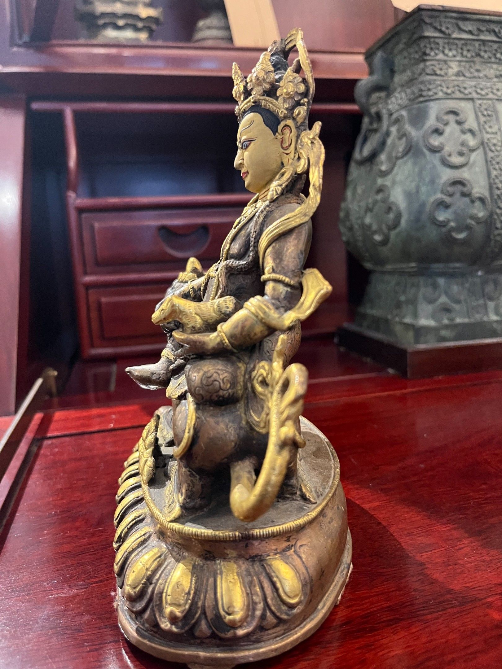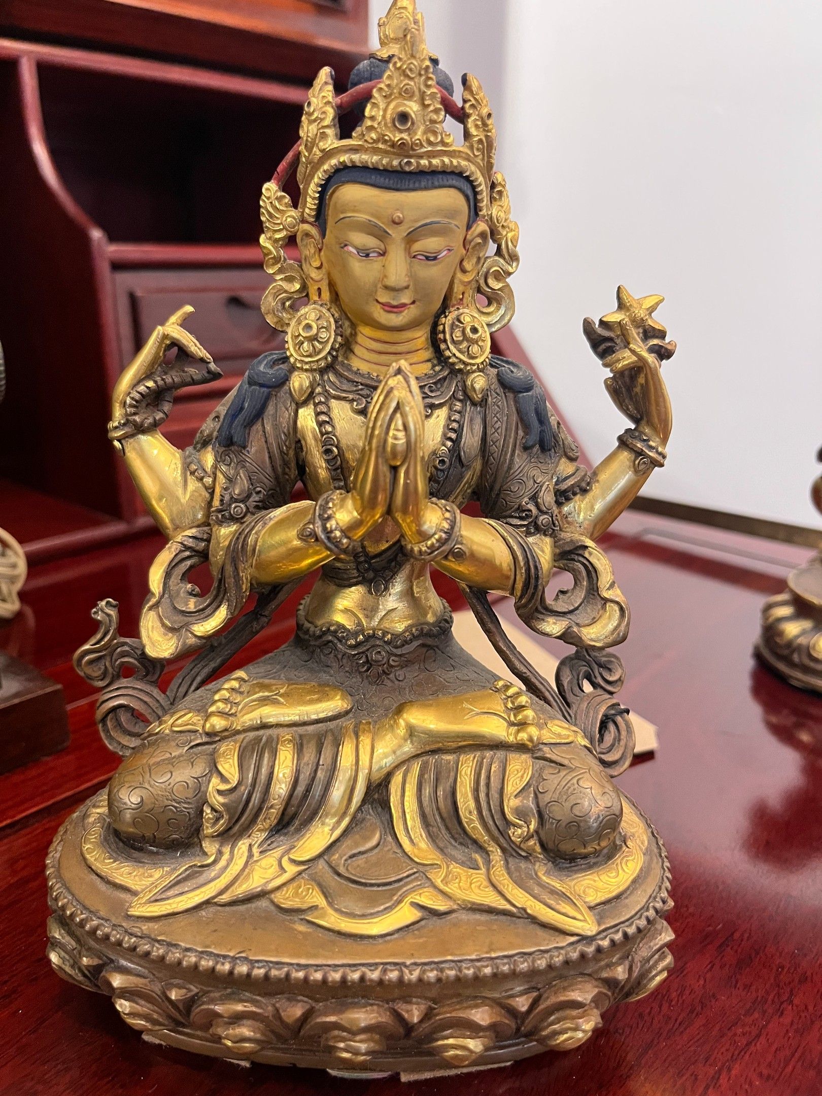 Two metal subjects with double brown and gold patina depicting Sita Jambhala on a Lotus flower and Chenrezig.