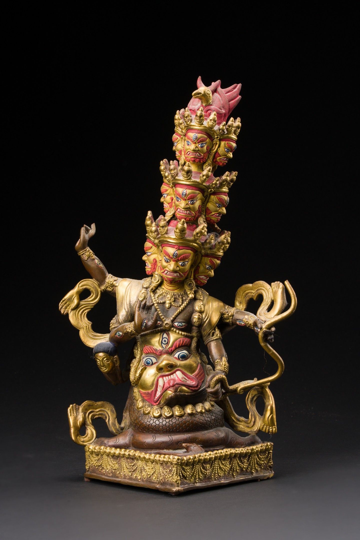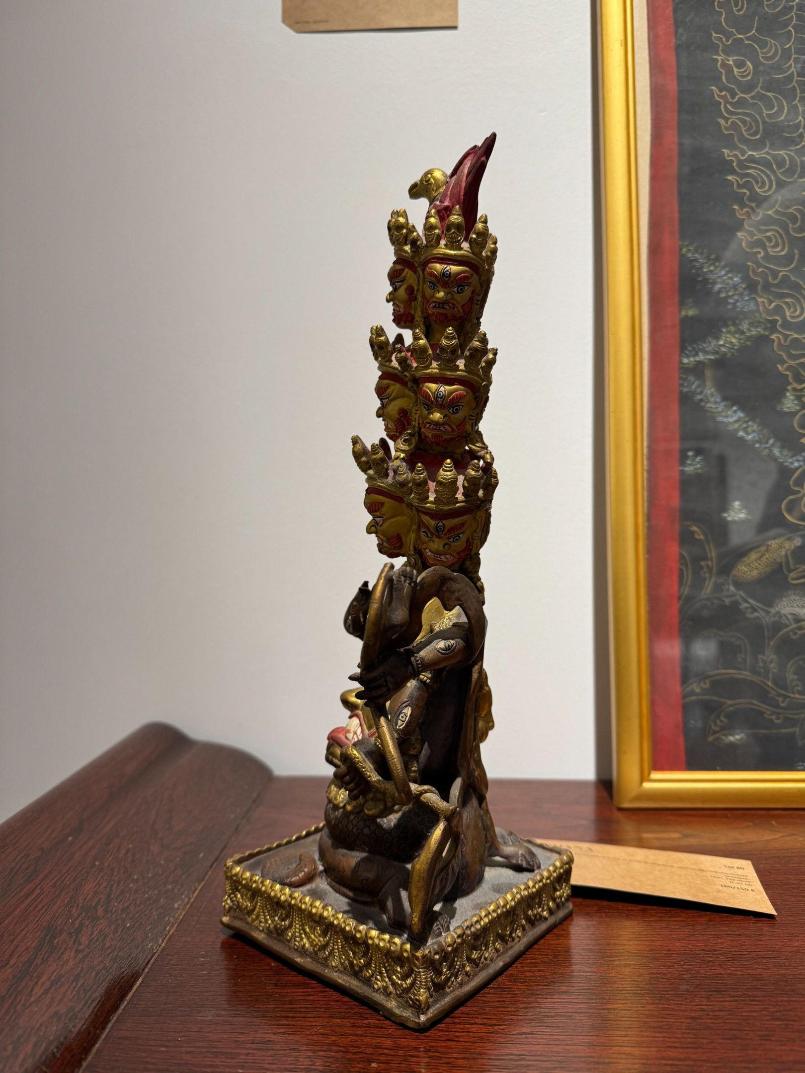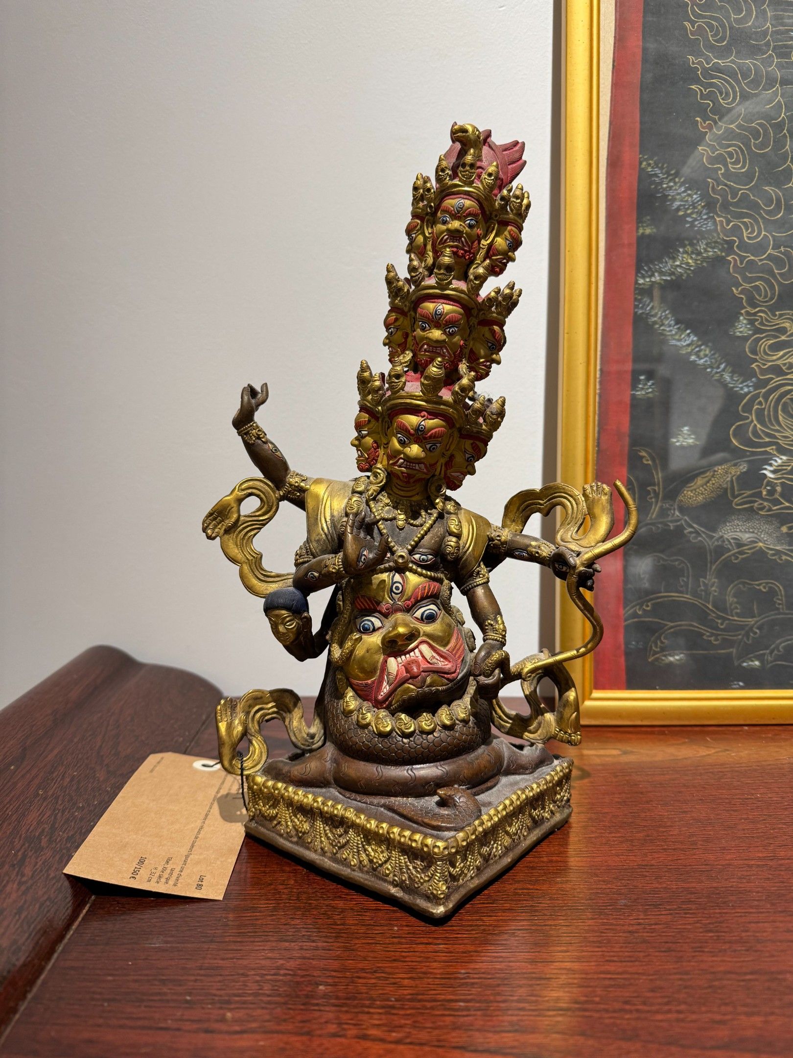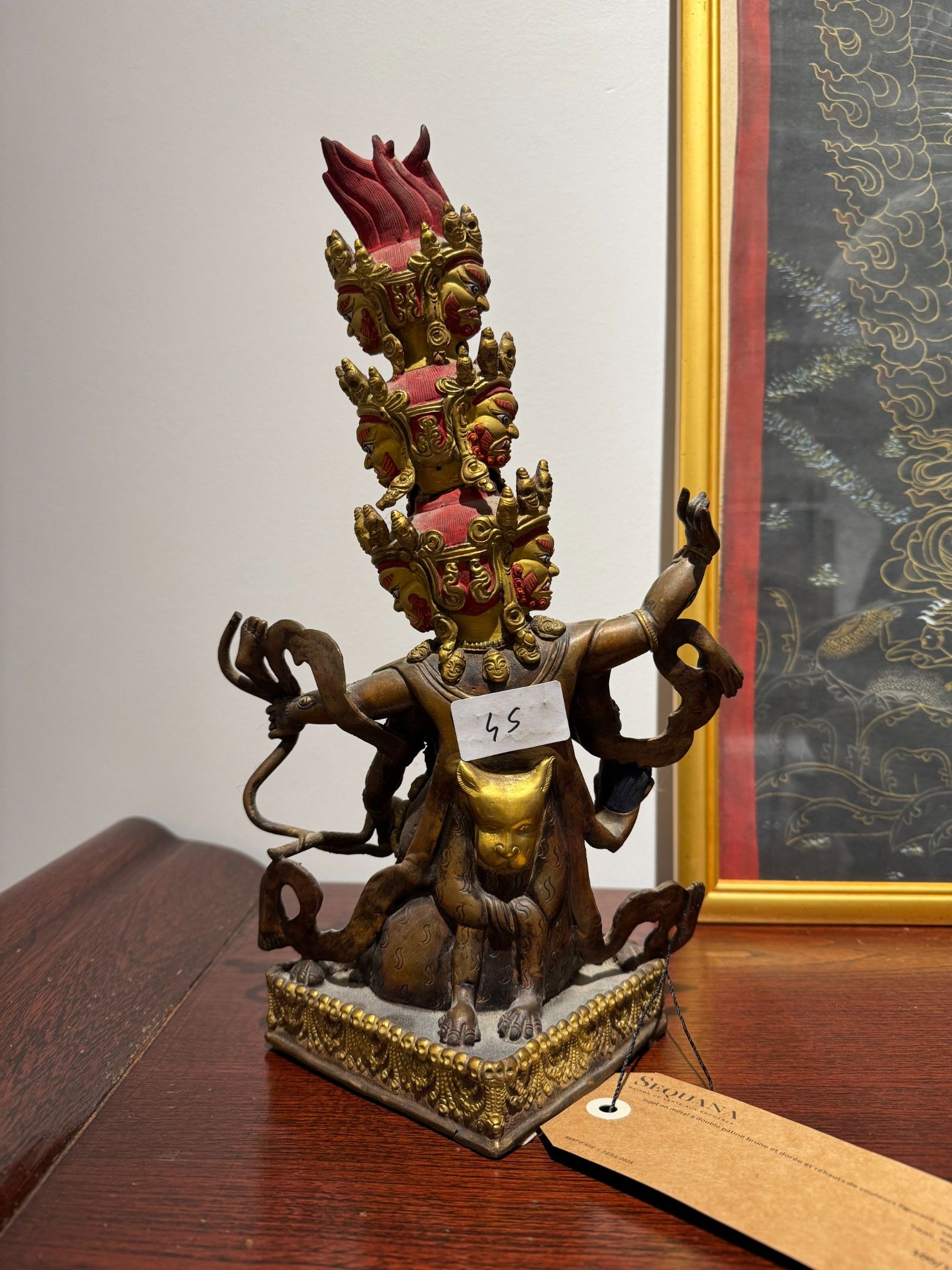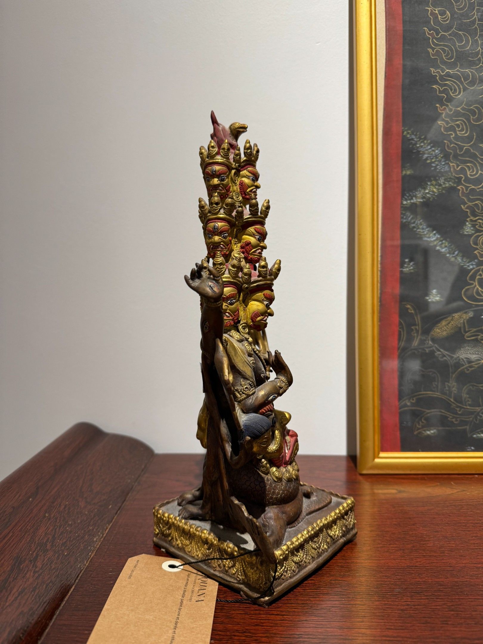 Metal subject with double brown and gold patina and highlights of colour depicting a tantric divinity.