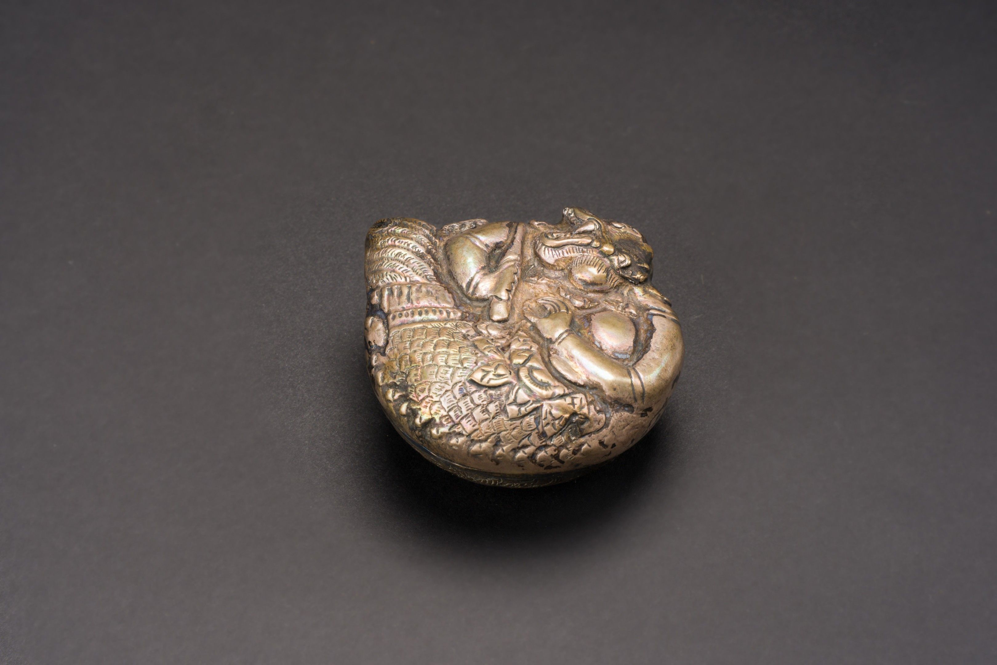 An embossed silver betel nut box depicting the Supha Matcha deity.