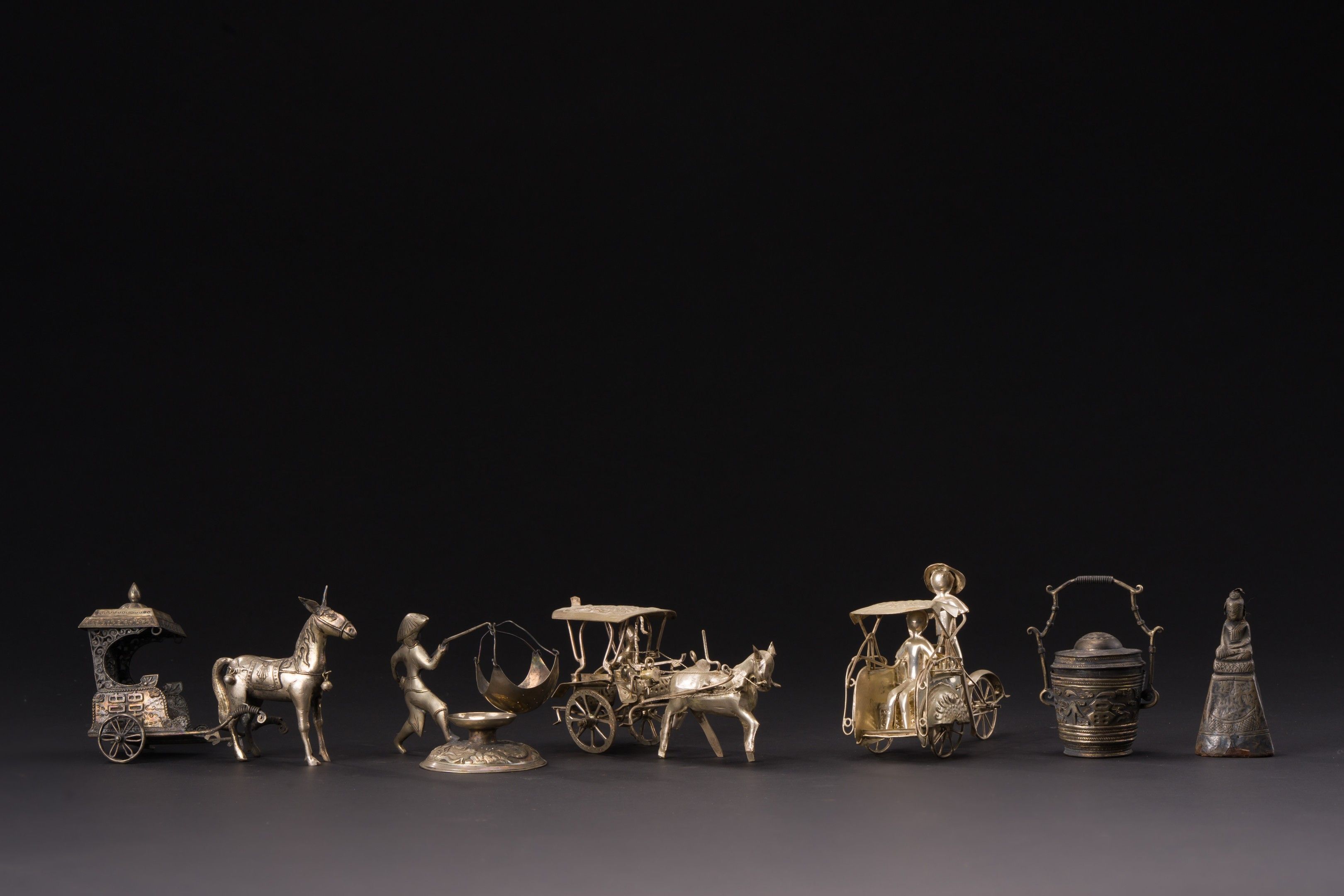 A set of cut and chased metal subjects depicting a cyclo-pousse, a fisherman forming a passe-thé, a horse-drawn carriage, a donkey, a rickshaw, a covered box depicting a cauldron and a Buddha.