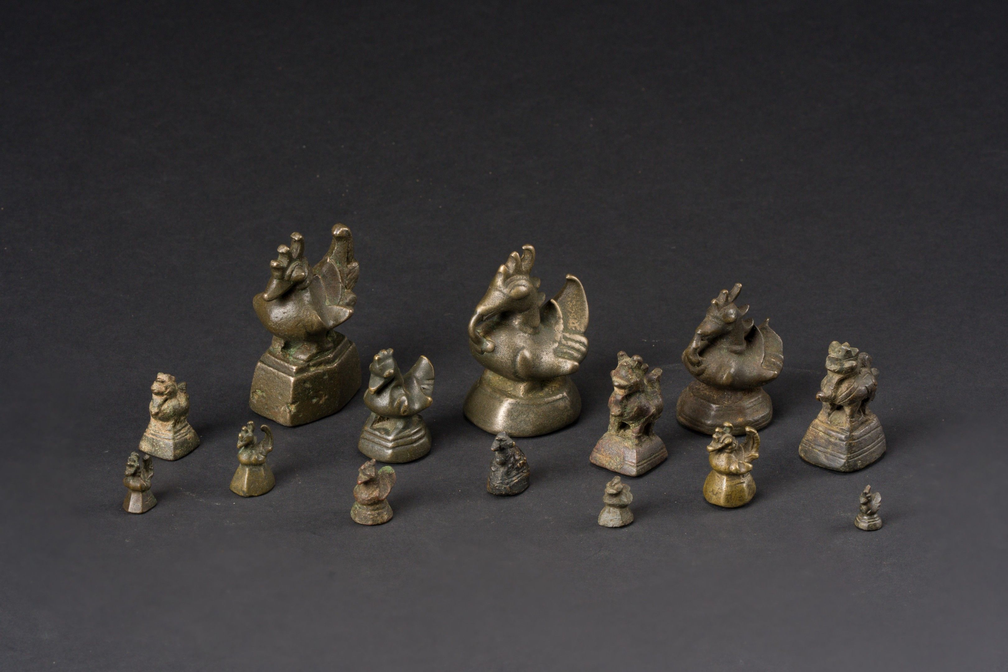 Suite of fourteen patinated bronze opium weights featuring cockerels with protruding crests.