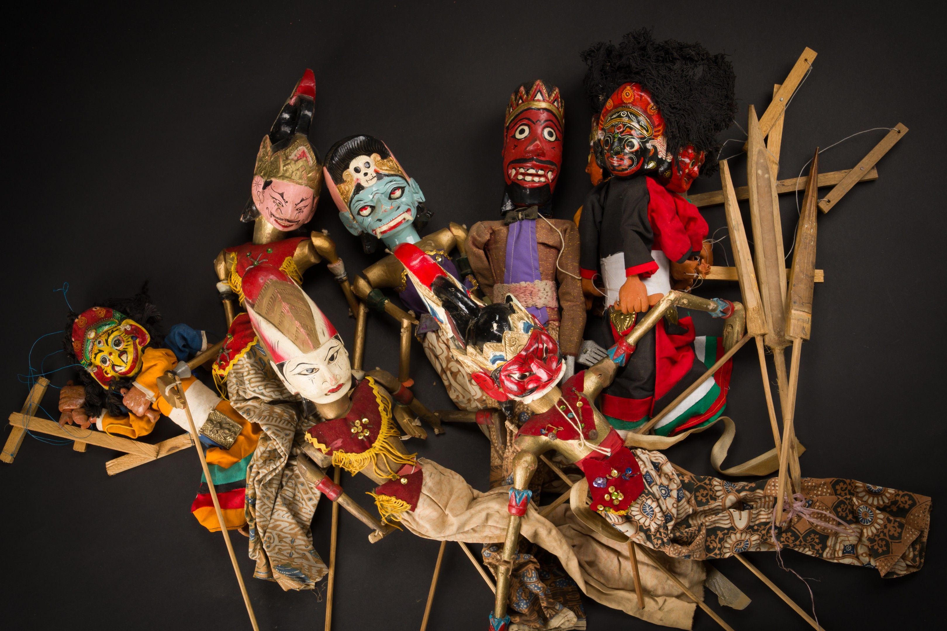 In two handles, Bali or Java, lot comprising two carved polychrome wood and horsehair masks depicting Barong and Rangda, gilded polychrome wood articulated puppets and fabric.