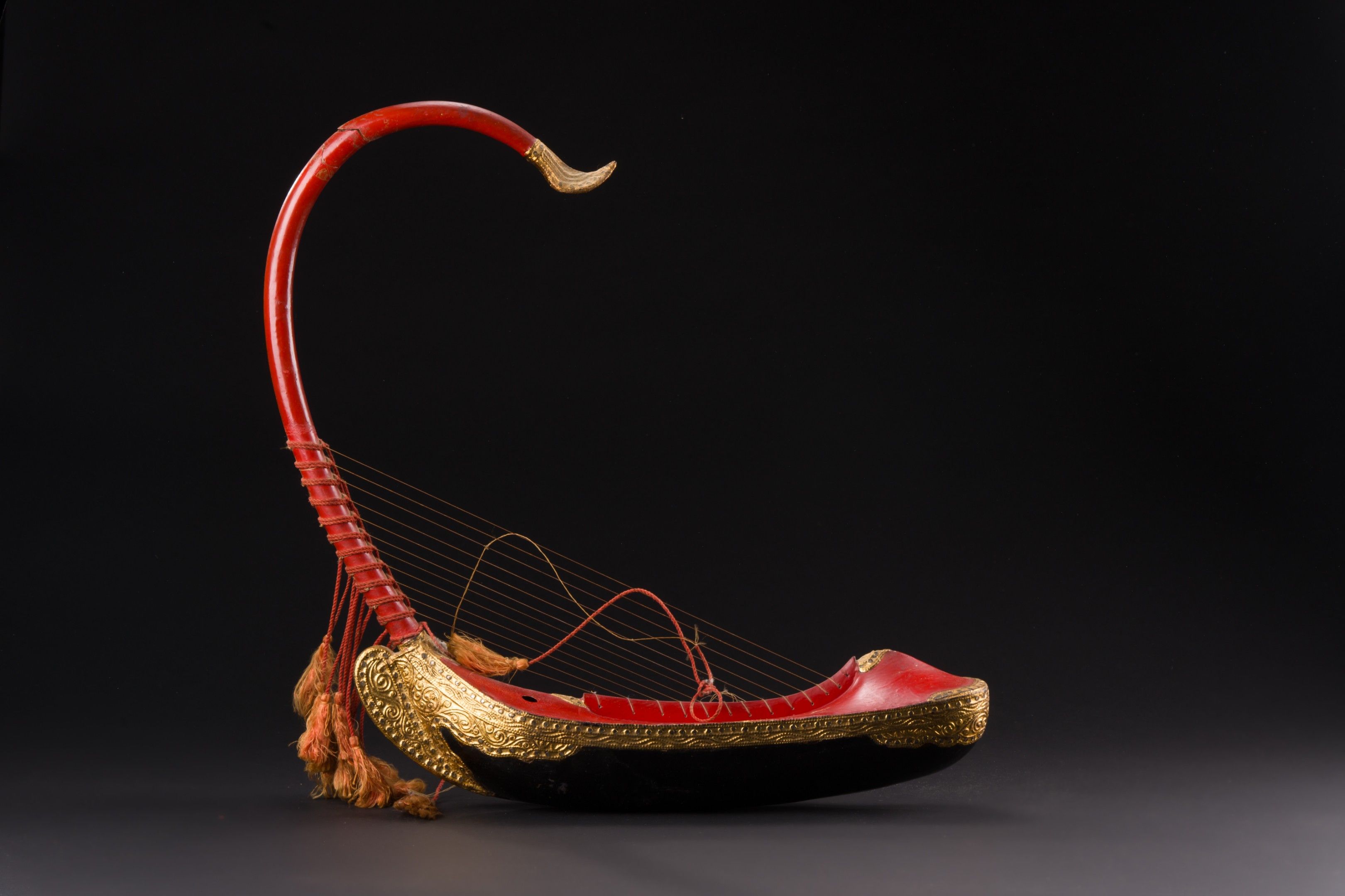 Lacquered and gilded wooden "saung-gauk" bowed harp decorated with fringes ending in tassels.
