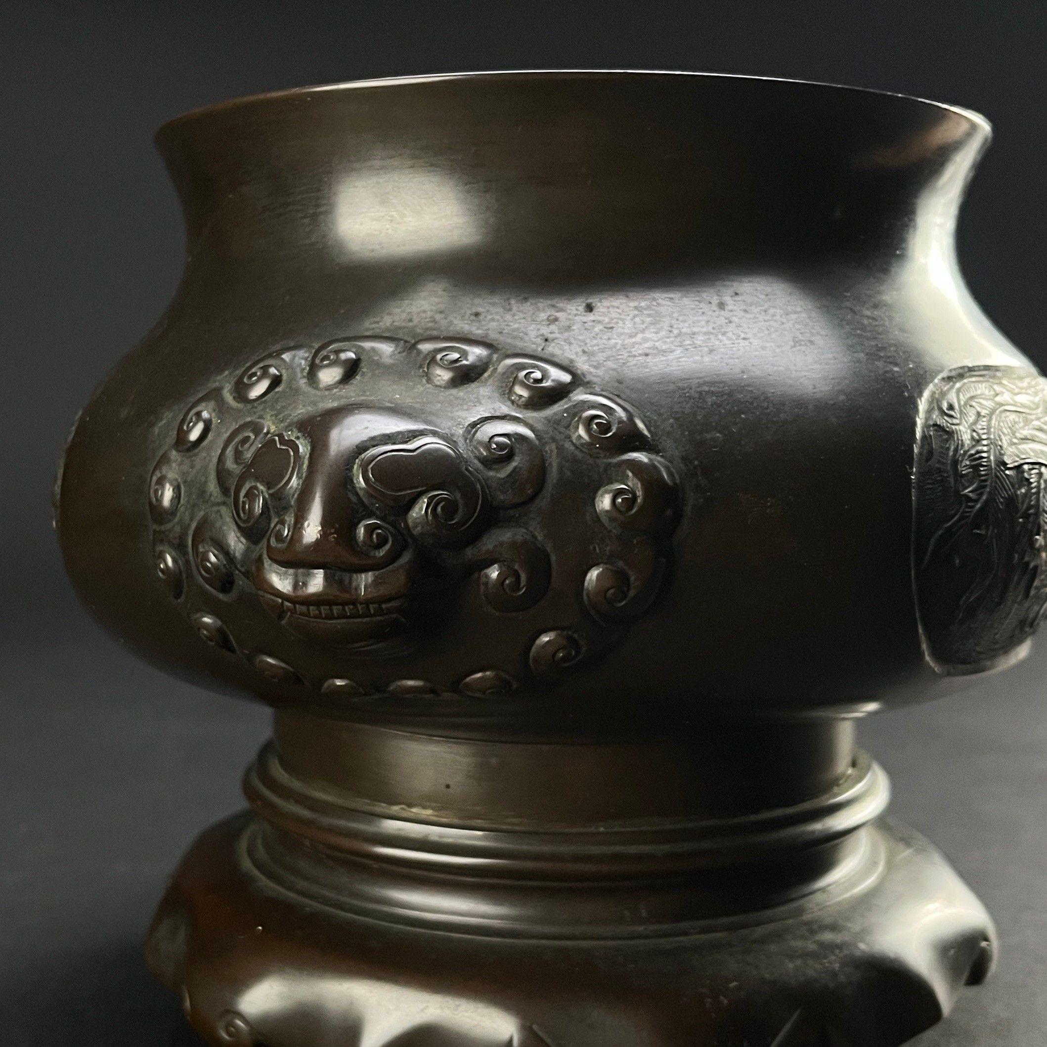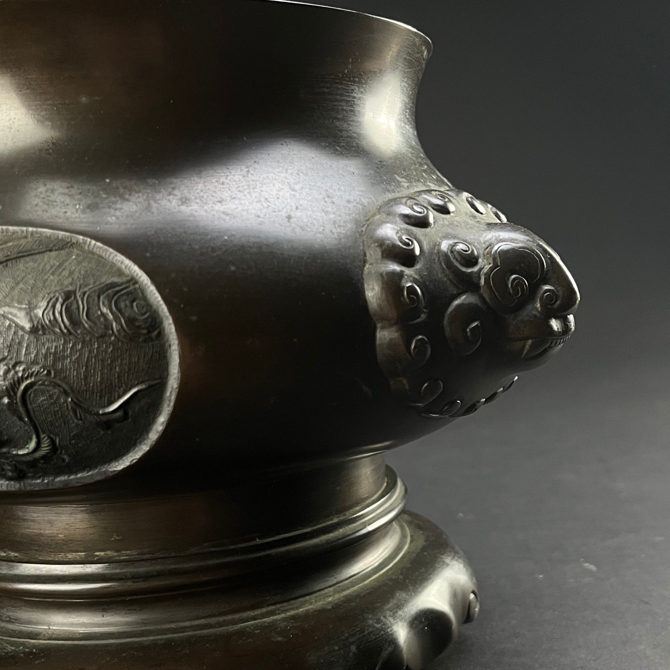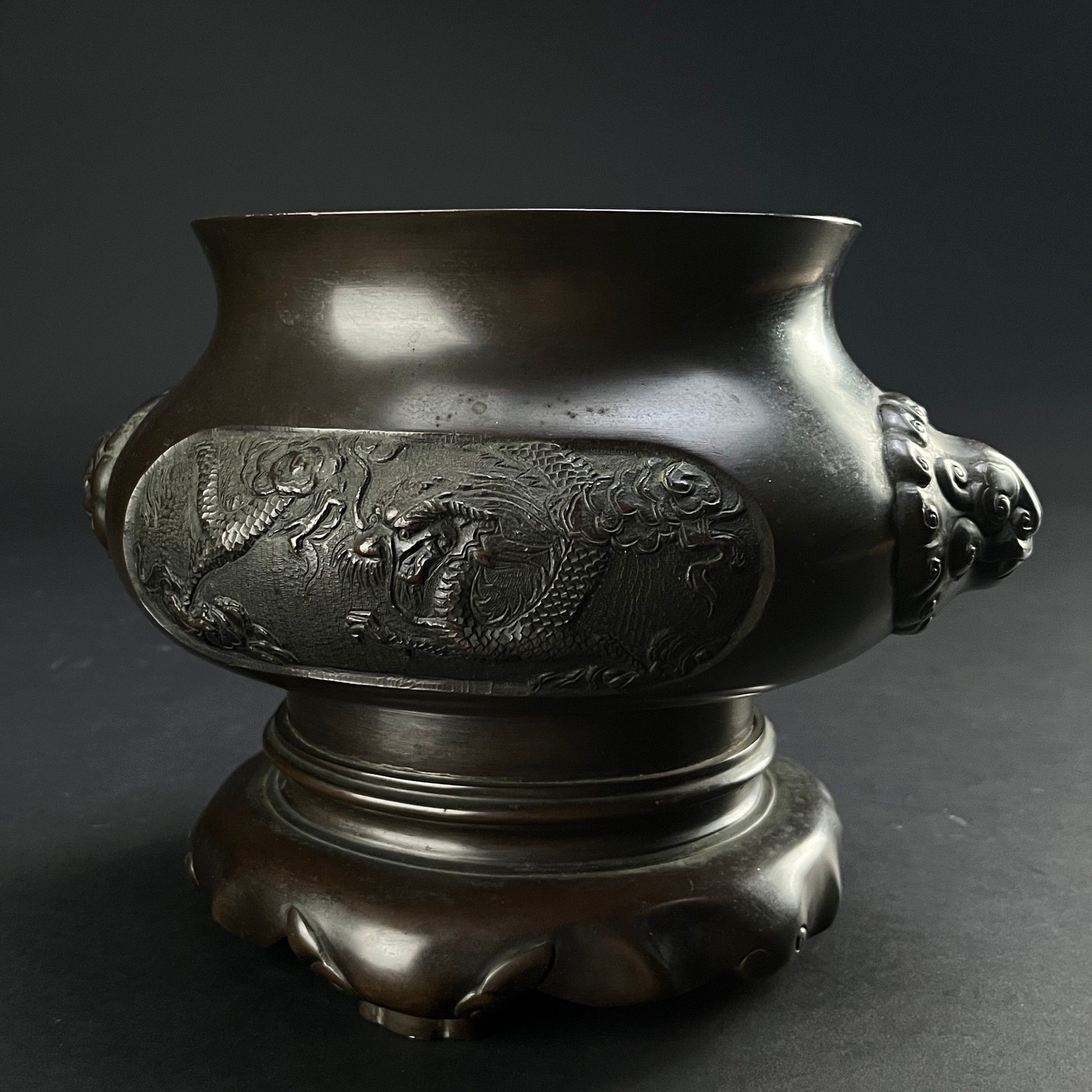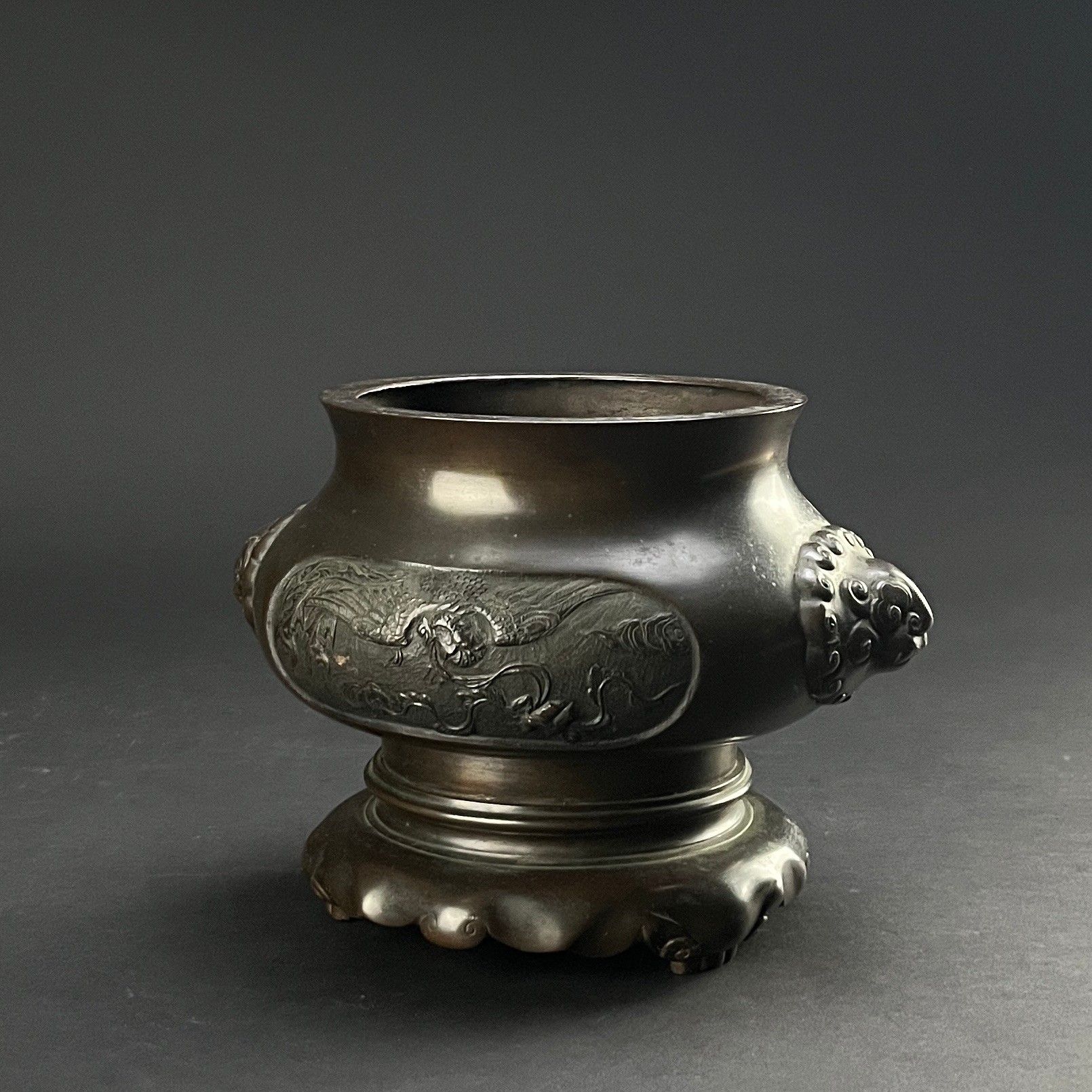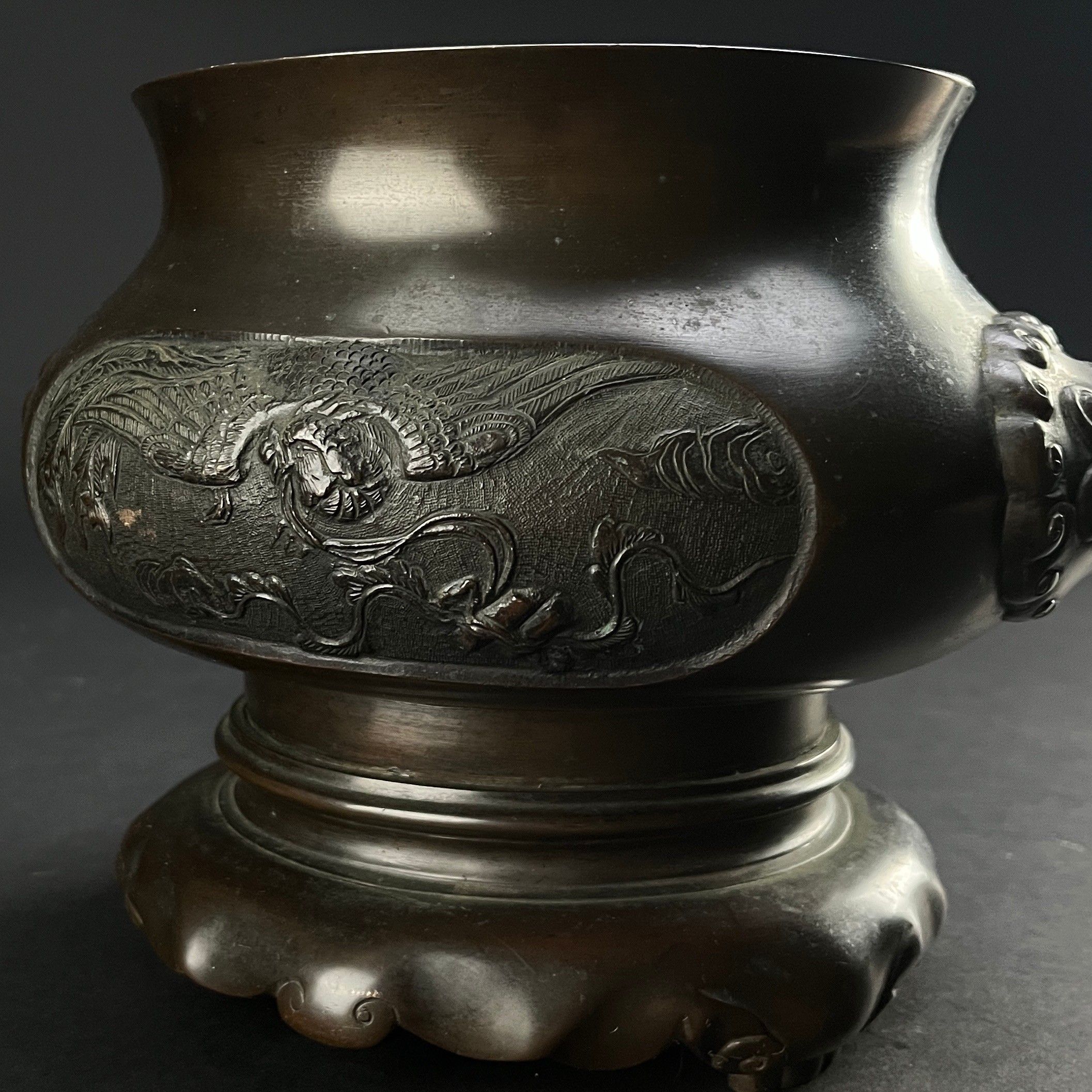 A bronze perfume burner with a brown patina, flanked by two fantastic snapdragons and chased in reserve with a dragon chasing the pearl and a phoenix.