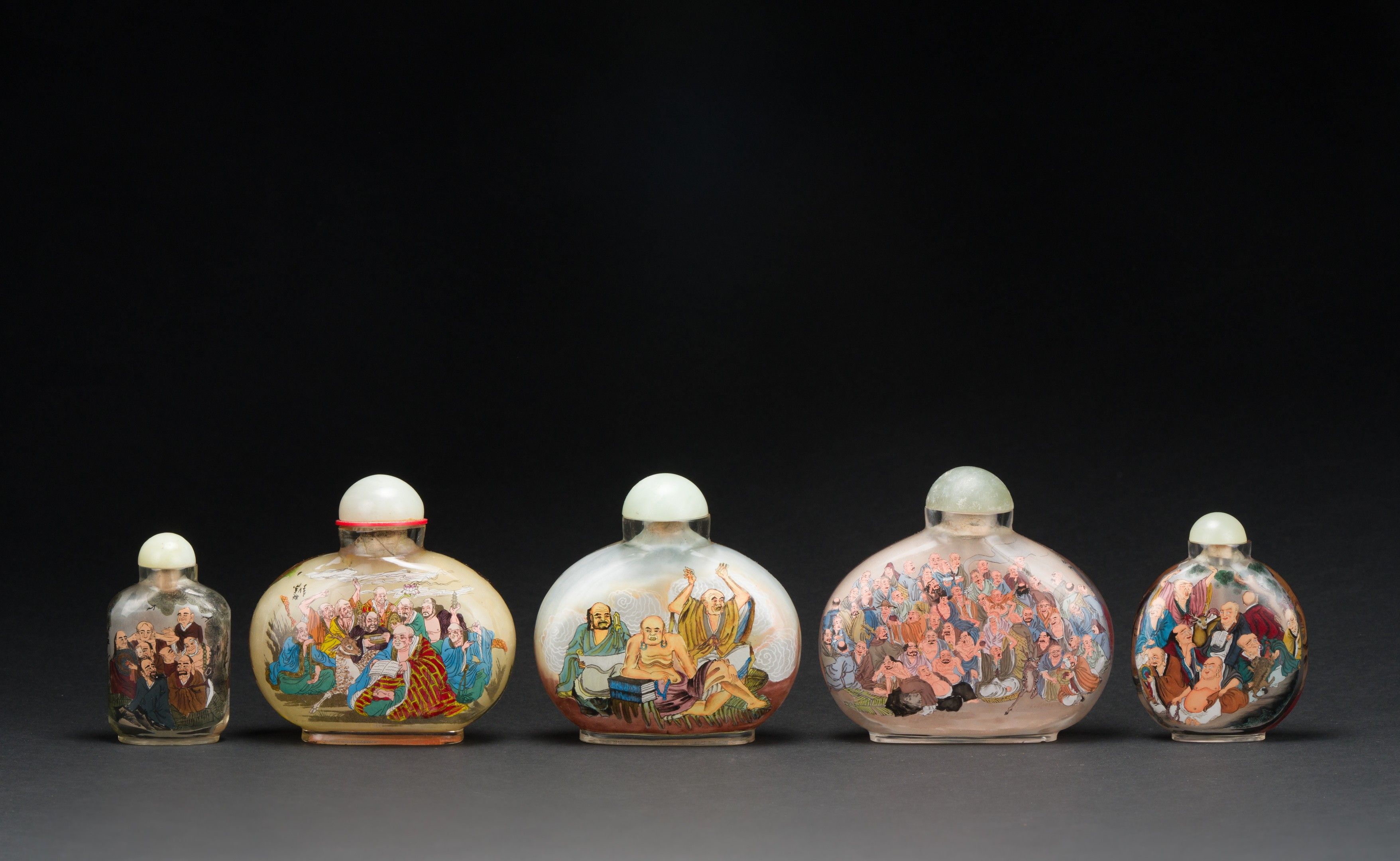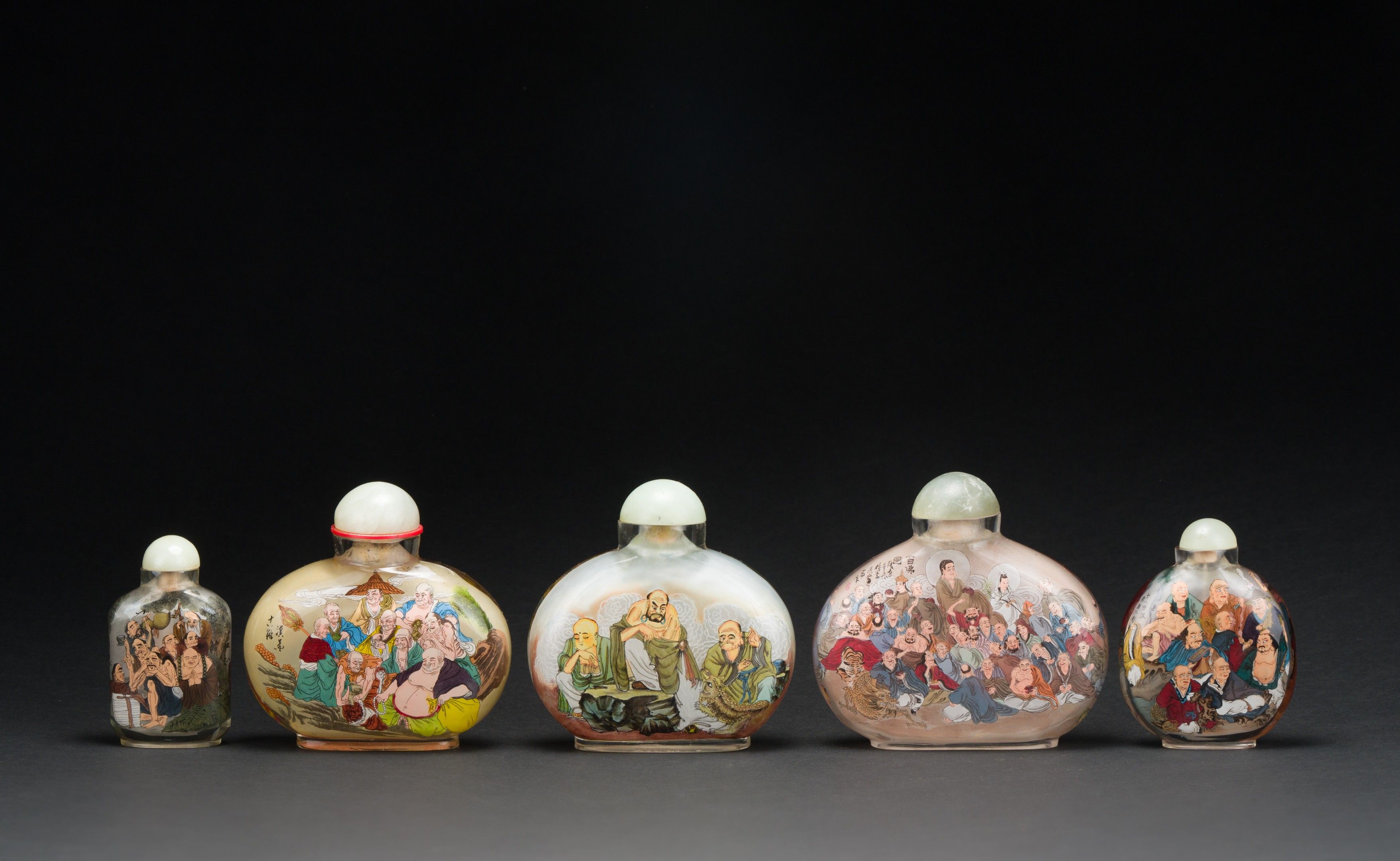 A set of five flat oval or rectangular glass snuffboxes with painted interior decoration of male gathering scenes, including "Eighteen Arhats". One is inscribed "Yang Jianwei". With hard stone stoppers.