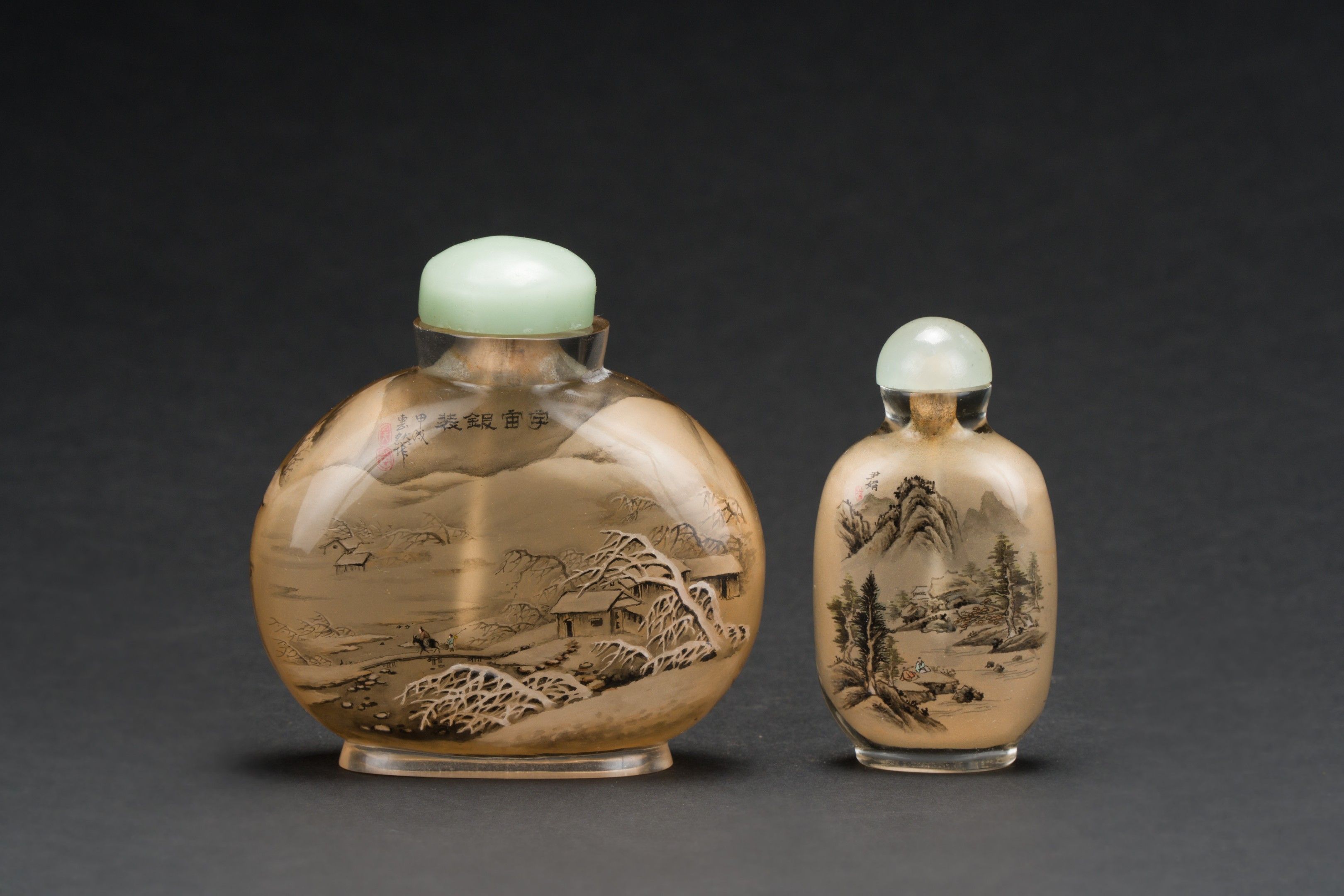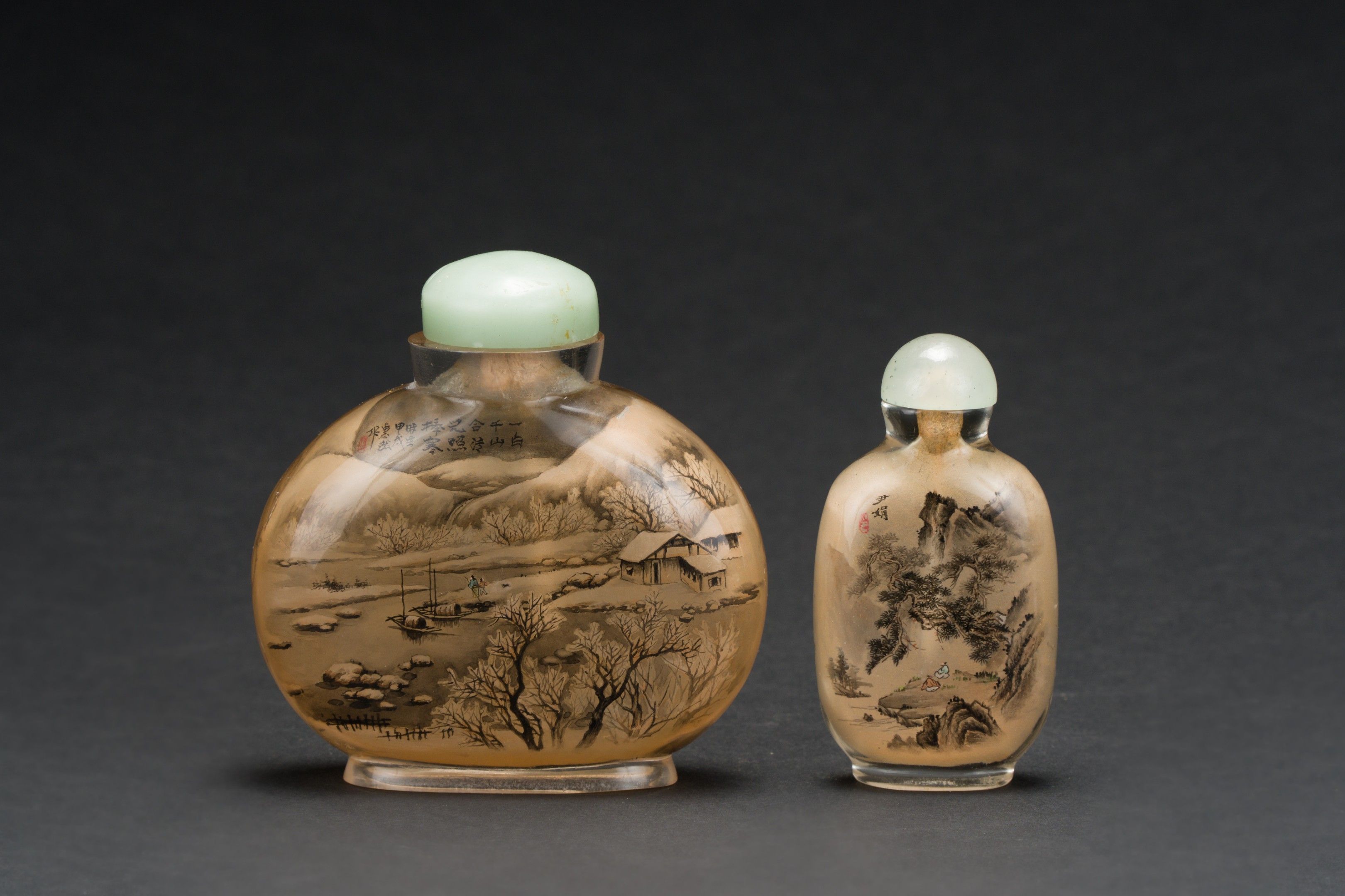 Set of two oval or rectangular flat glass snuffboxes with painted interior decoration of mountain landscapes. With hard stone stoppers.