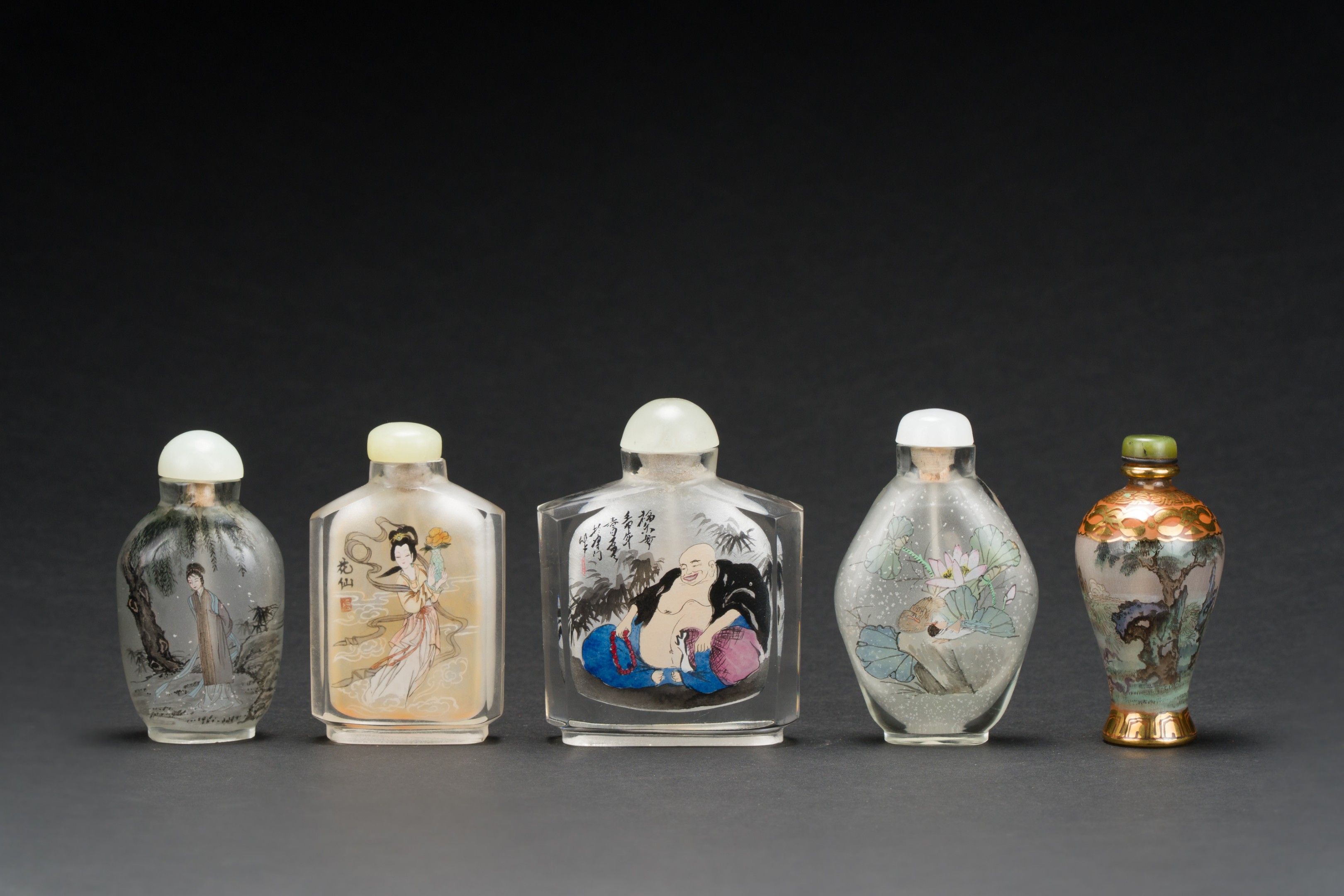 Set of five oval, square or rectangular flat glass snuffboxes with painted interior decoration of women, including a flower fairy. With hard stone stoppers.