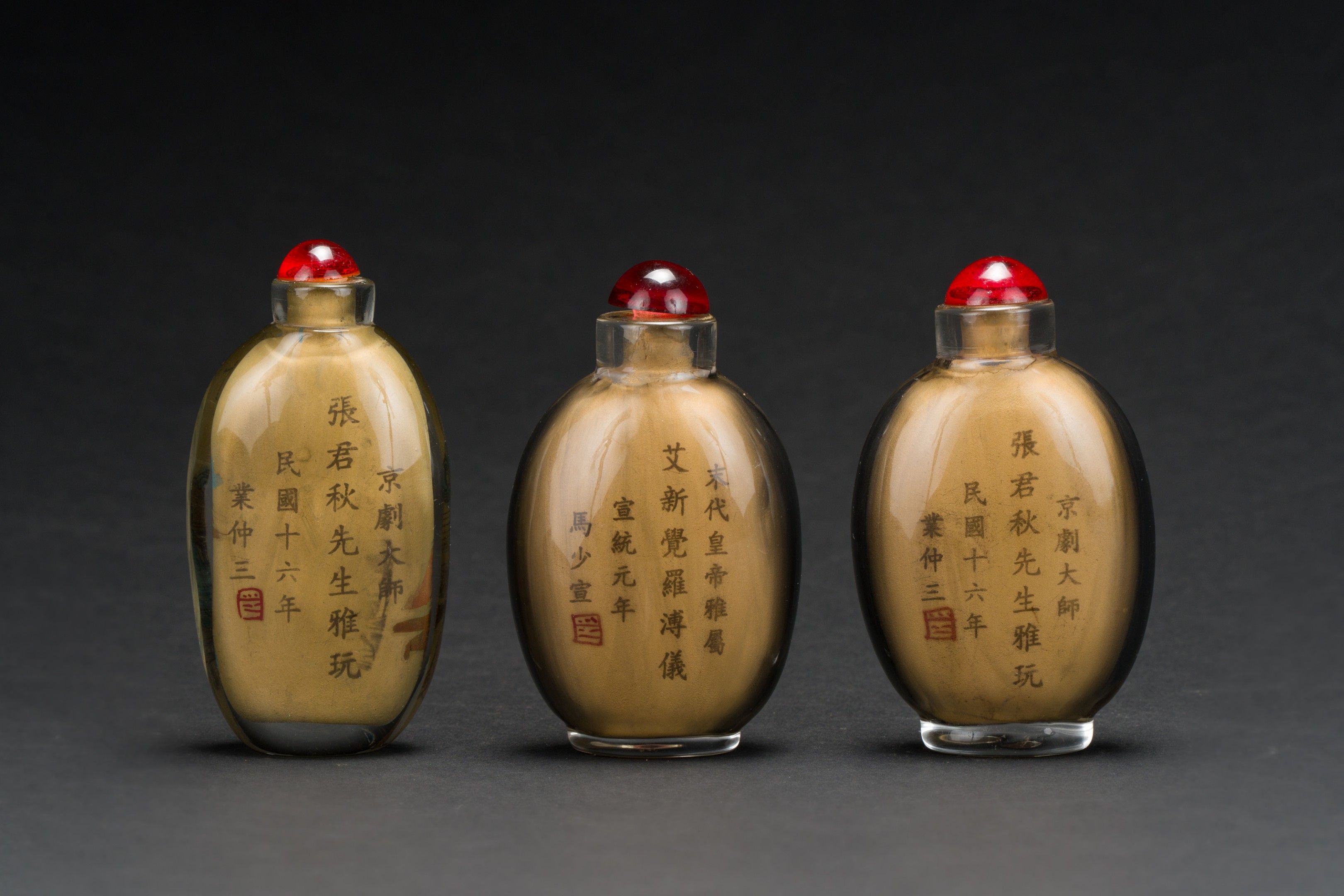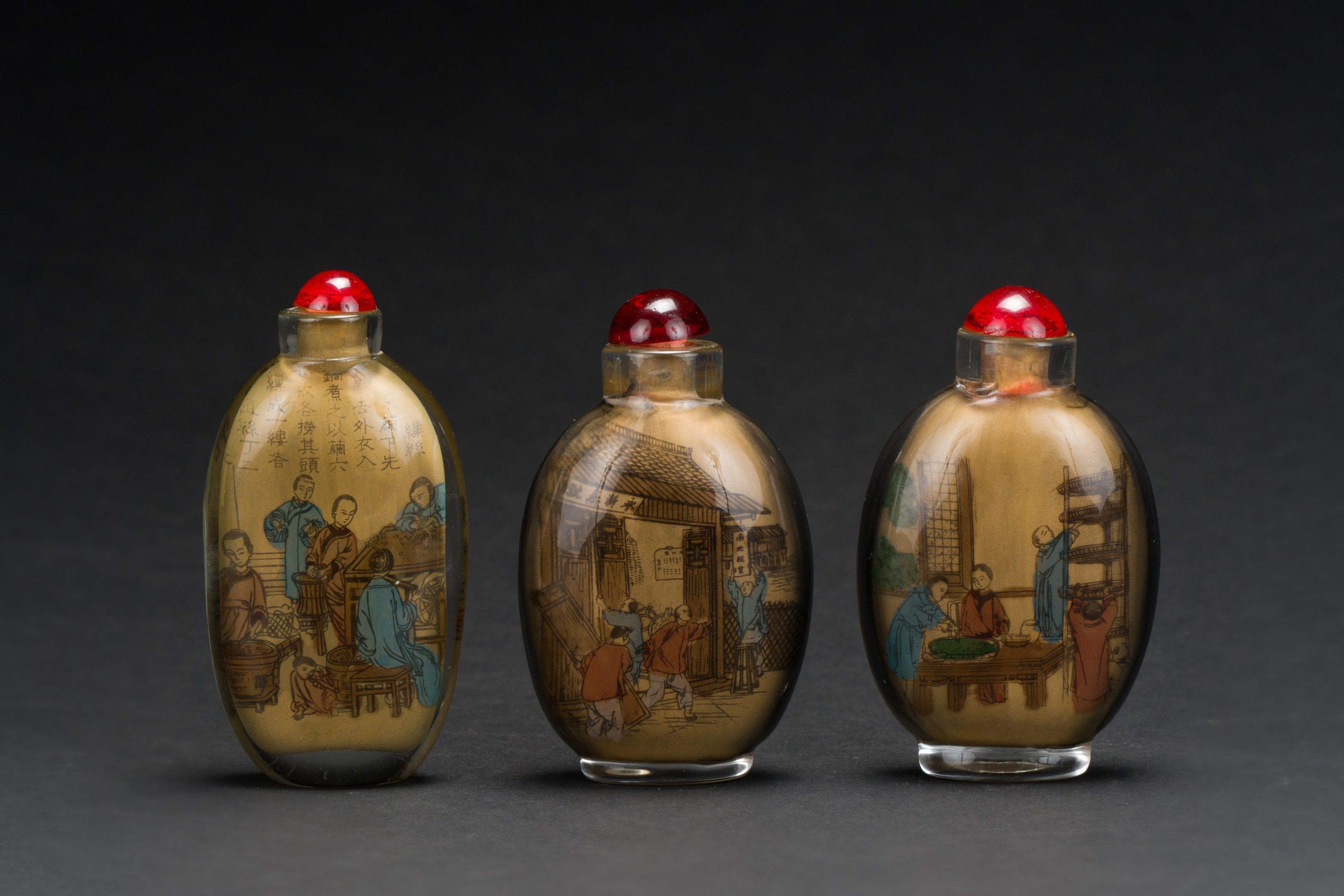 Set of three oval-shaped glass snuffboxes with printed interior decoration of animated scenes with characters. With red plastic stoppers.