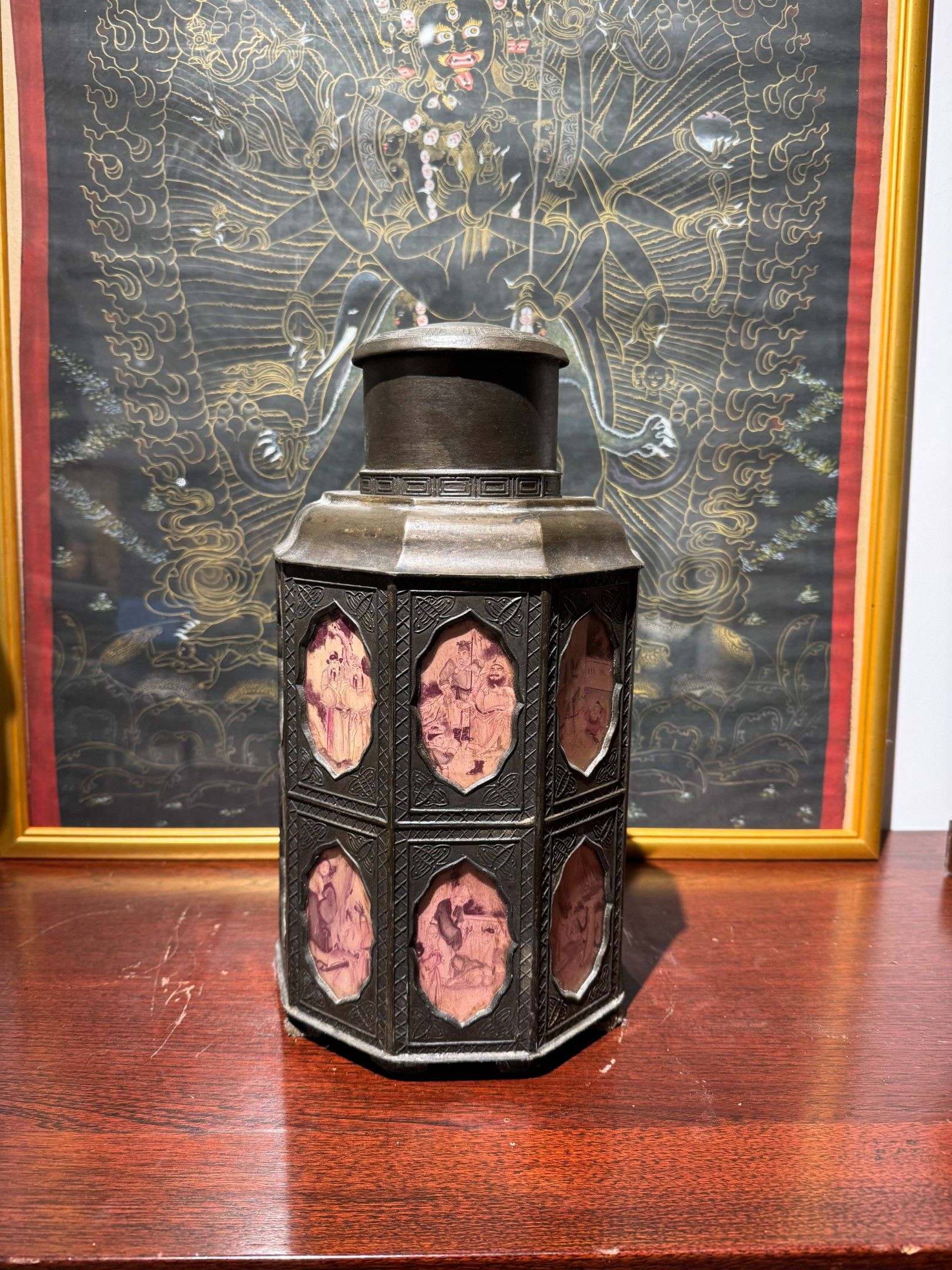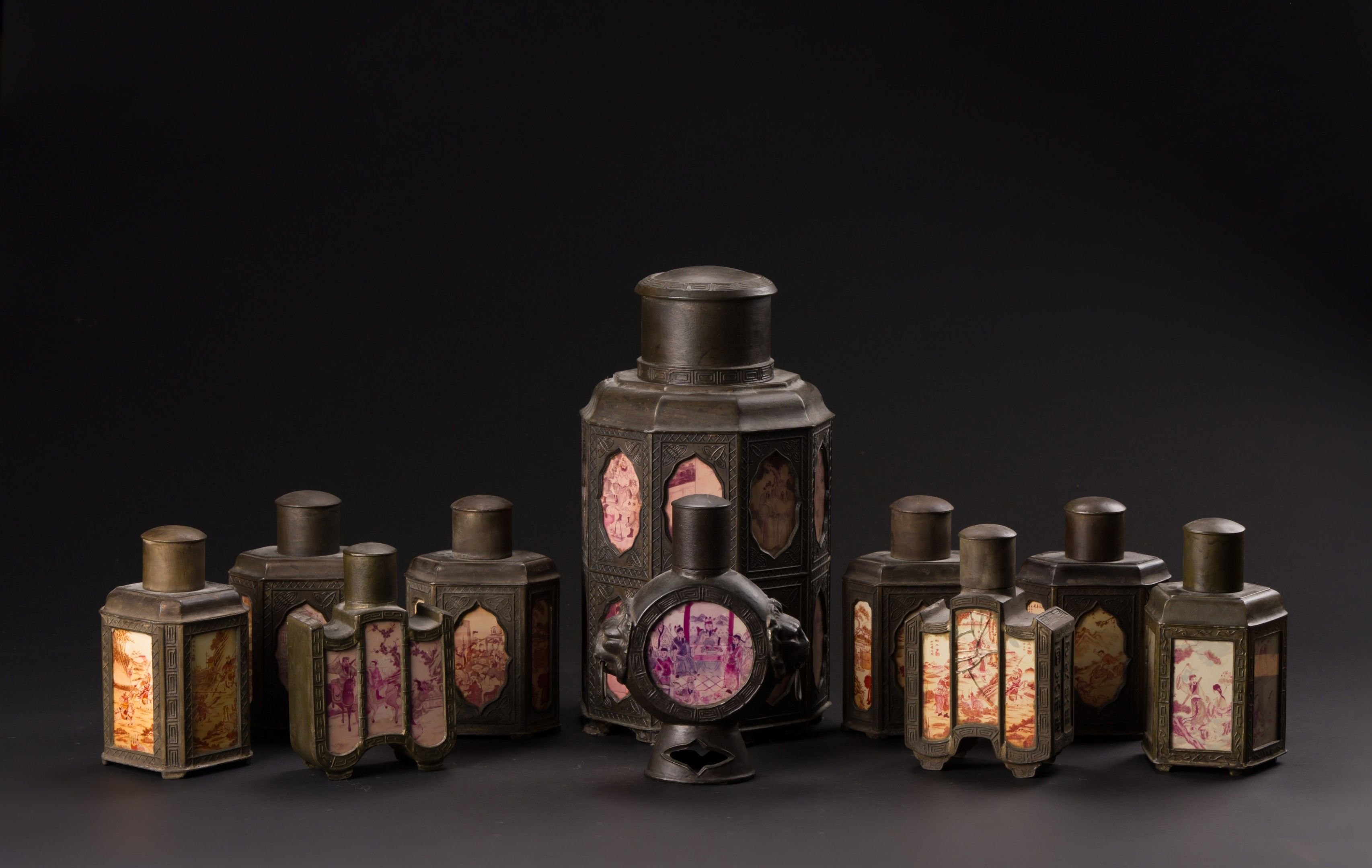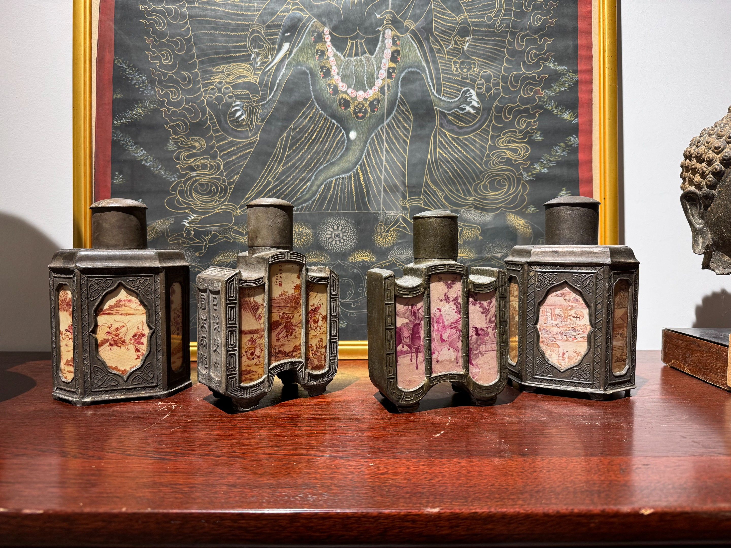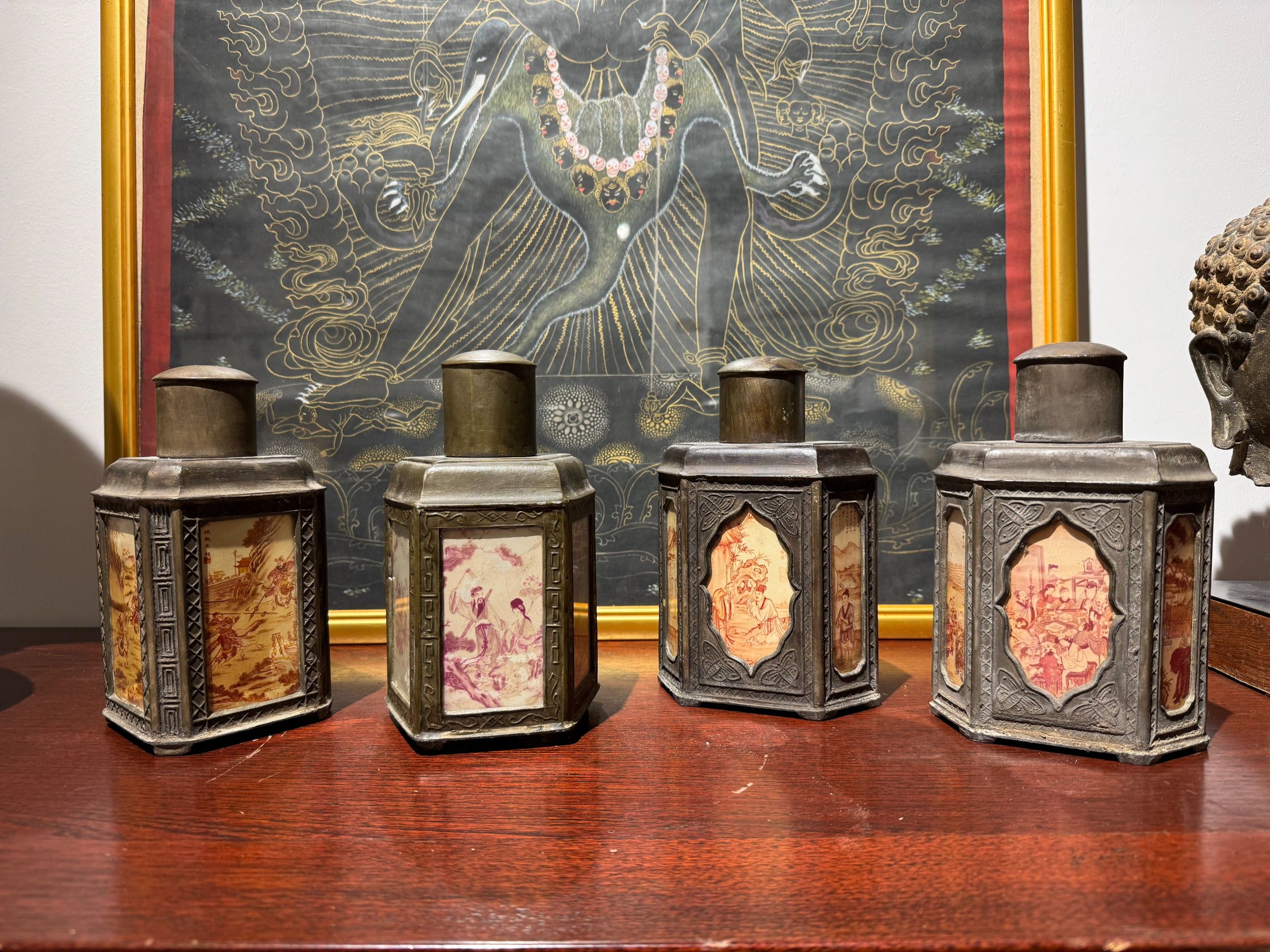 In a handle, China, set of patinated metal tea jars decorated with animated scenes.