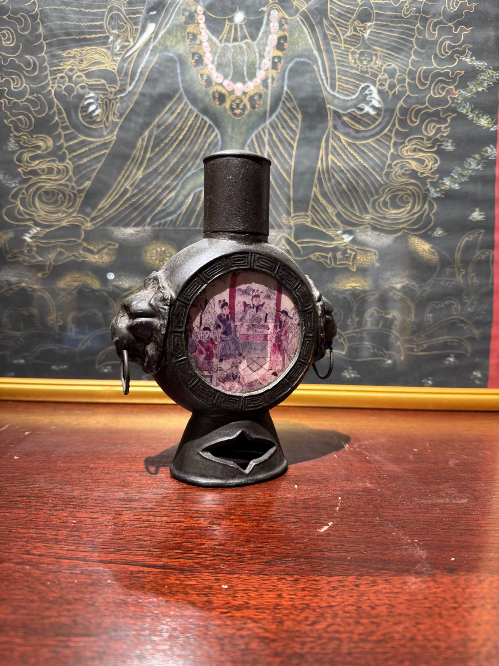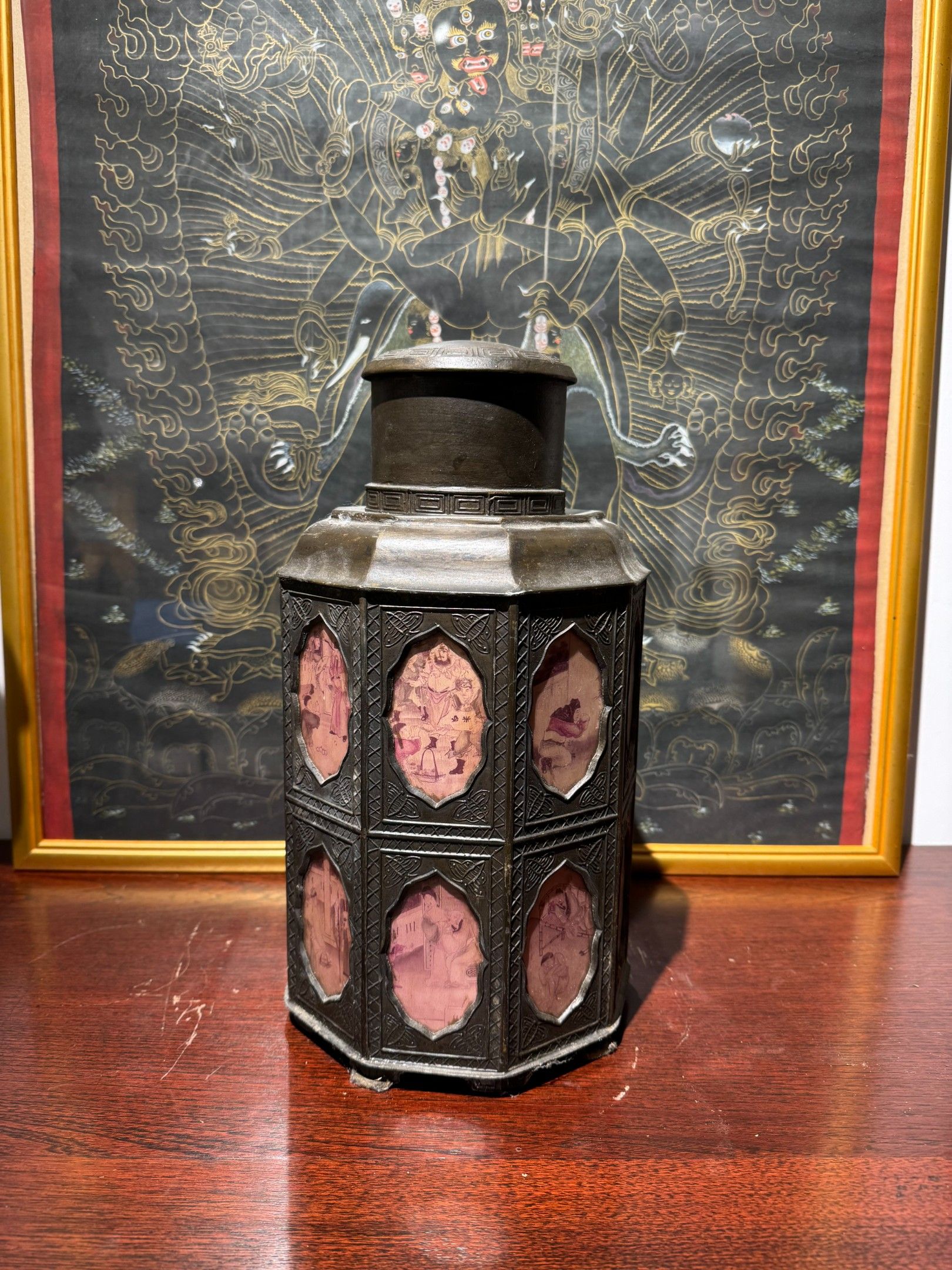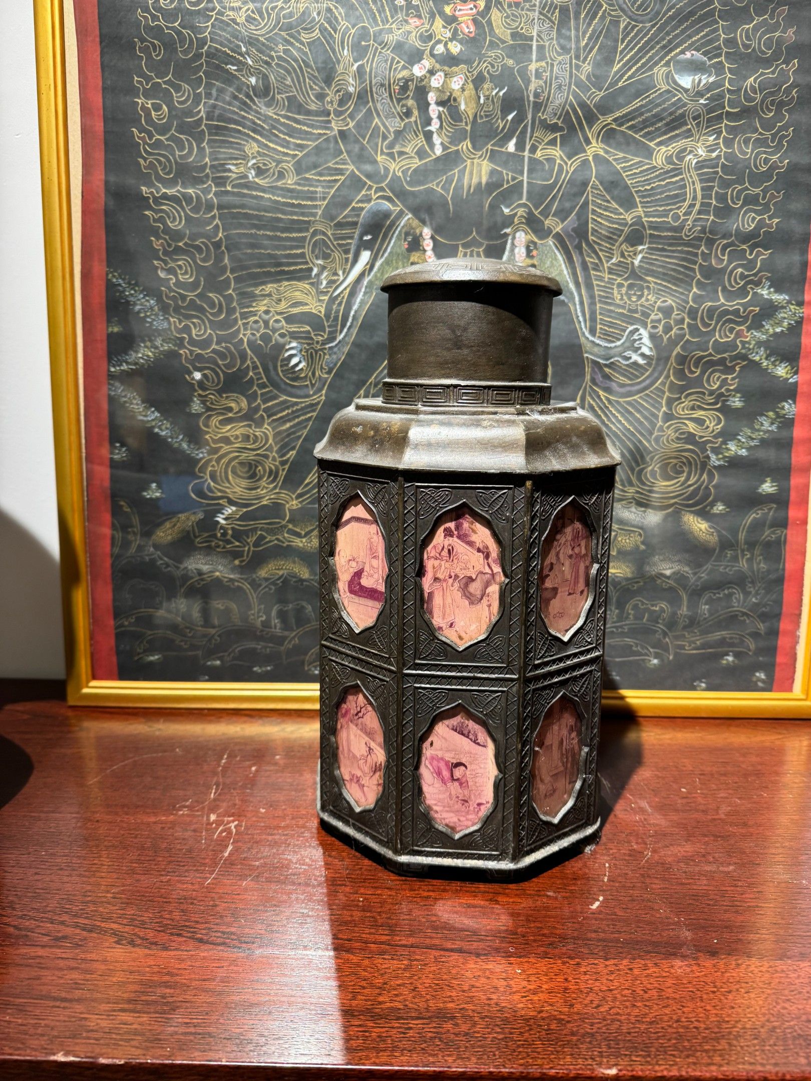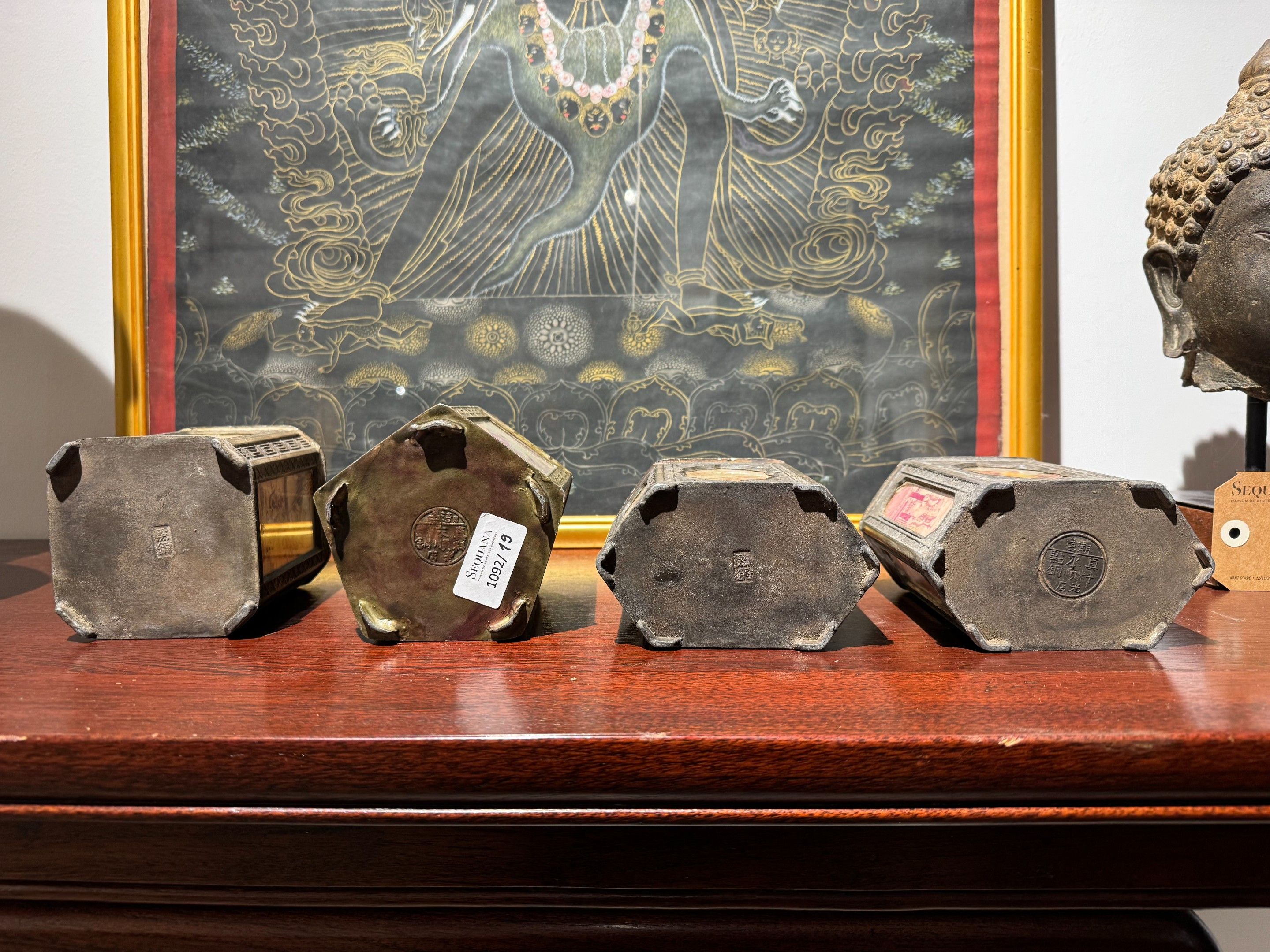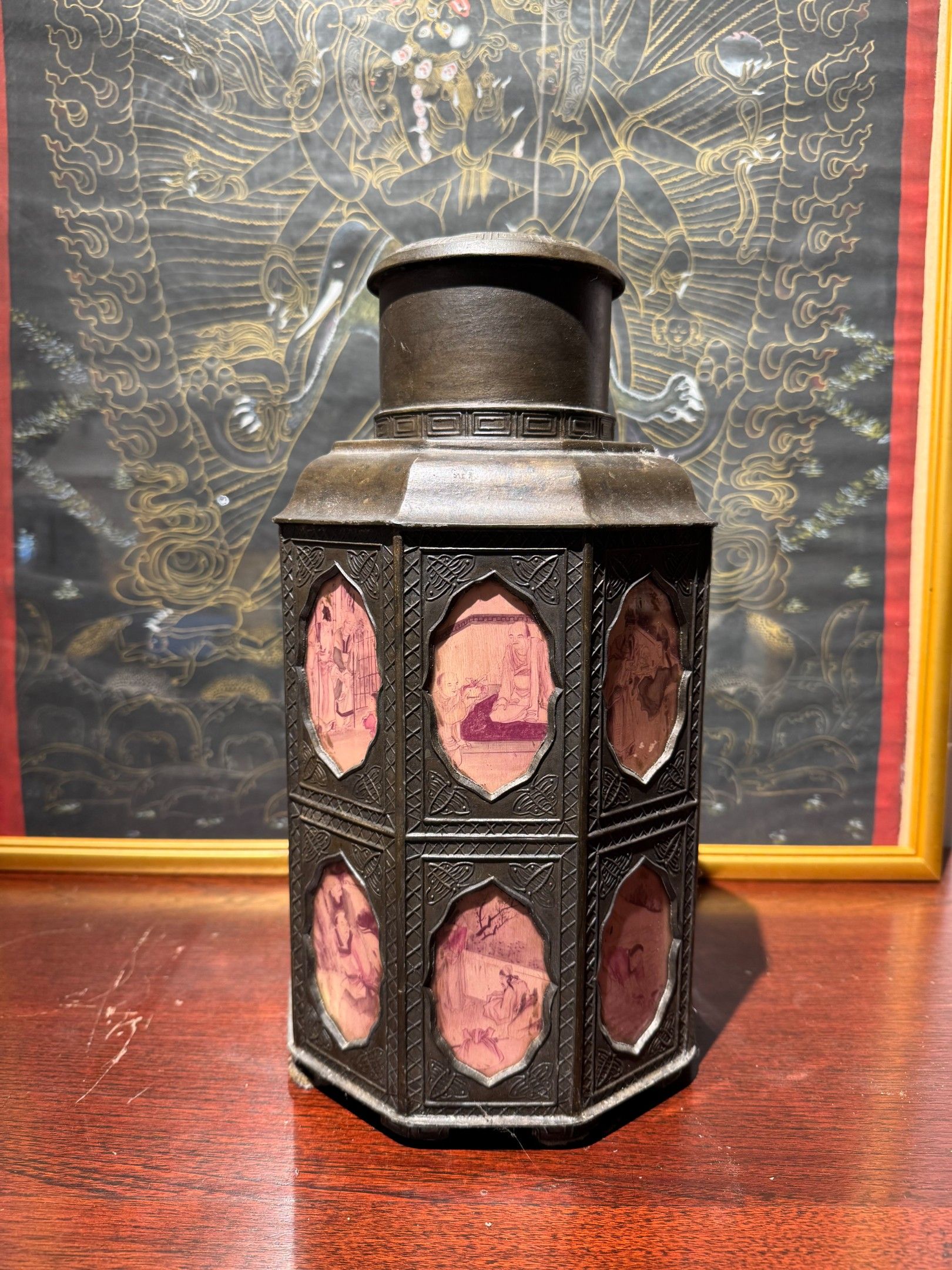 In a handle, China, set of patinated metal tea jars decorated with animated scenes.