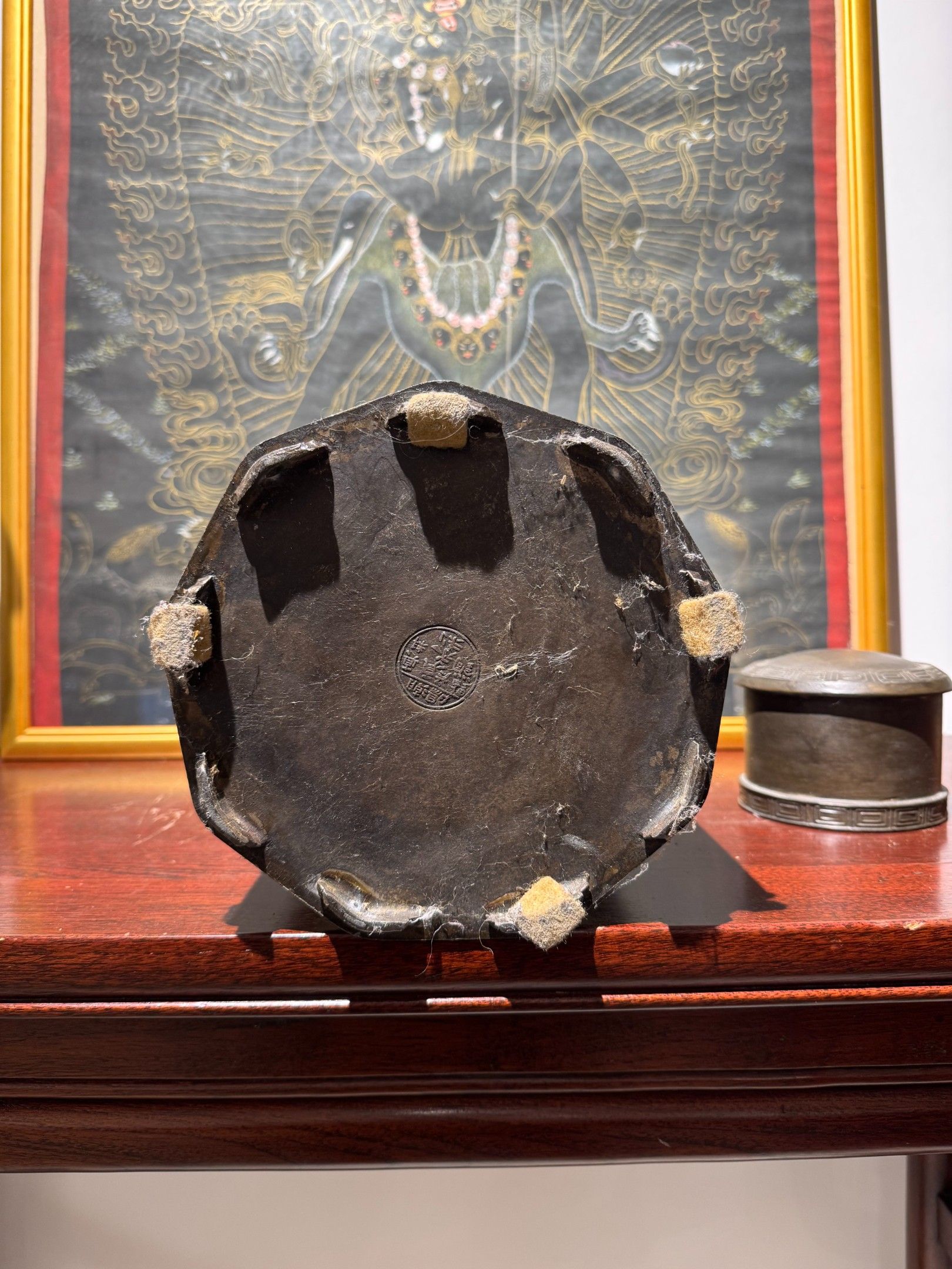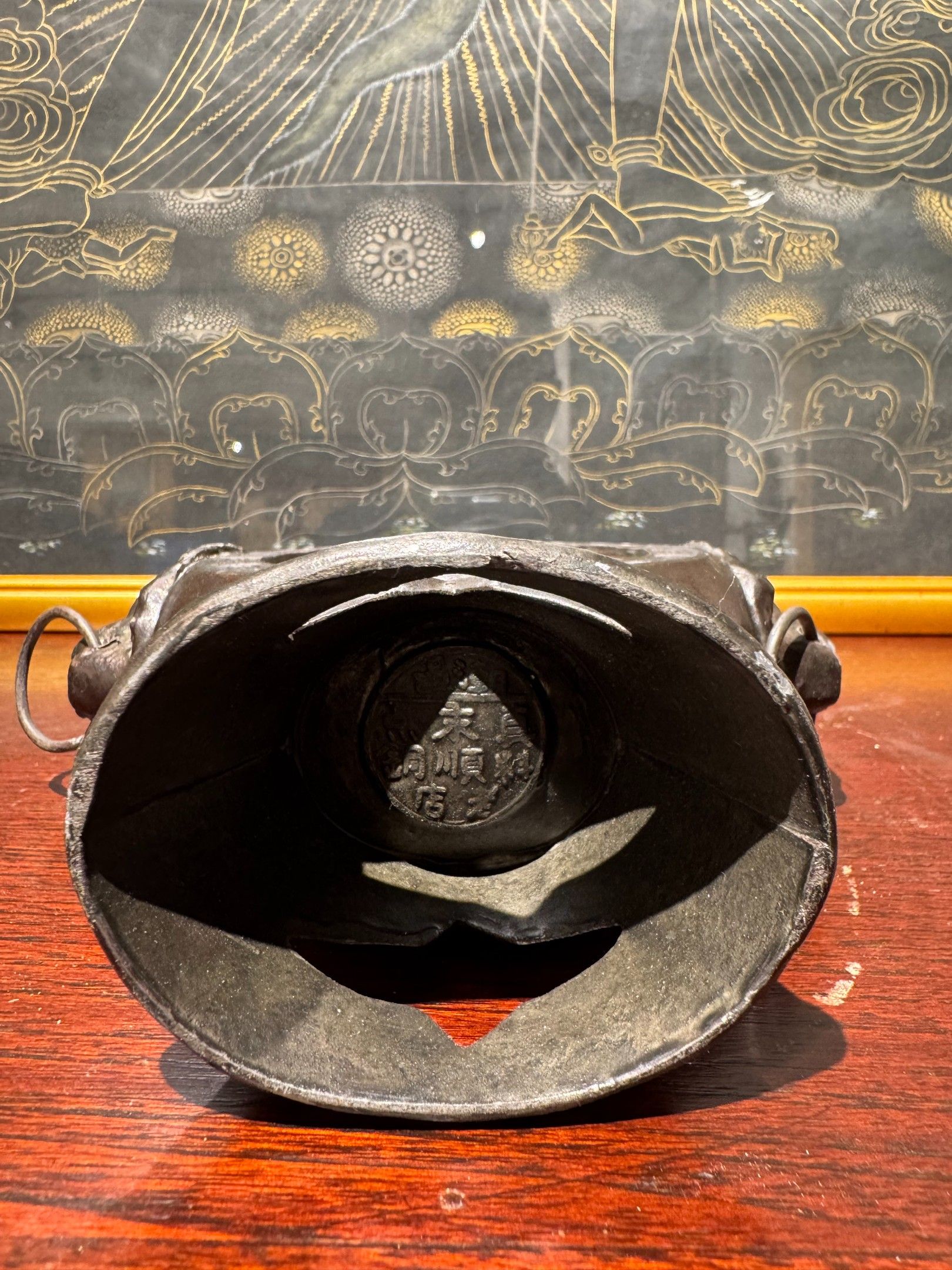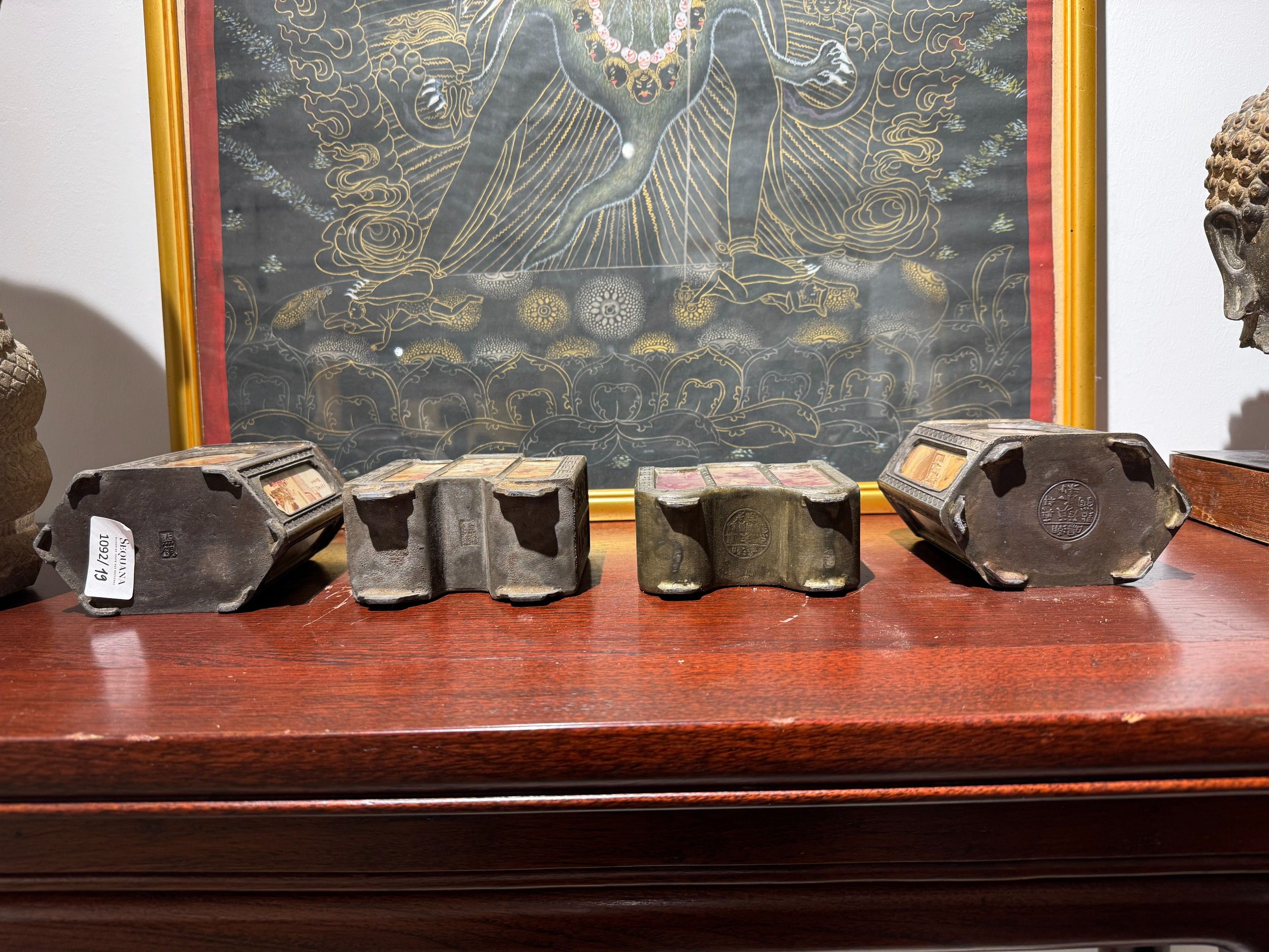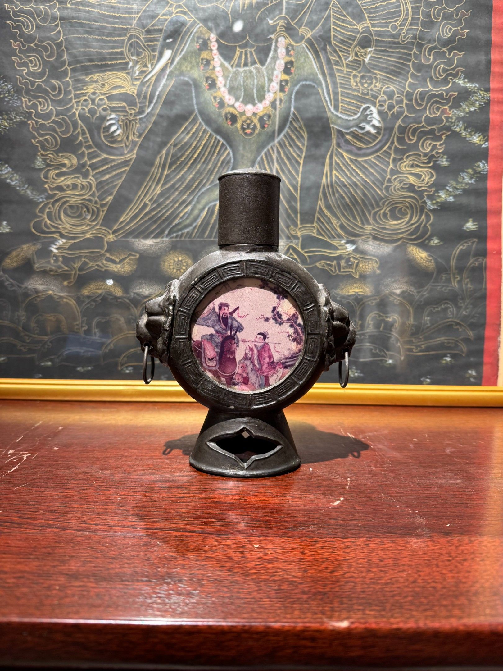 In a handle, China, set of patinated metal tea jars decorated with animated scenes.