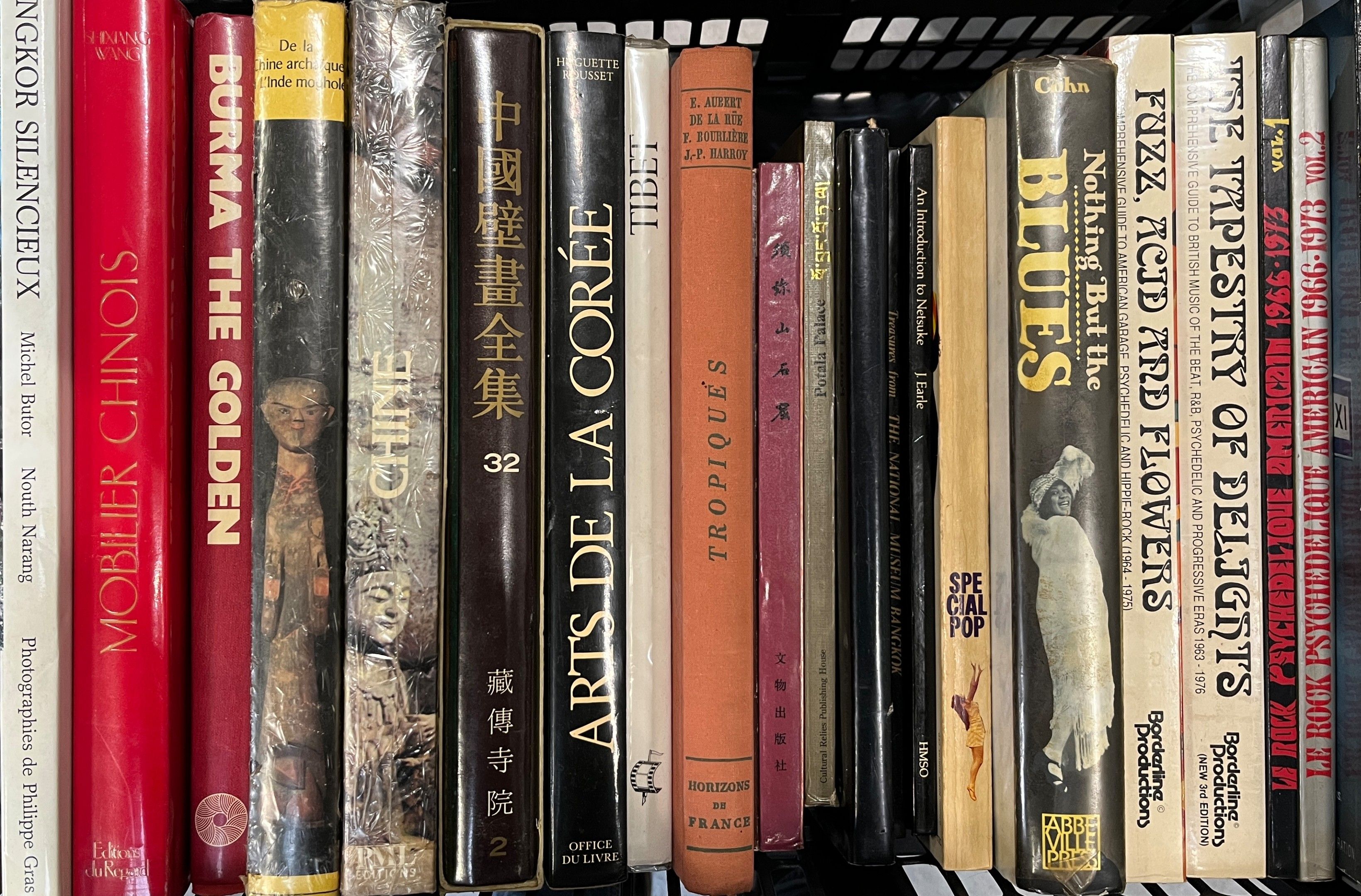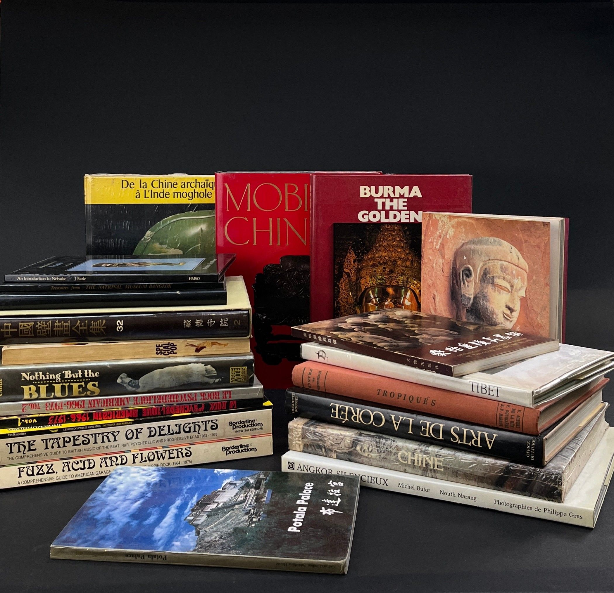 In a handle, set of bound or paperback books, travel, fine arts and music including Tibet, China, India, Japan, South-East Asia and American music and miscellaneous