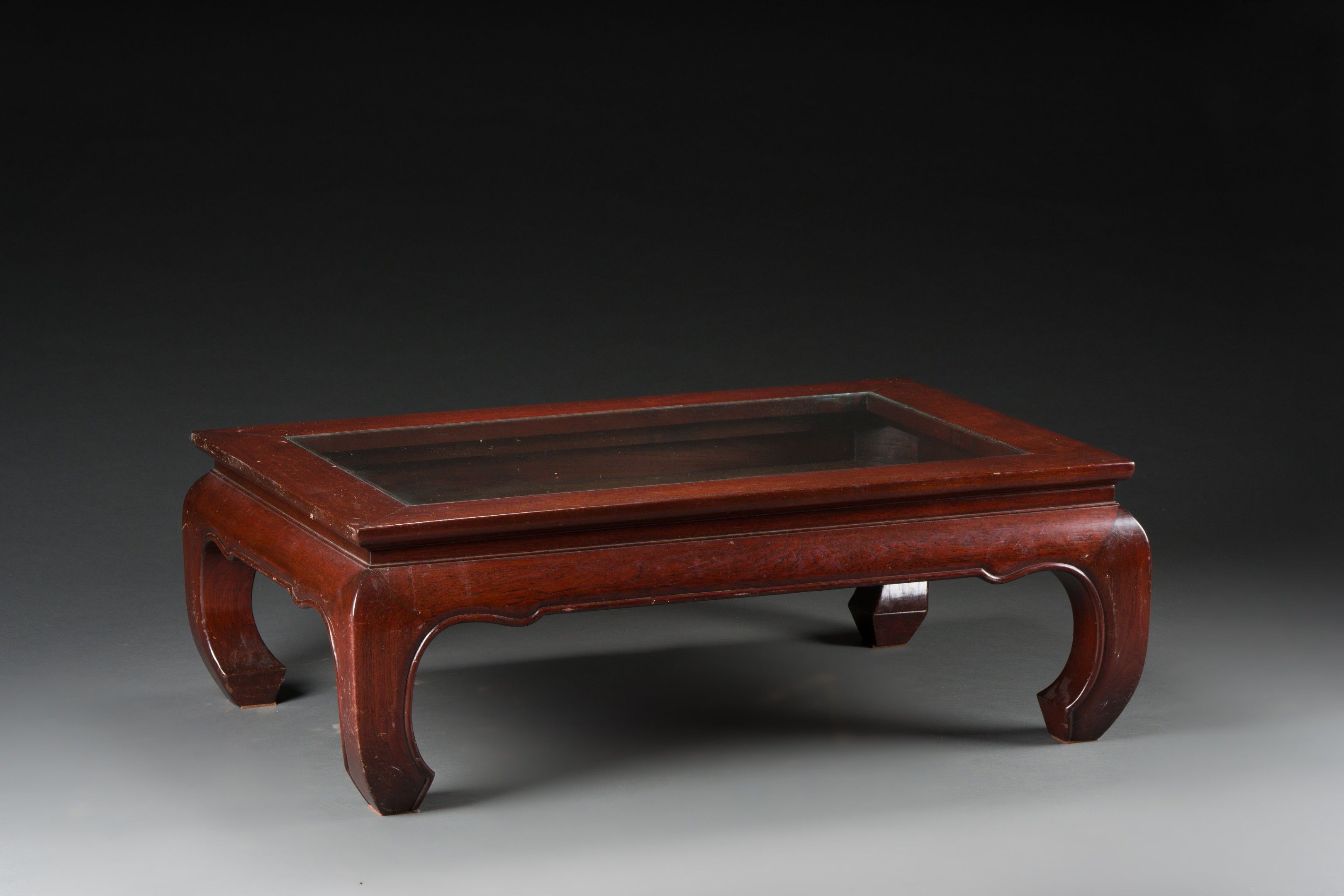Varnished exotic wood coffee table, hollow top with dark wea…