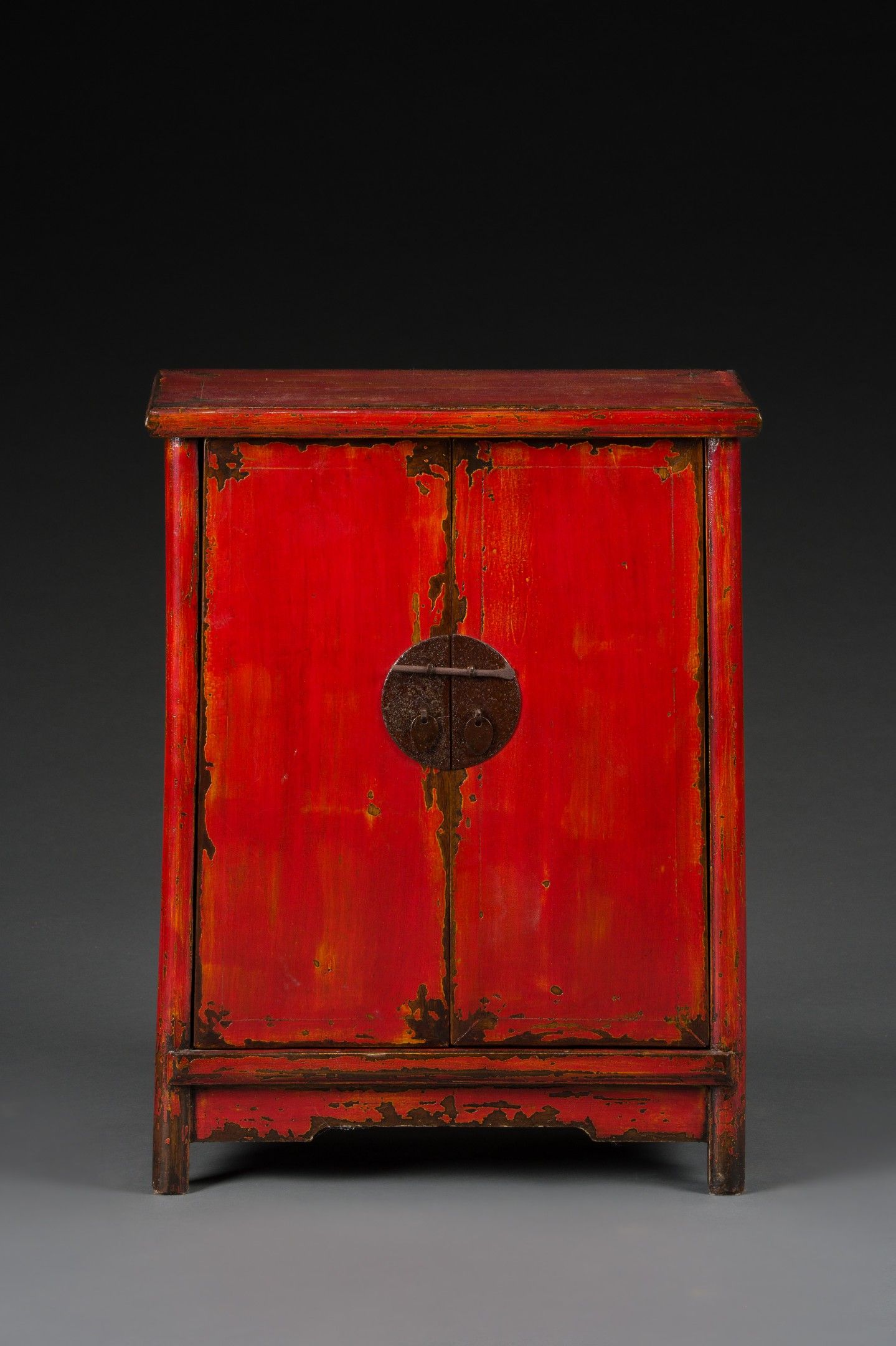 Red lacquered exotic wood in-between cabinet, opening with two leaves and two interior drawers. Iron fittings.