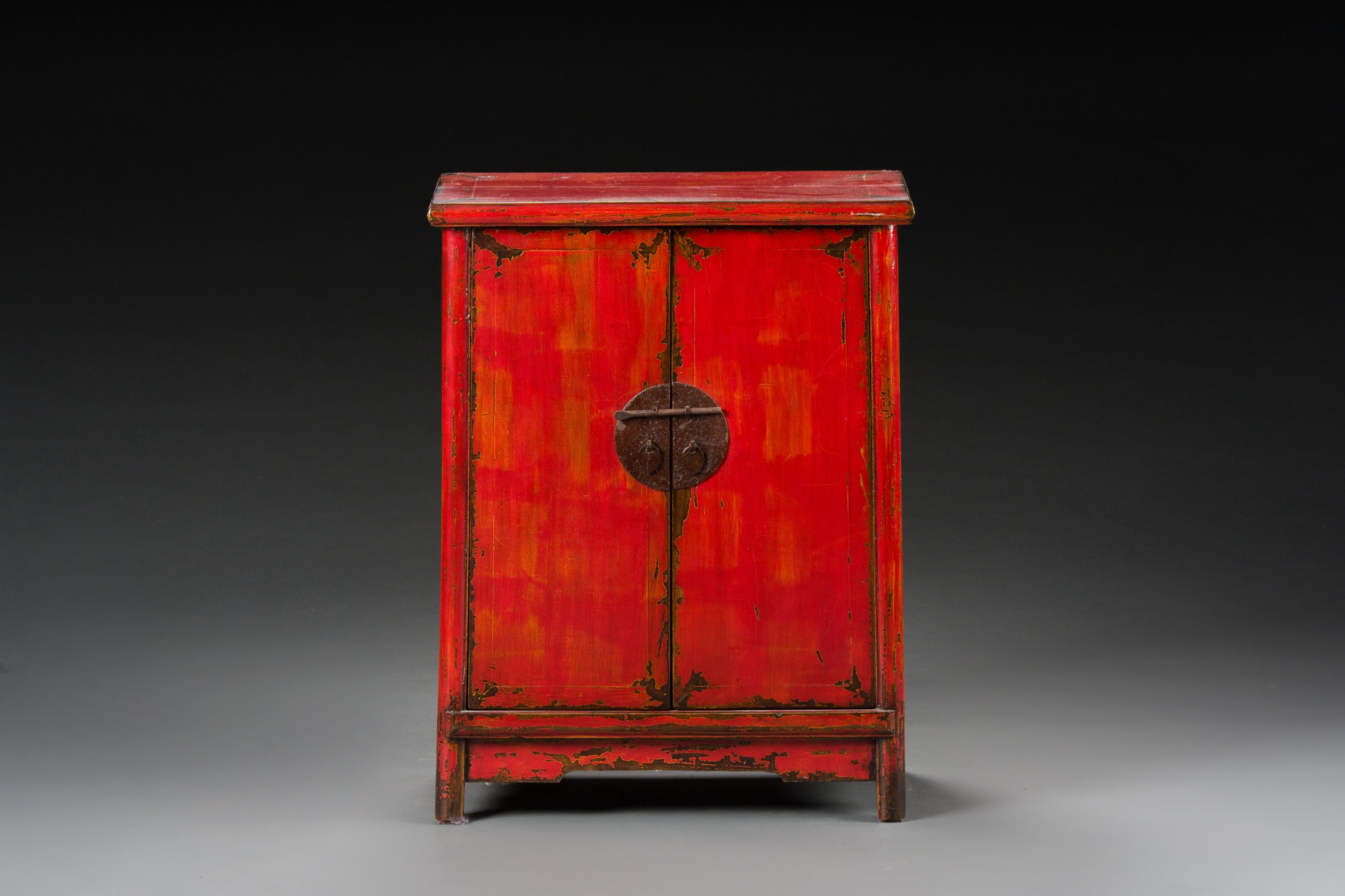Red lacquered exotic wood in-between cabinet, opening with two leaves and two interior drawers. Iron fittings.