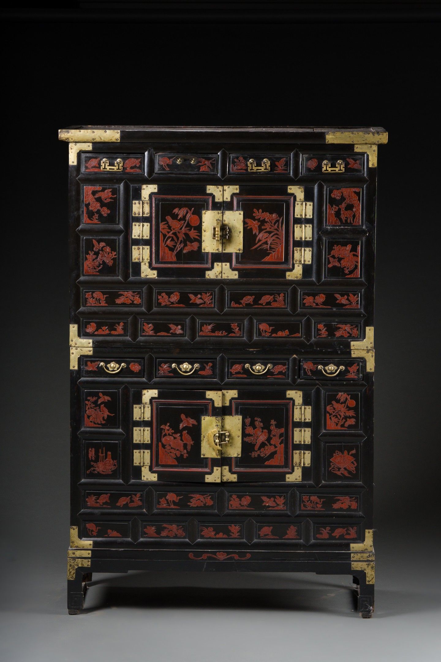 Two-piece cabinet in black and red lacquered wood decorated with various animals and foliage, opening with four leaves and eight drawers, standing on two glide feet. Tin trim.