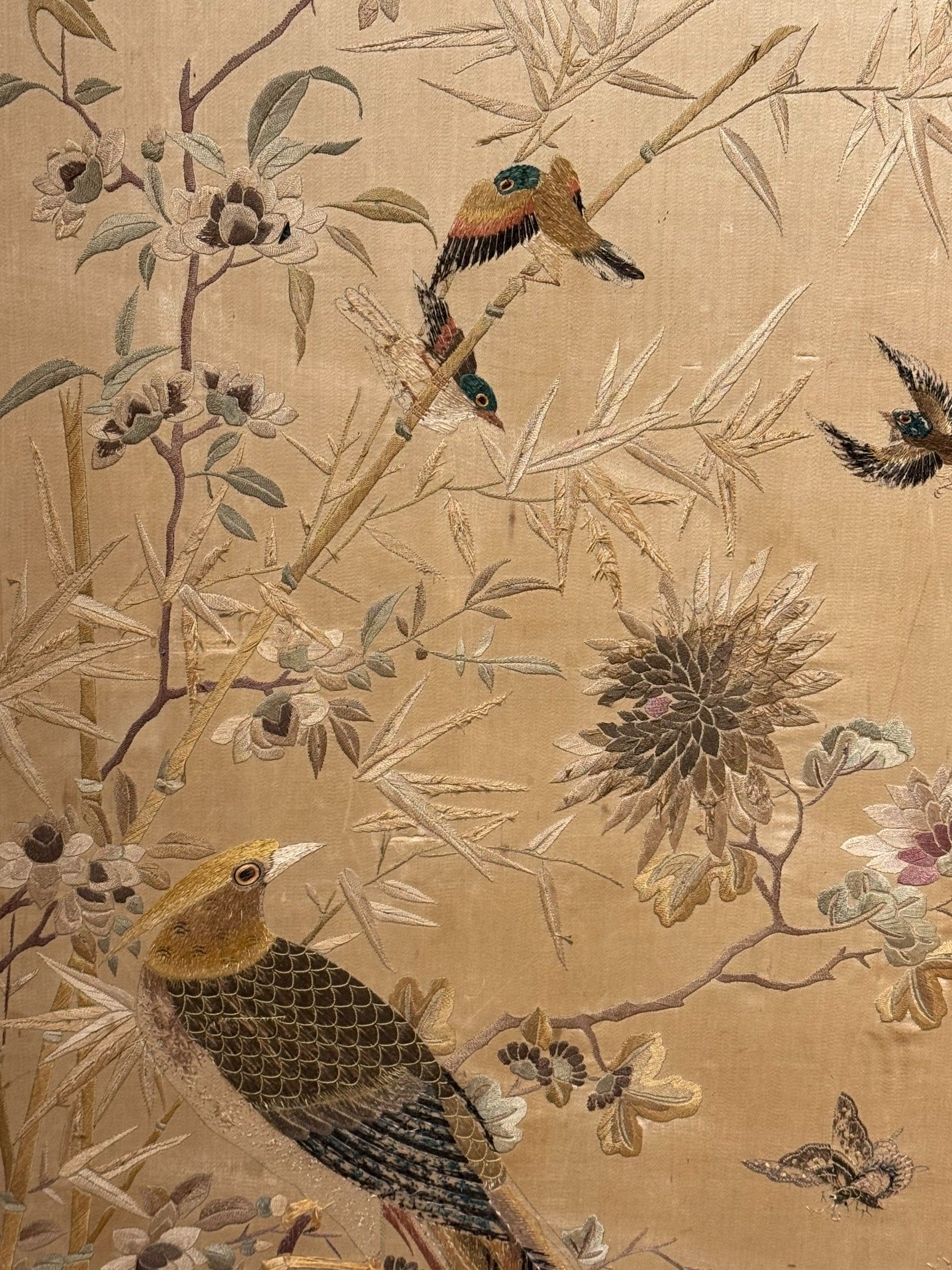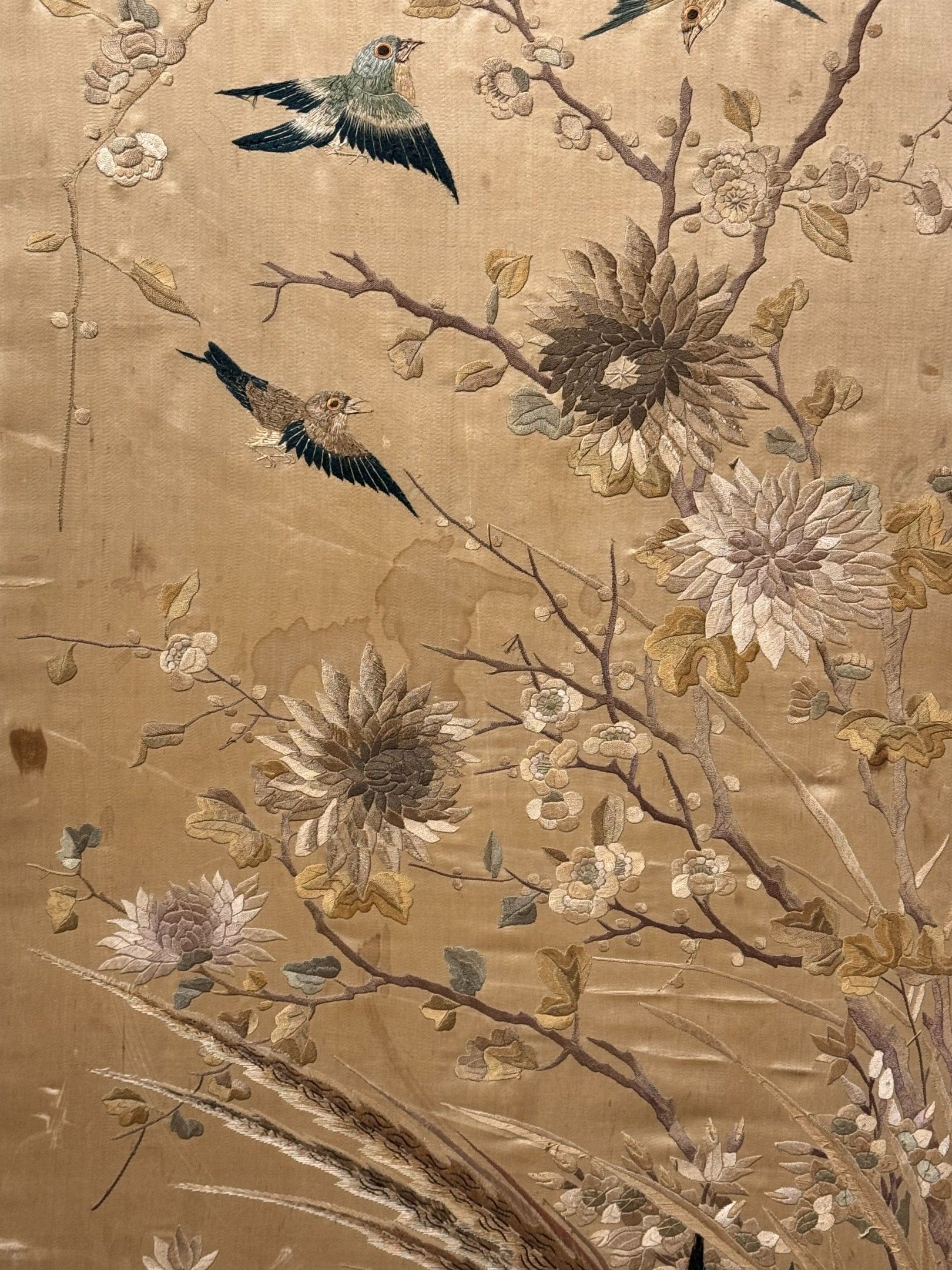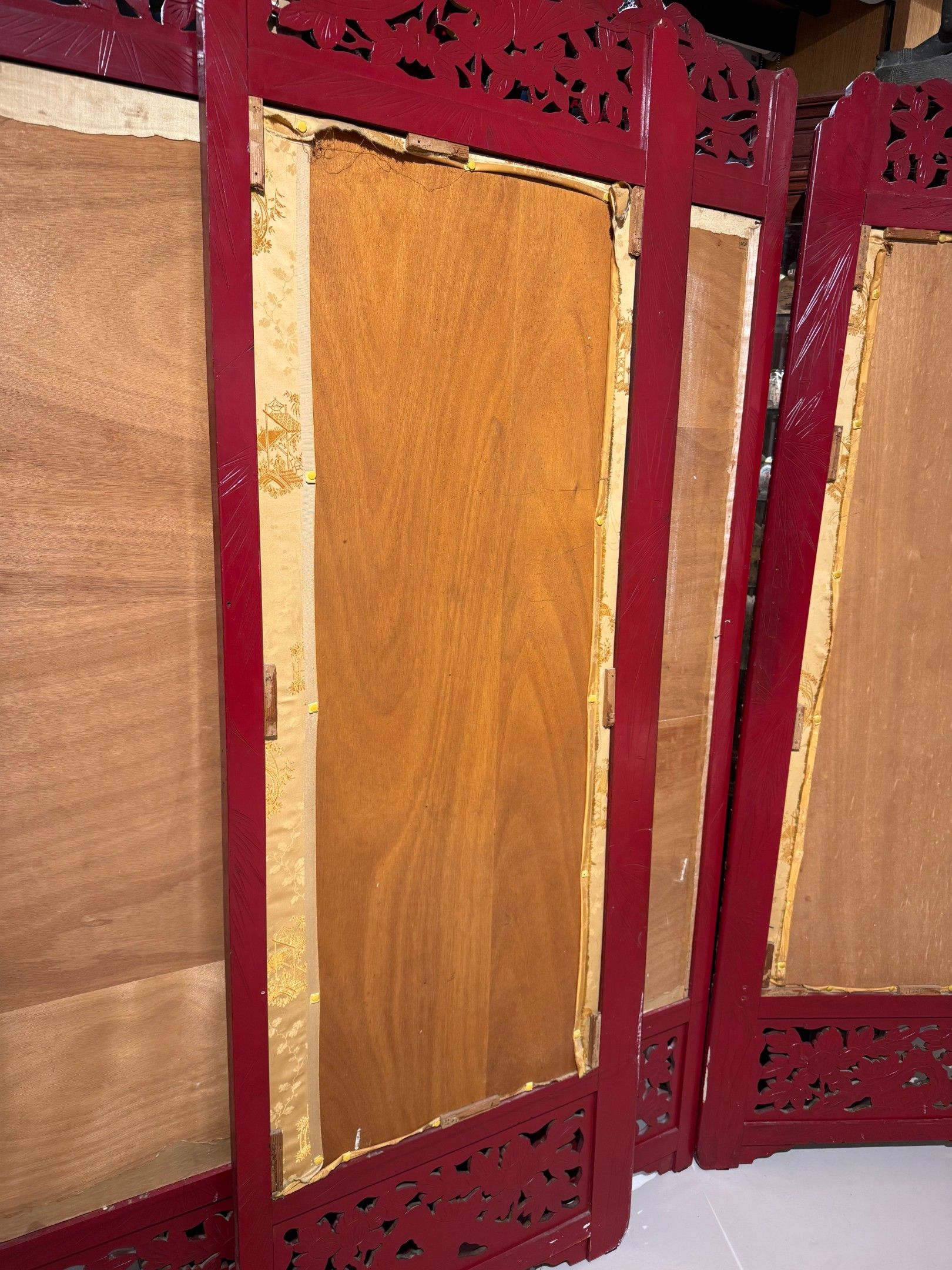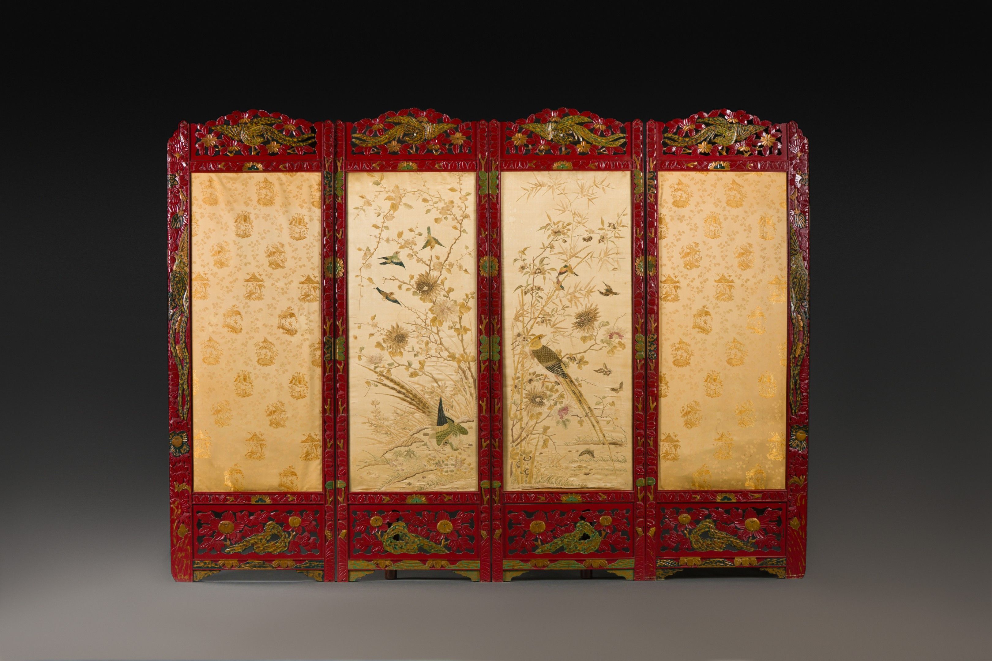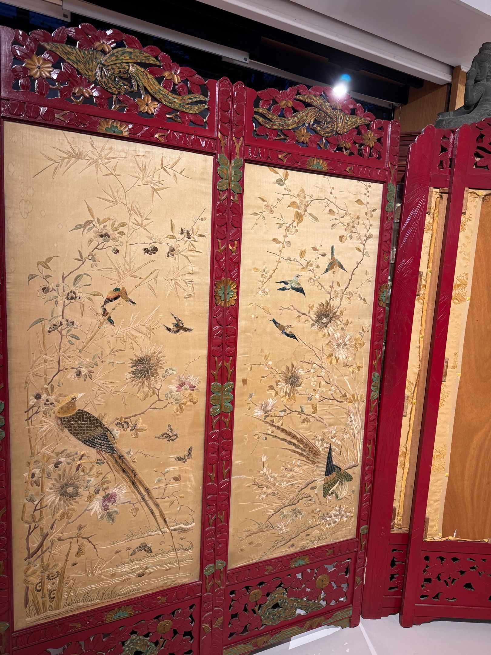 Four-leaf lacquered wood screen with carved and openwork floral and phoenix motifs. Dark leaves of embroidered silk decorated with branching birds.