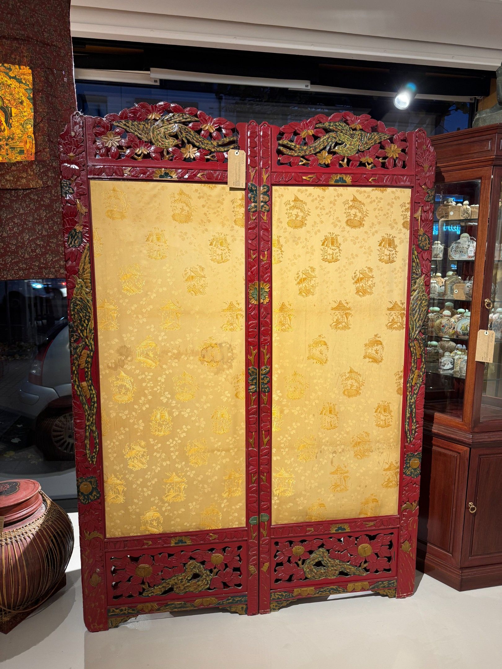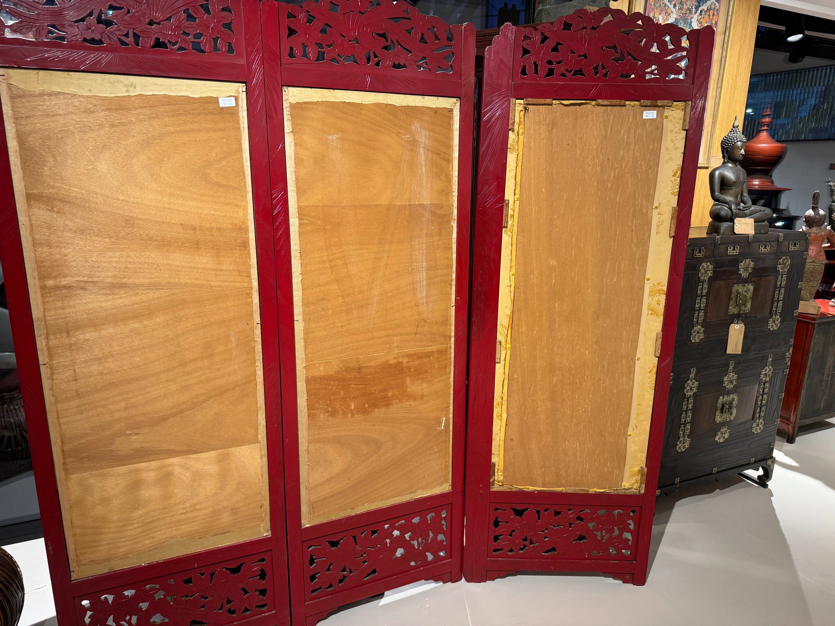 Four-leaf lacquered wood screen with carved and openwork flo…
