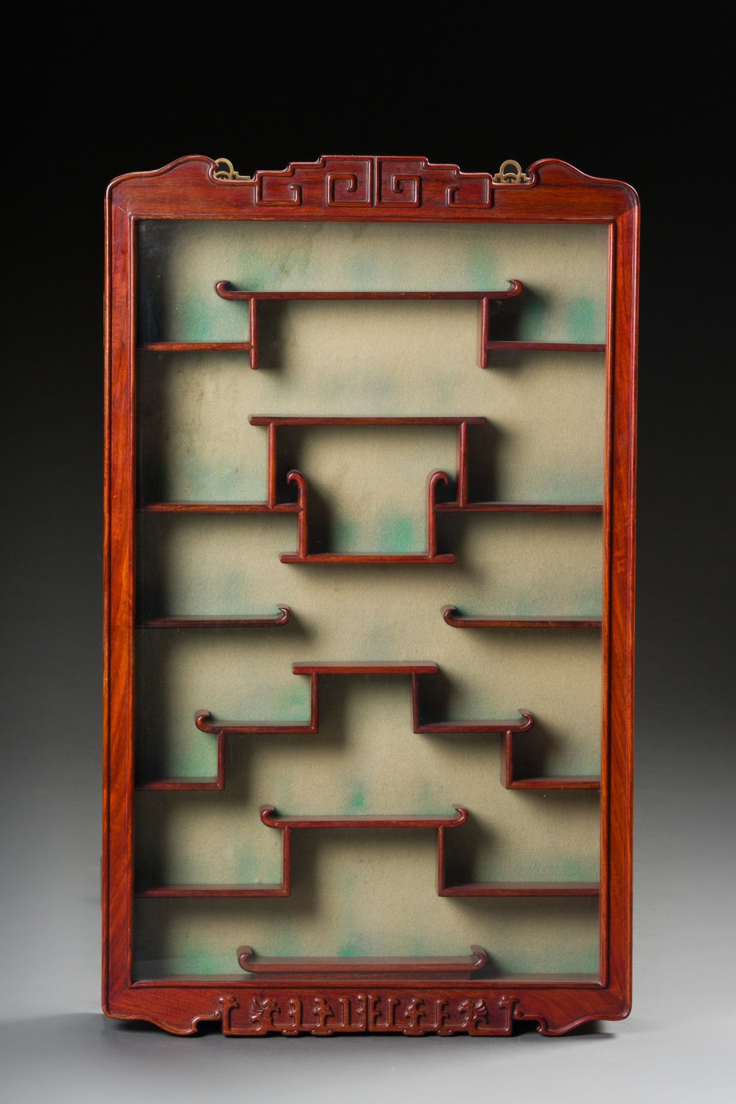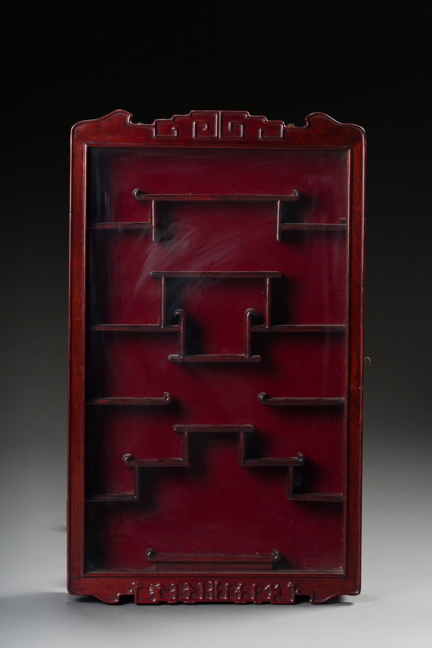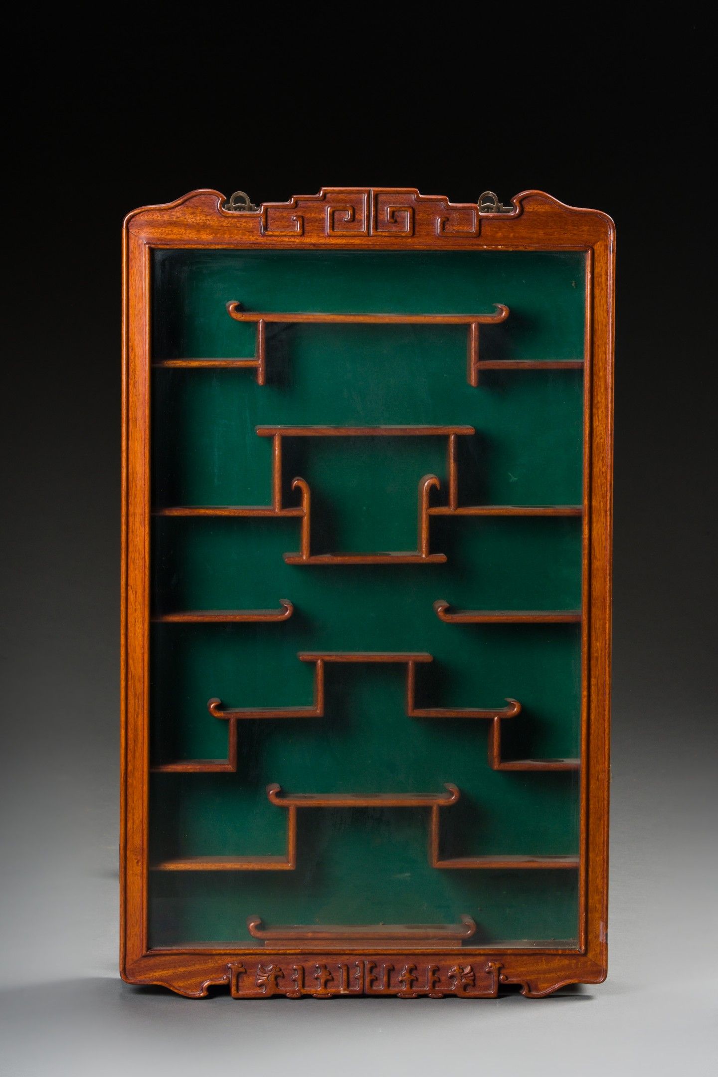 Set of three wall-mounted display cabinets in stained exotic wood opening with a dark glass panel.