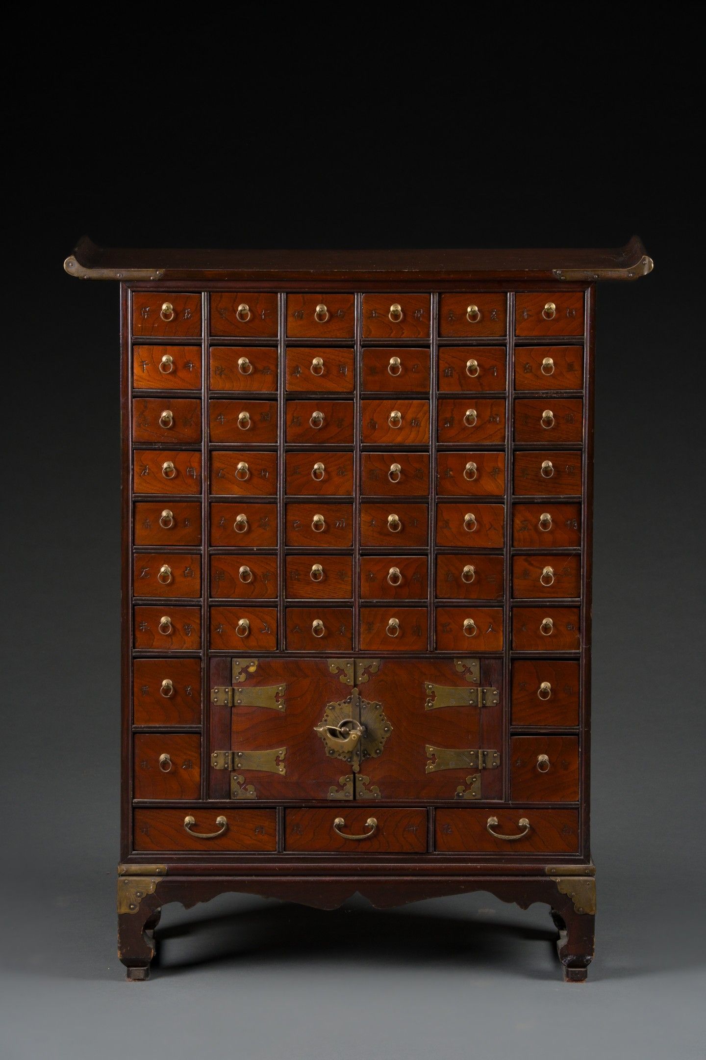 Apothecary's cabinet in stained exotic wood opening with 49 drawers and two leaves, topped with a recessed top. Metal trim.
