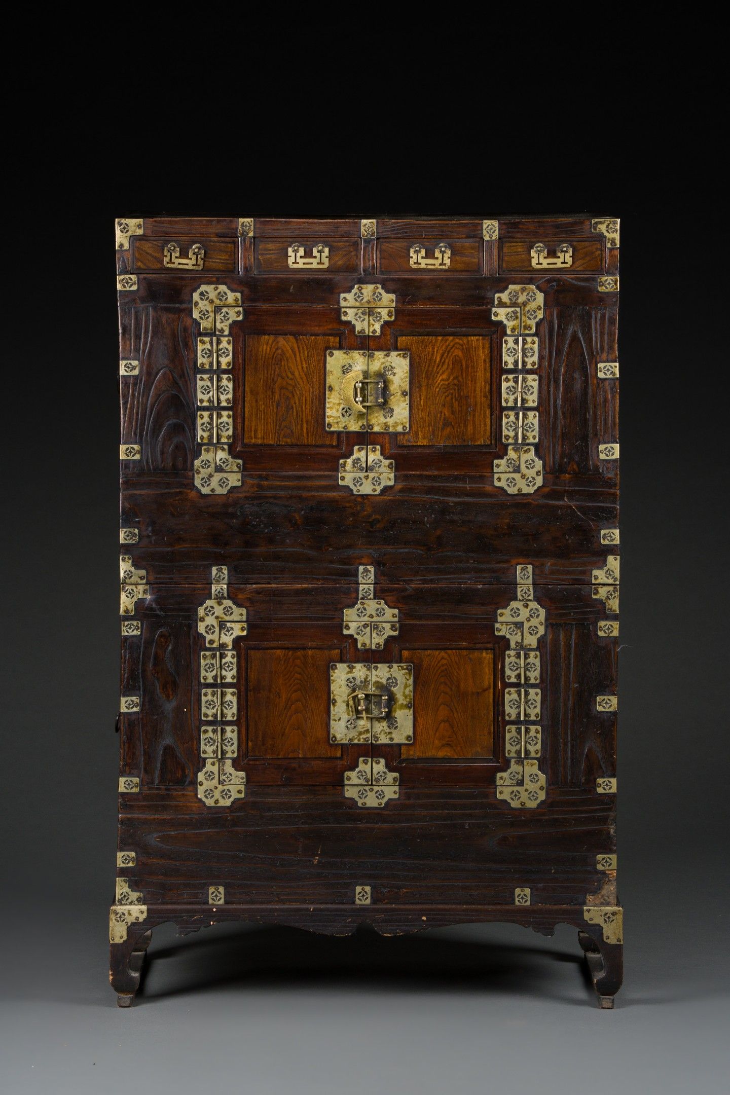 Two-piece cabinet in stained wood, opening with four leaves and four drawers, standing on two glide feet. Metal trim.