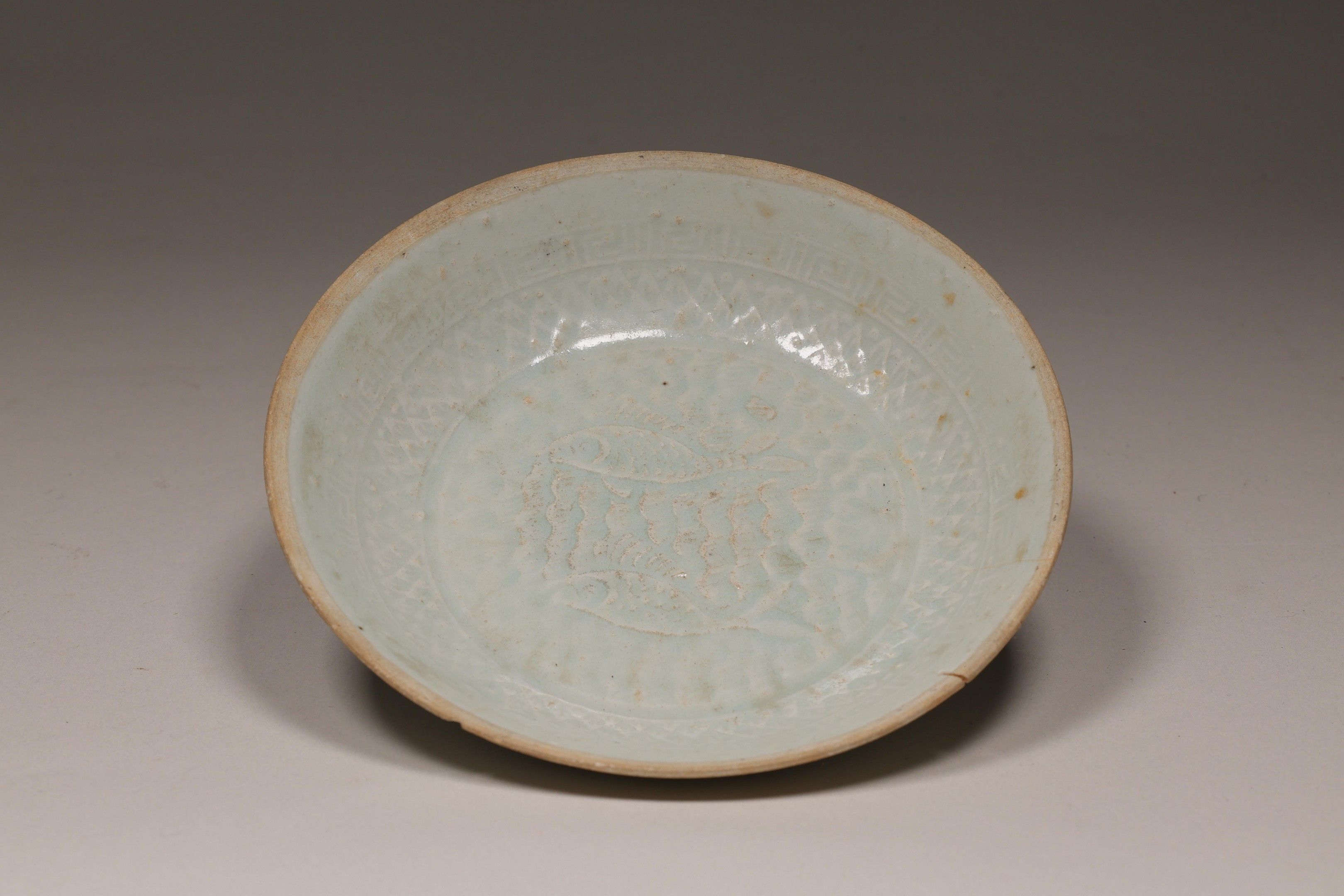 Small circular stoneware bowl with turquoise glaze and relief decoration of two fish in the water in the central medallion.