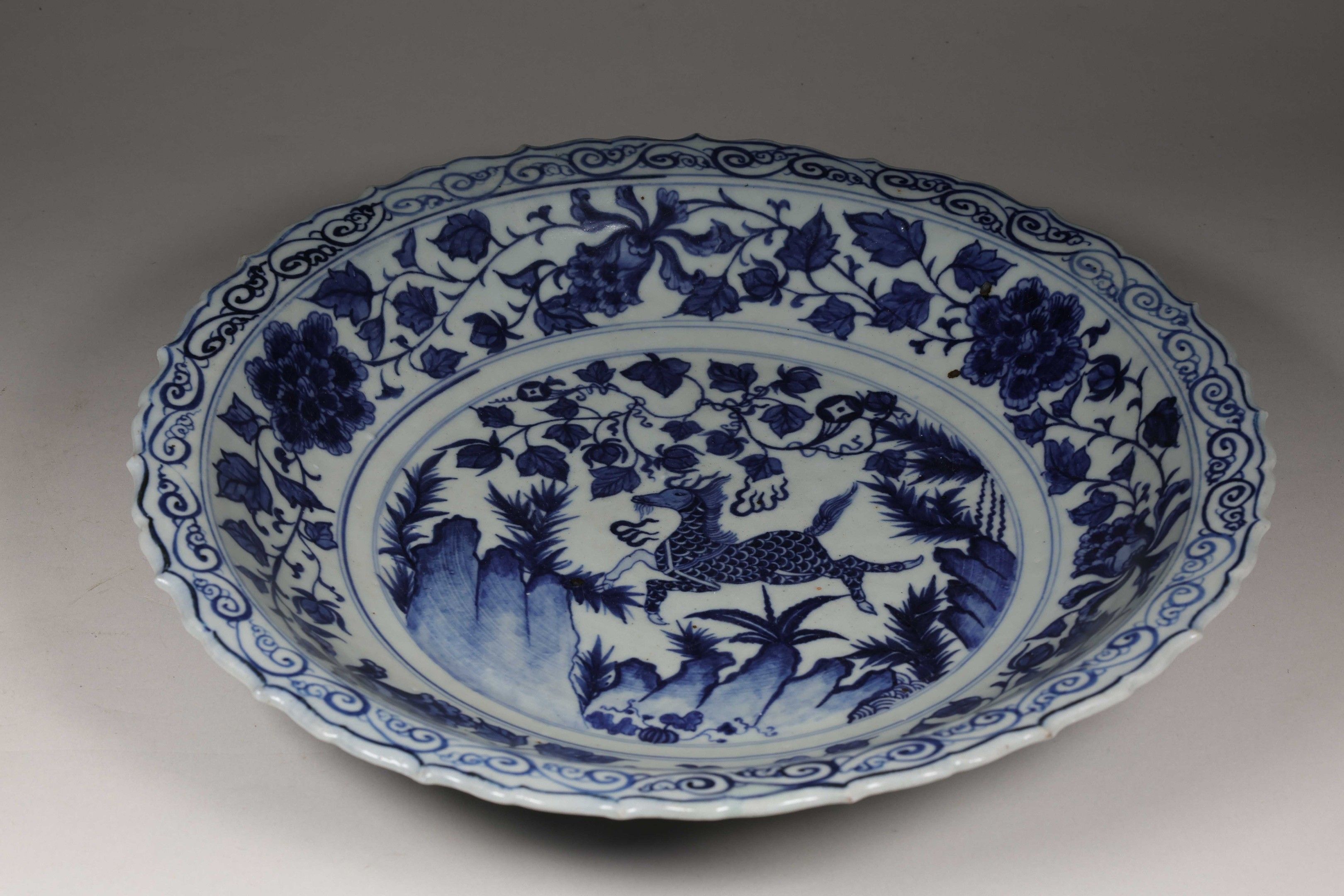 Porcelain dish with blue and white decoration of a qilin running in a landscape in the central medallion, the border decorated with scrolls of lotus and peonies. An apocryphal six-character Jiajing mark under the base.