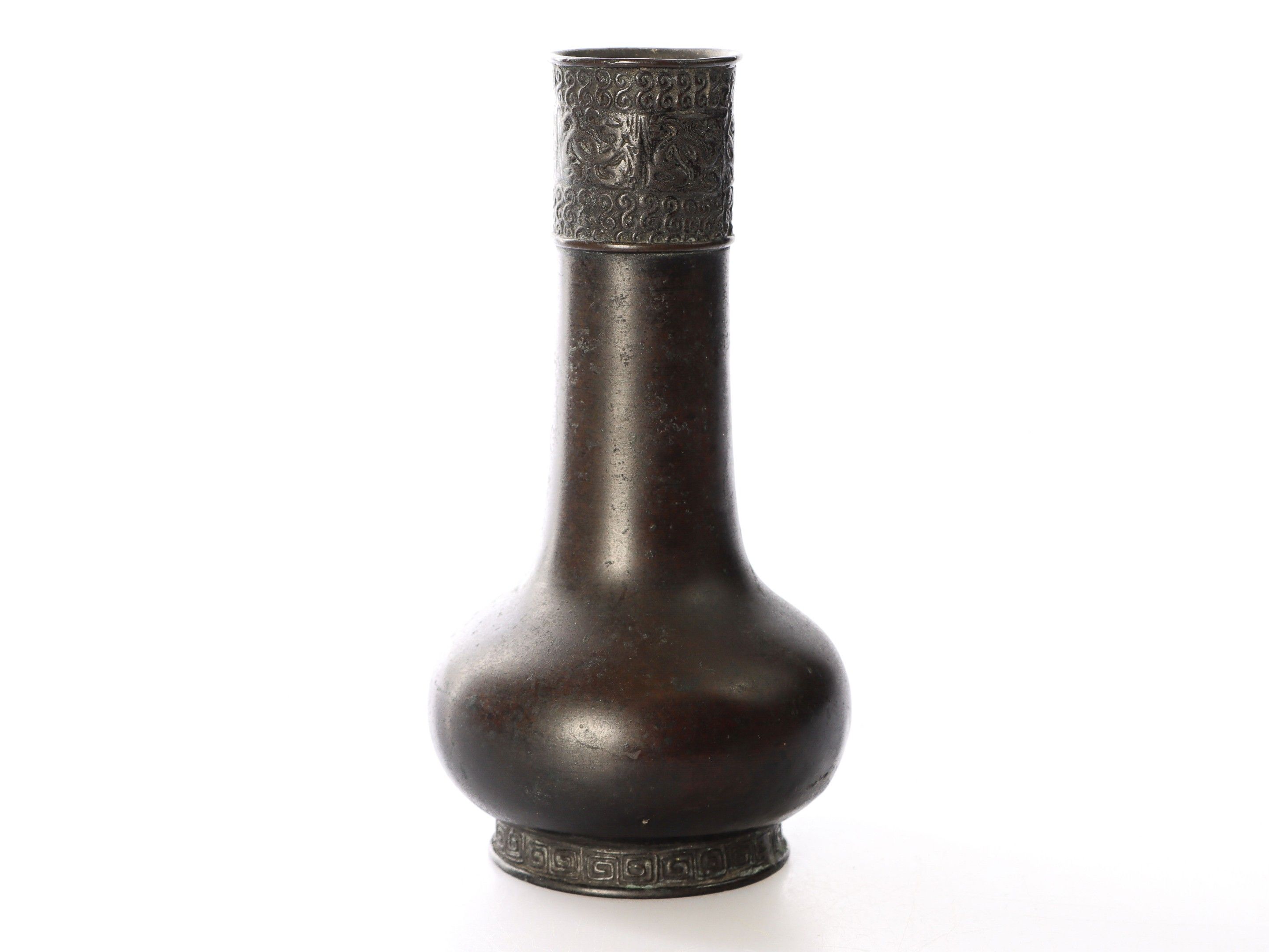 A bronze bottle-shaped vase, the top of the neck decorated with a frieze of archaic motifs.