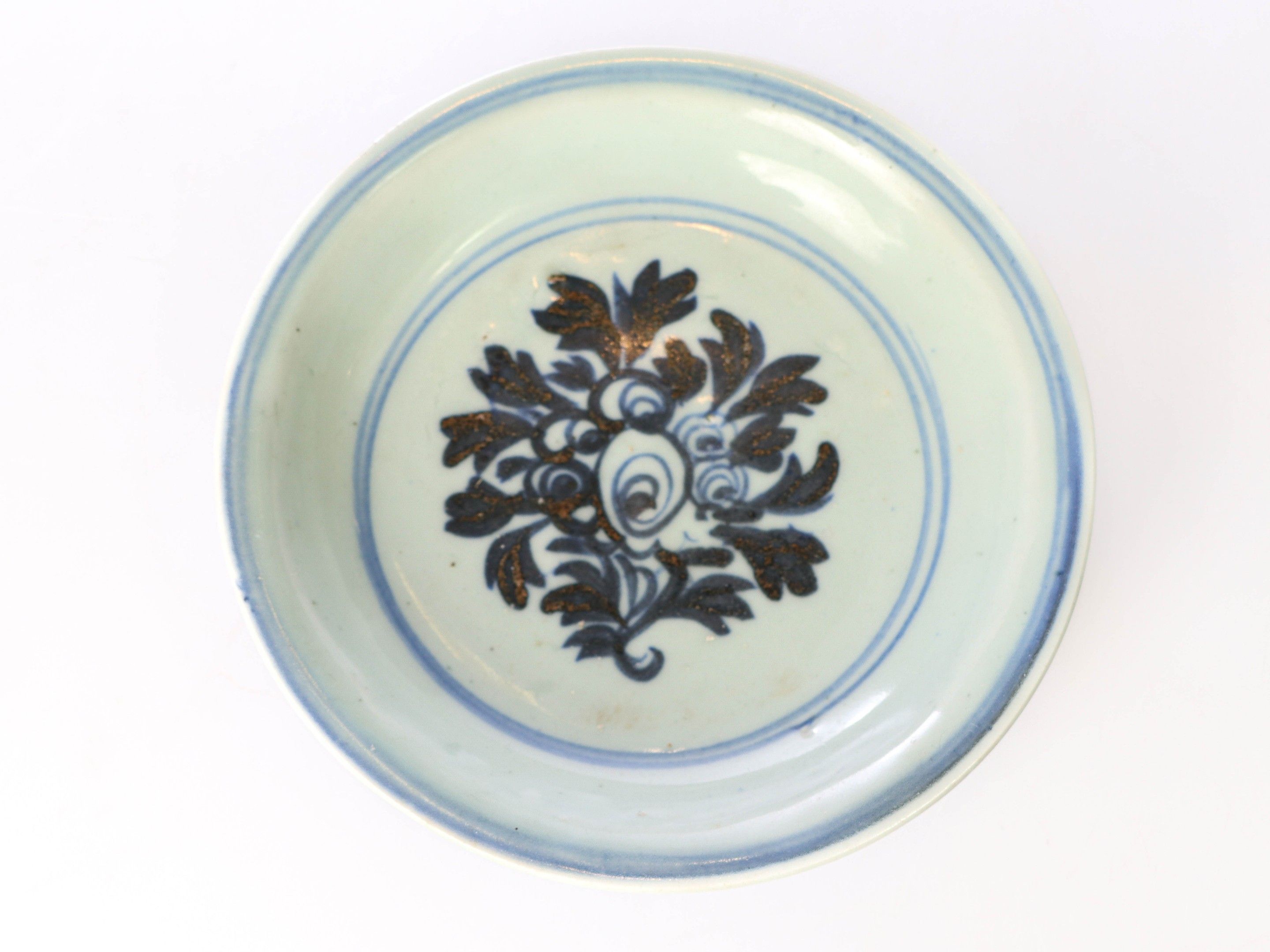 Blue and white porcelain plate with floral decoration in a central medallion.