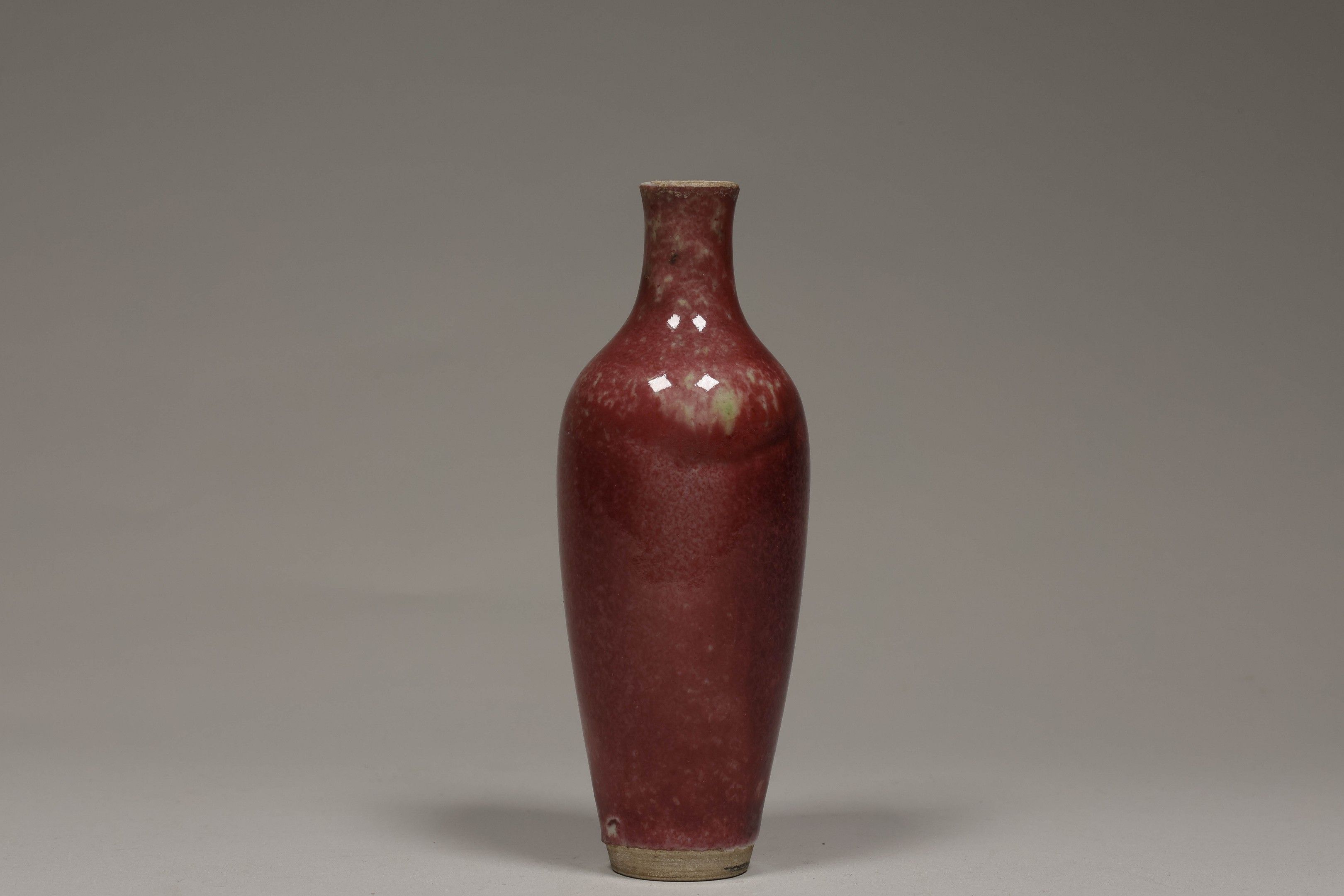 A small porcelain vase of baluster form, tapering into a "willow leaf" shape, covered throughout with a "peach skin" glaze. An apocryphal Kangxi mark with six characters in cobalt blue under the base.