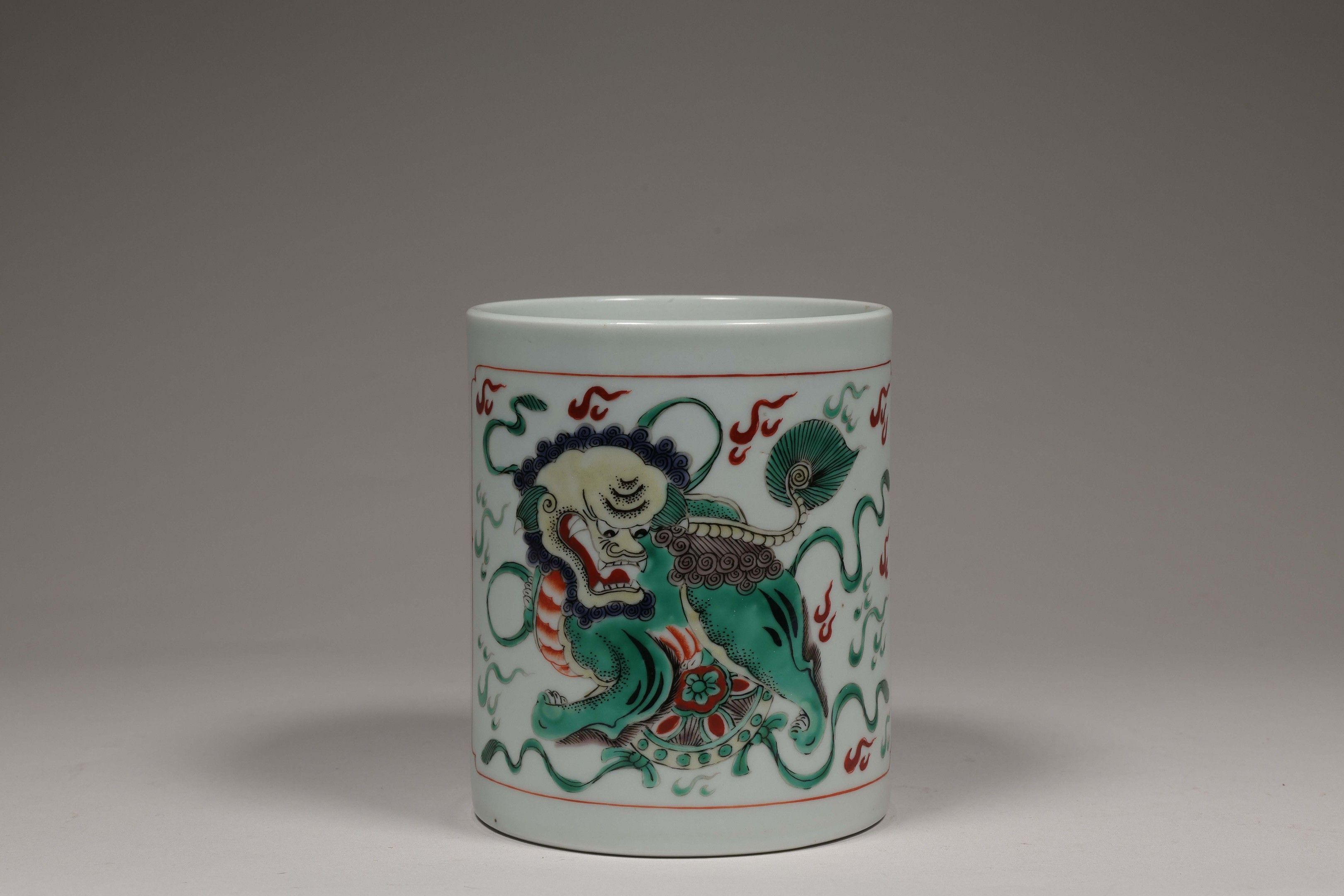 A cylindrical porcelain brush pot decorated in green family enamels with two chimeras with their brocade balls.