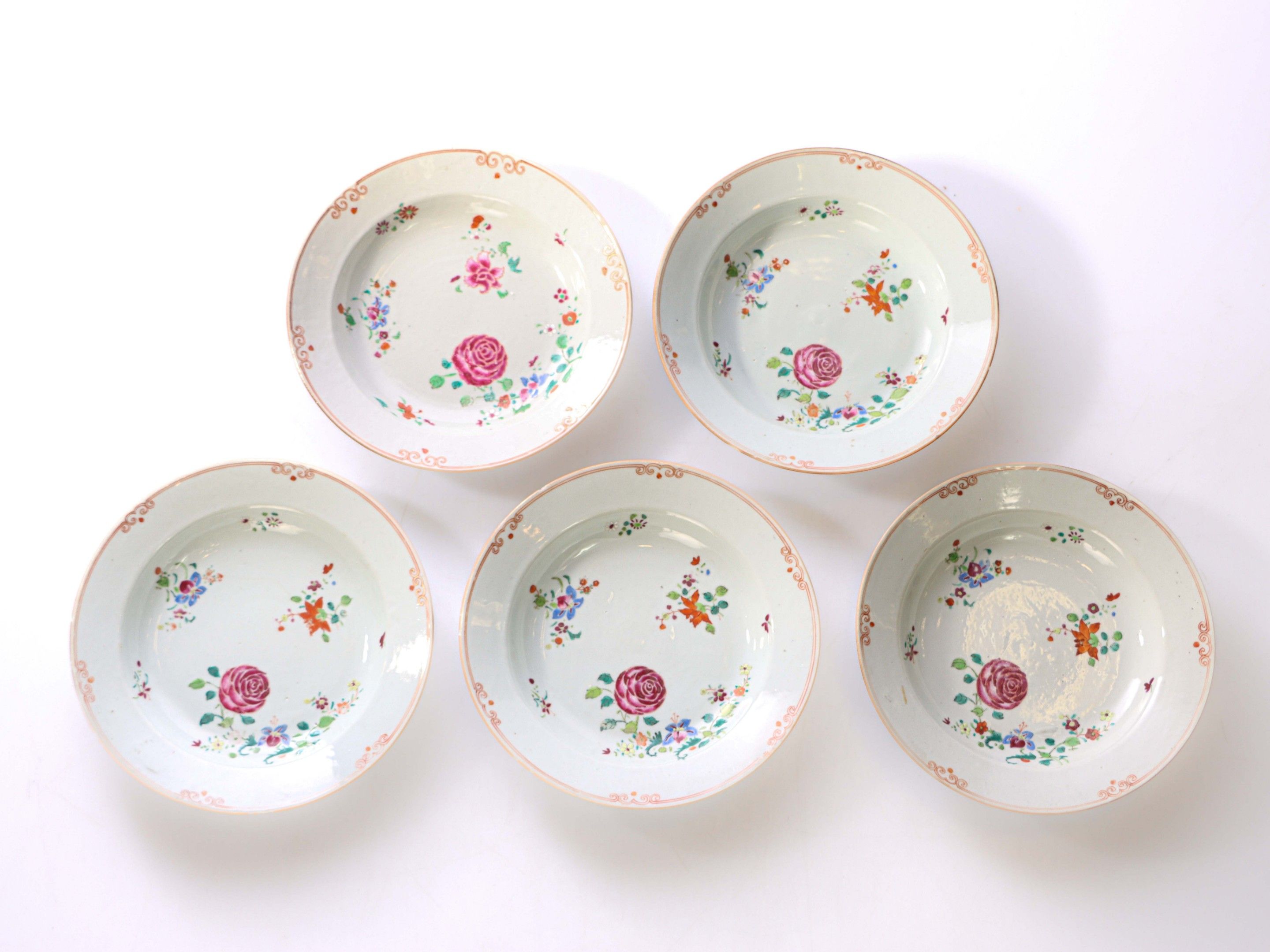 CHINA, Compagnie des Indes, 18th century Suite of five porcelain and Famille Rose enamel soup plates with floral decoration. Diameter: 22.8 cm (each) (Some chips and cracks, wear) Provenance: - Collection of a Swedish gentleman, member of the OCS (Oriental Ceramic Society) London Photos condition report : lc.cx/6-mc5_