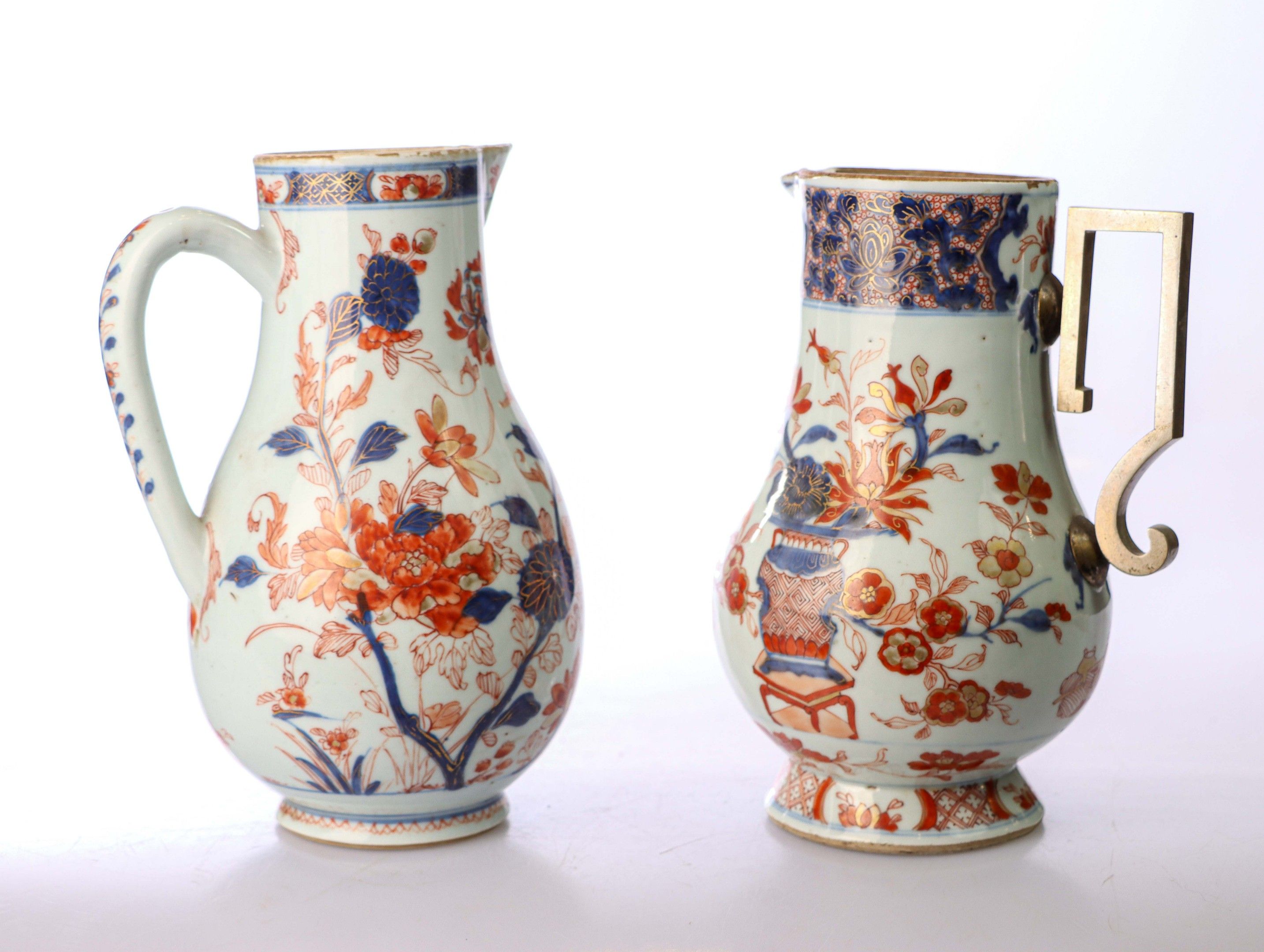 CHINA, 18th century Two Imari porcelain jugs. Height: 22.5 and 21.5 cm (Damage, cracks) Provenance: - European collection Photos condition report : lc.cx/6-mc5_