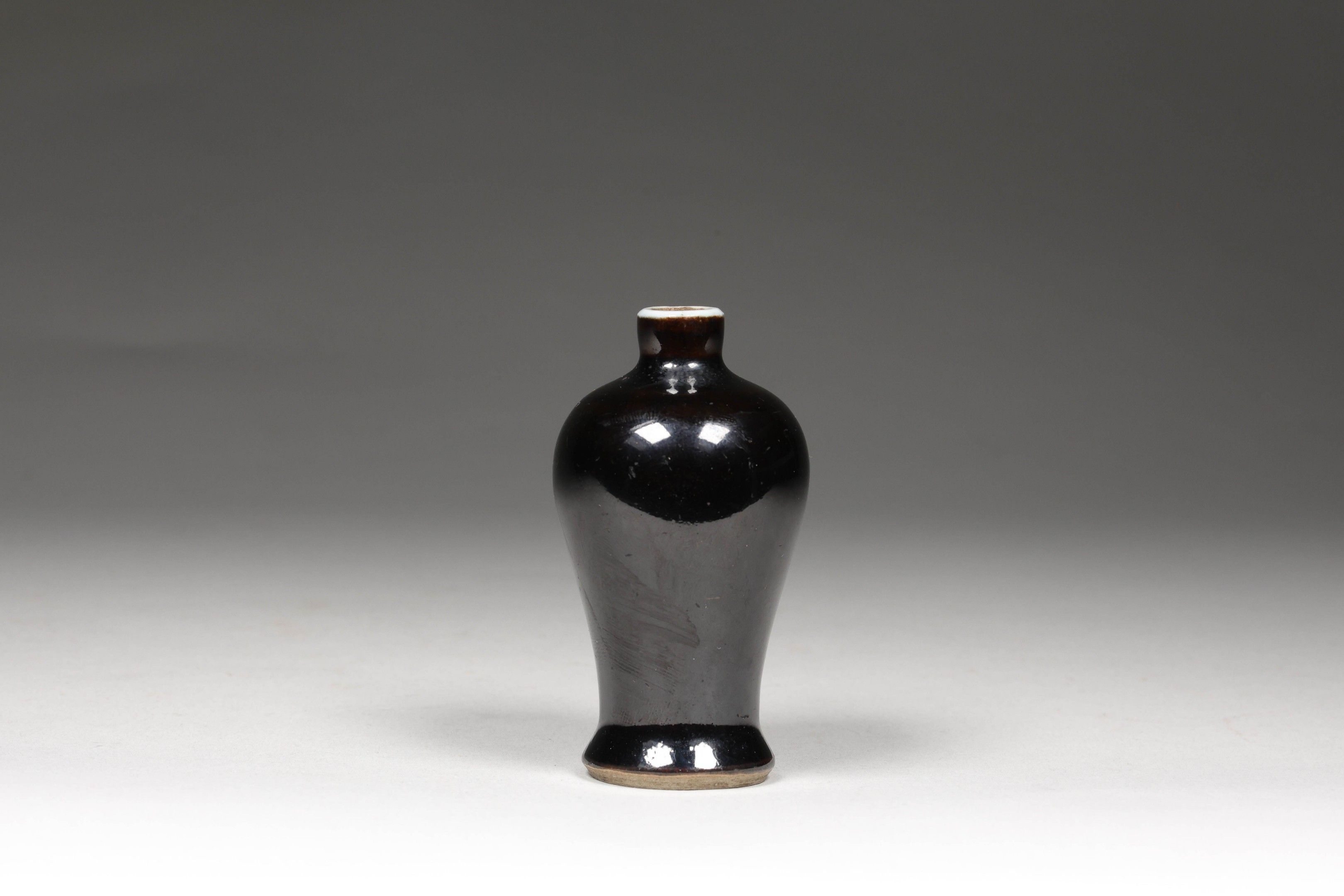 A small baluster-shaped porcelain vase covered throughout with a monochrome black glaze.
