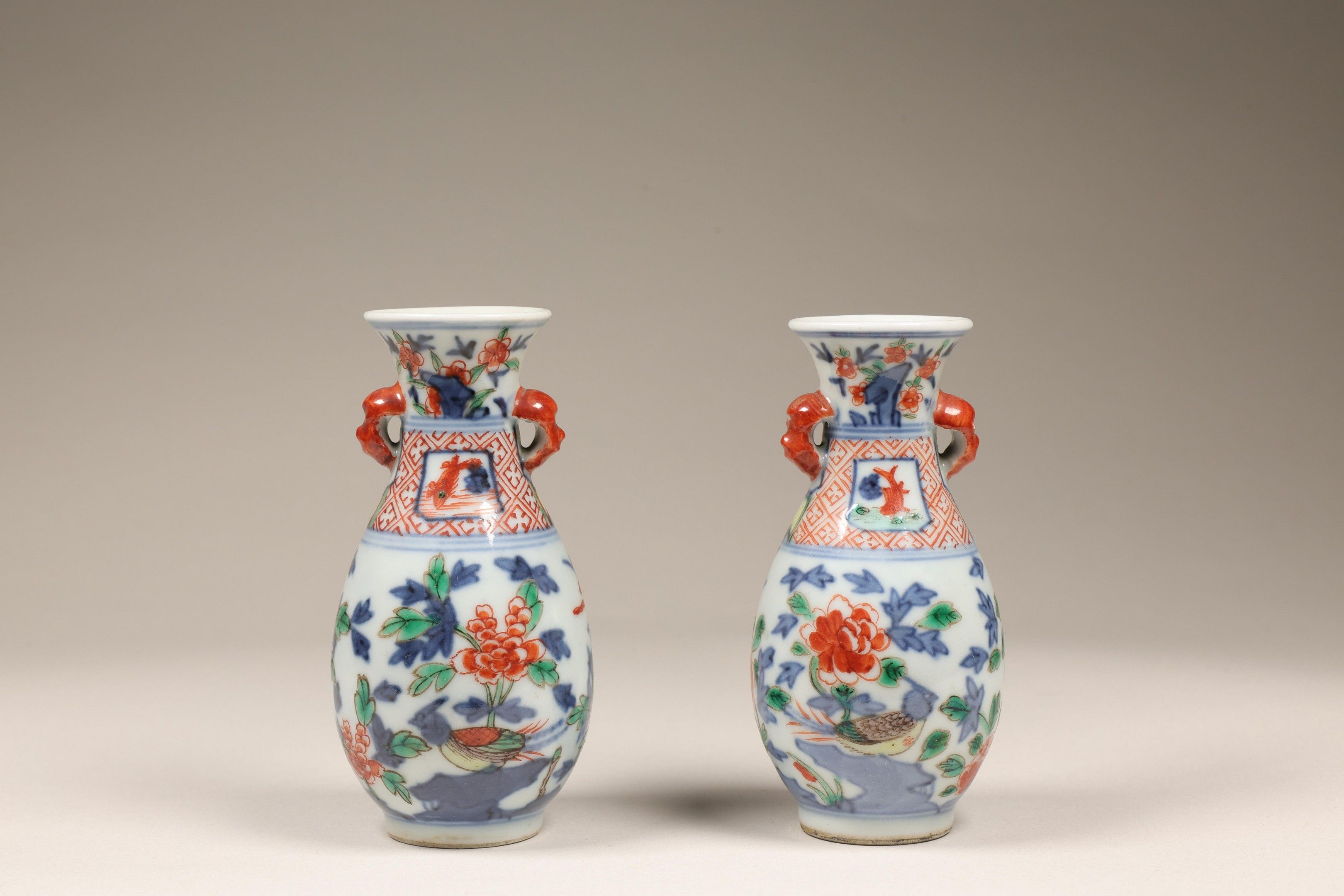 Pair of miniature porcelain vases, baluster shape, ovoid bodies topped by flared necks, decorated with wucai enamels of birds among flowering branches, flanked at the necks by handles in the shape of chimera heads. Wanli apocryphal marks with six characters in a double blue border under the bases.