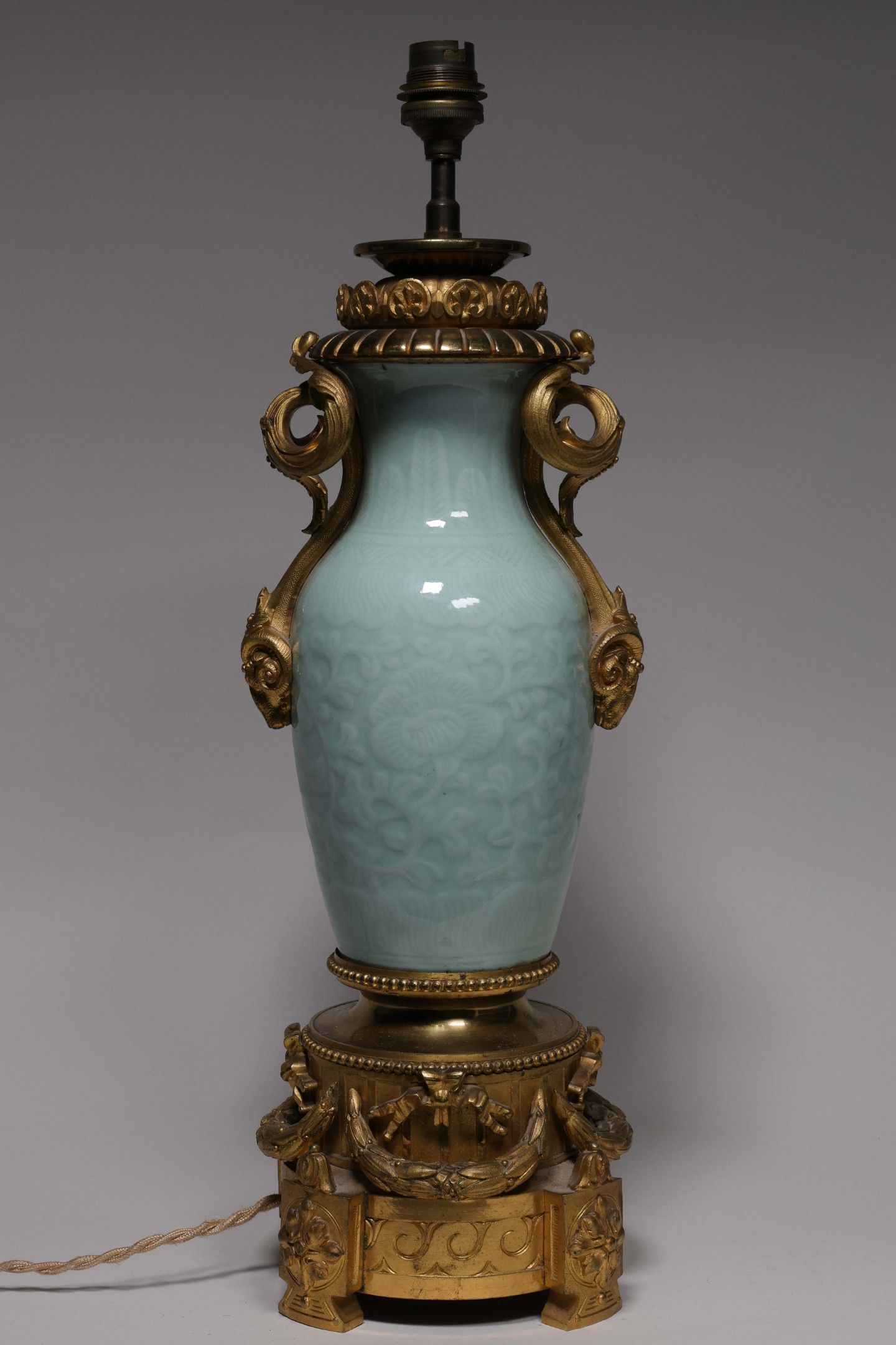 A celadon-glazed porcelain baluster vase decorated in relief with peony flowers, presented in a rich European chased and gilt bronze frame, the handles decorated with ram heads and foliage.