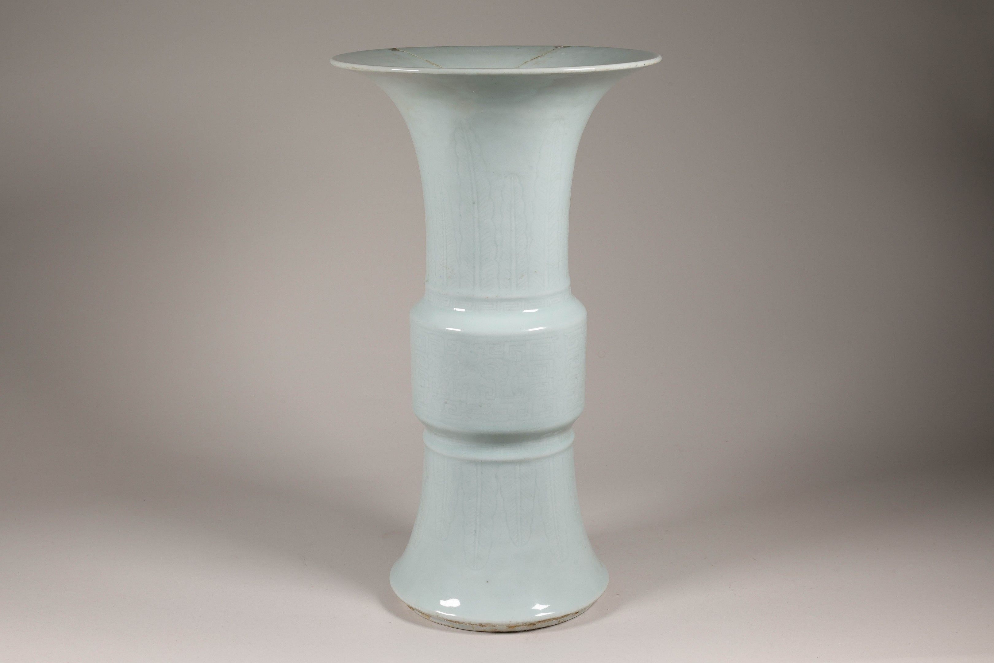 A "Gu" shaped porcelain vase, standing on an enlarged foot, with a small cylindrical middle body, topped by a long neck flared at the opening, covered throughout with a pale celadon glaze with incised decoration in the paste of archaizing motifs.
