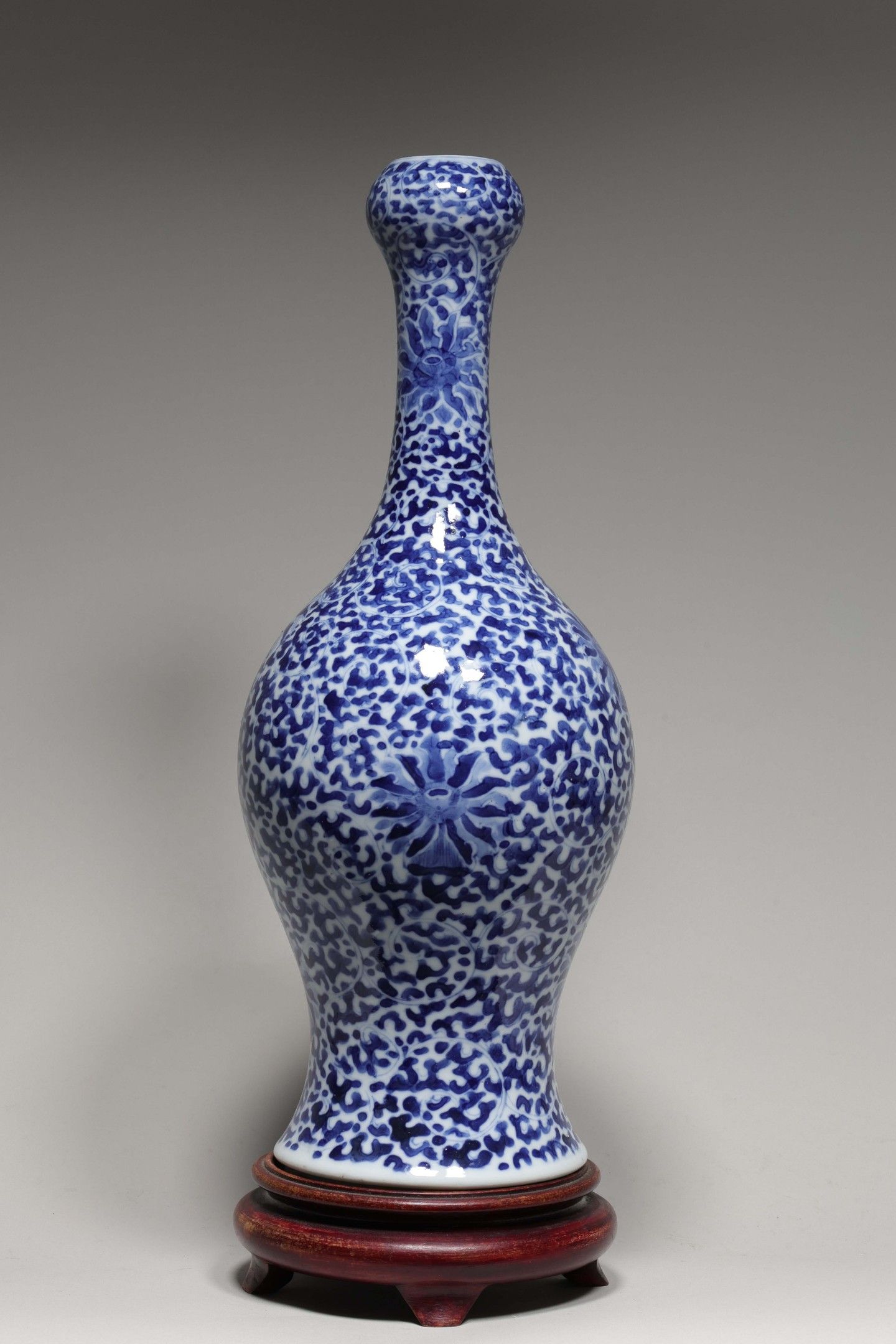 Porcelain vase with curved base, ovoid body topped by a long thin neck ending in a bulb at the opening, known as a "garlic clove head", decorated in cobalt blue on a white background with lotus scrolls. Double blue banding under the base. With matching wooden base.