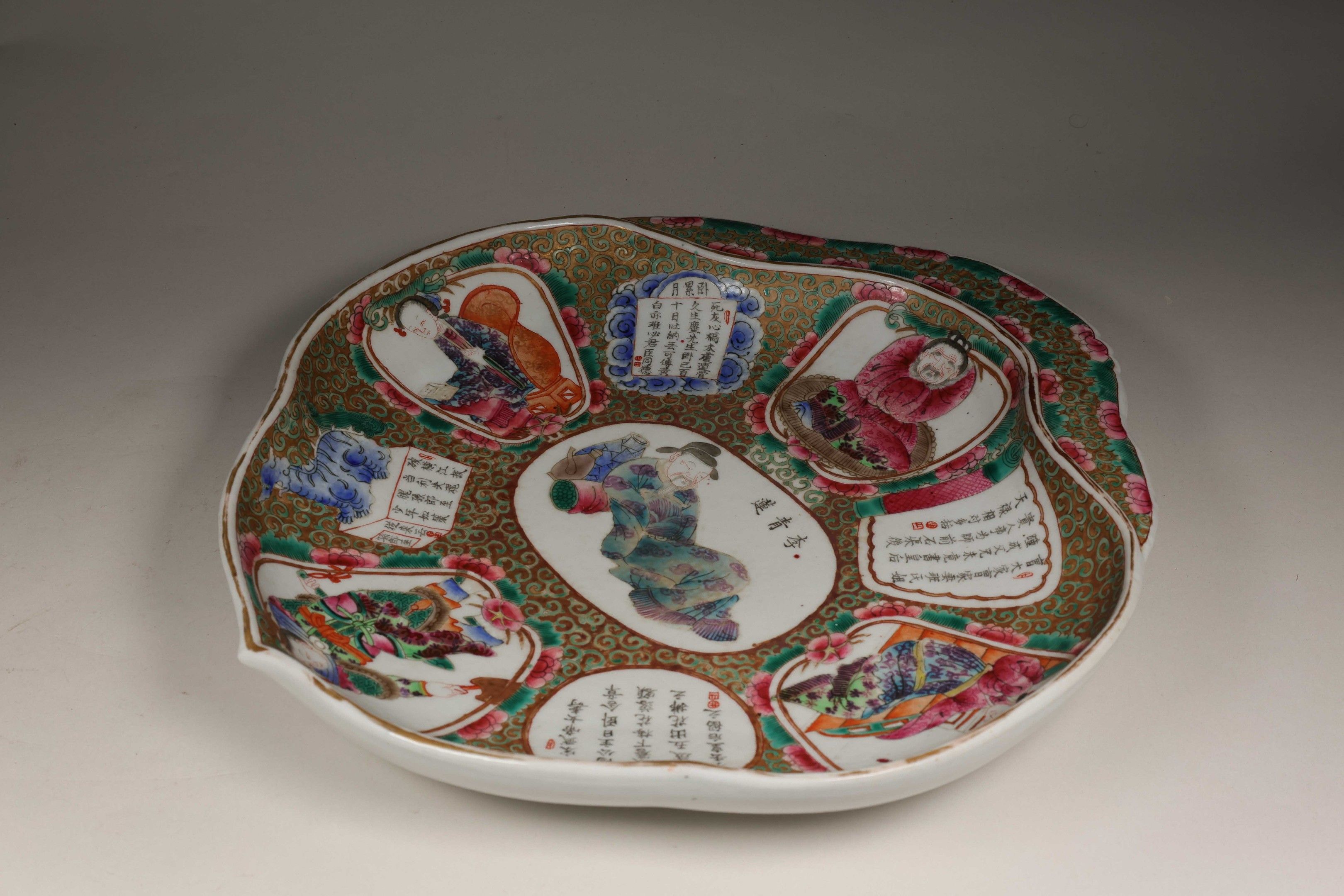 Original porcelain fish dish with polychrome enamelled decoration featuring cartouches depicting Immortals and poems in the "Wu Shuang Pu" style, the background lined with green foliage on a gold background. A six-character Daoguang mark under the base.