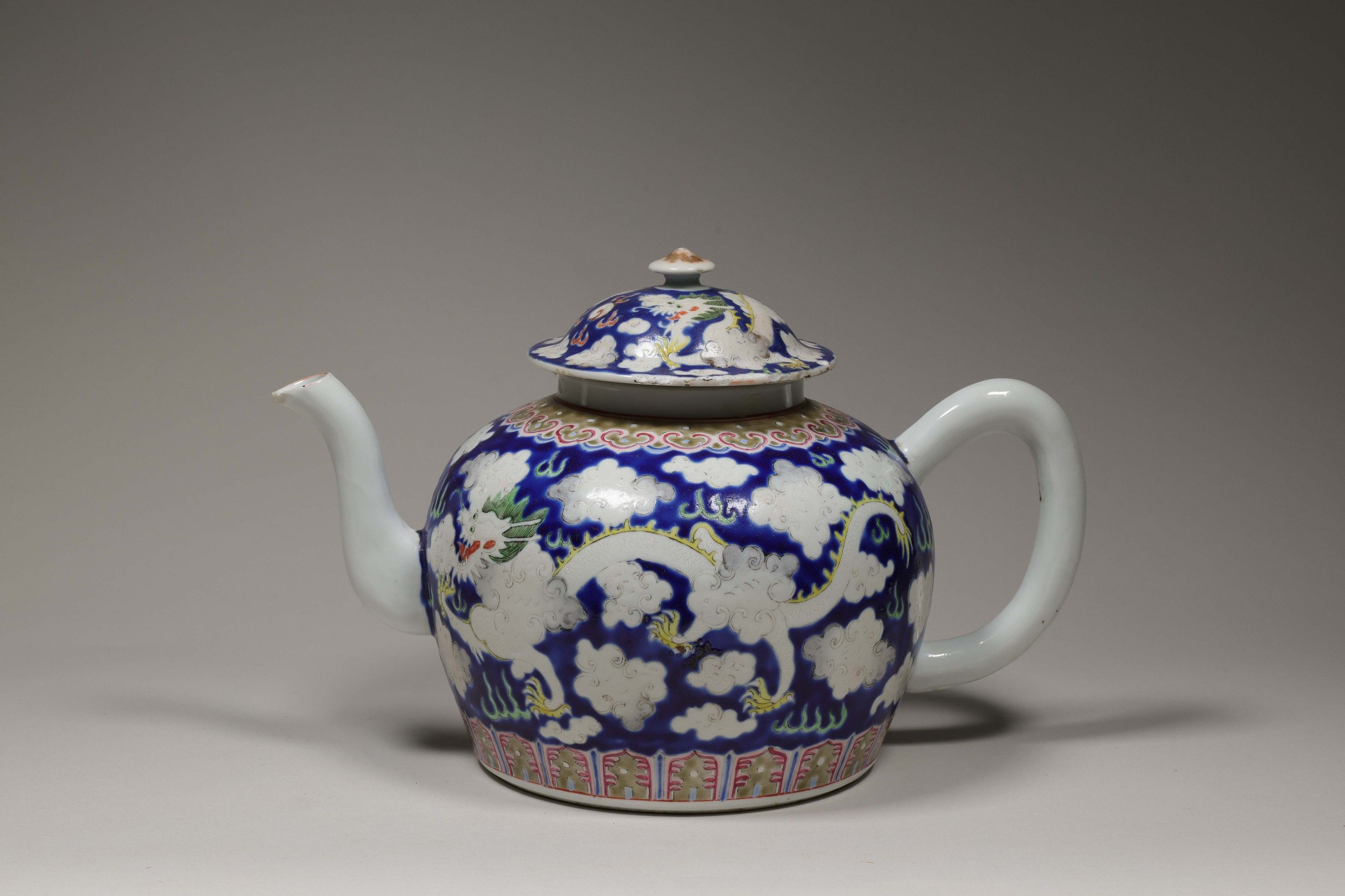 A porcelain teapot, the body circular, with "S" spout and opposite ear handle, the lid domed, presenting on the whole a decoration in polychrome enamels of dragons with five claws moving among the clouds on a dark blue background. Six-character Xianfeng mark stamped under the base.