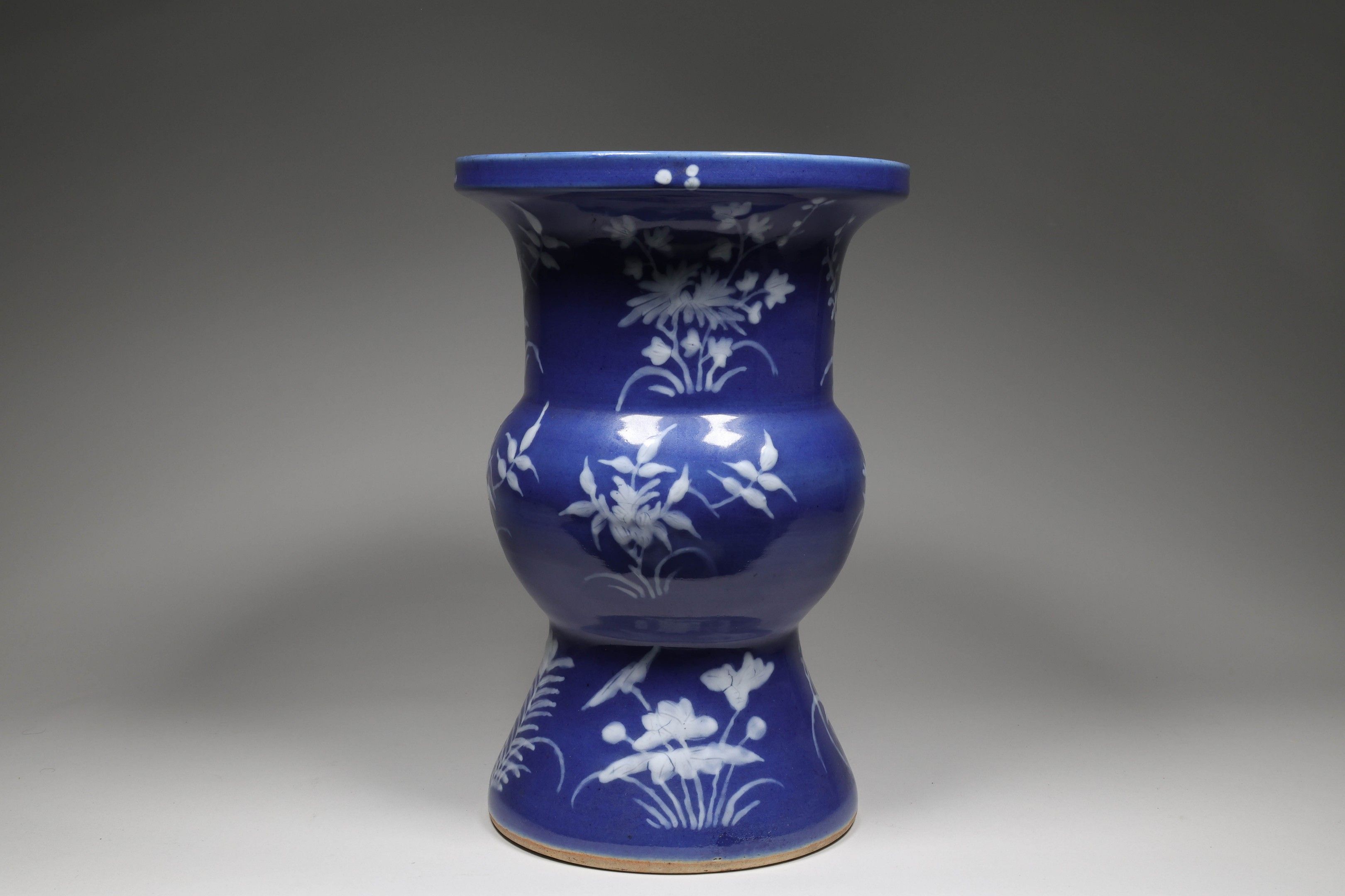 Porcelain vase, standing on a high foot, with an ovoid body topped by a straight neck, covered throughout with a powder blue glaze and painted white overglaze decoration of flowering branches.