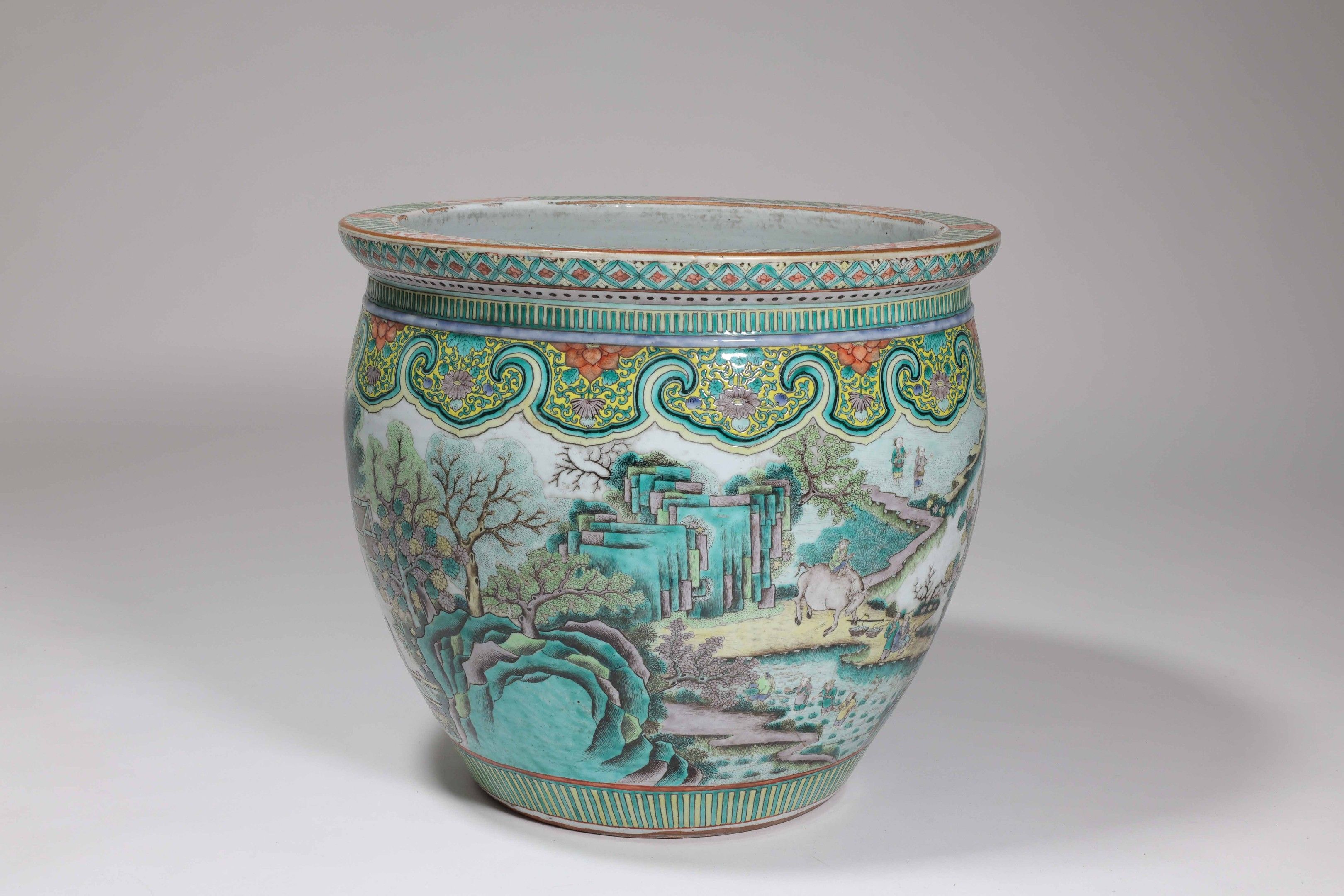 A circular porcelain basin decorated in green family enamels with palatial and peasant scenes, the background decorated with red fish among seaweed.