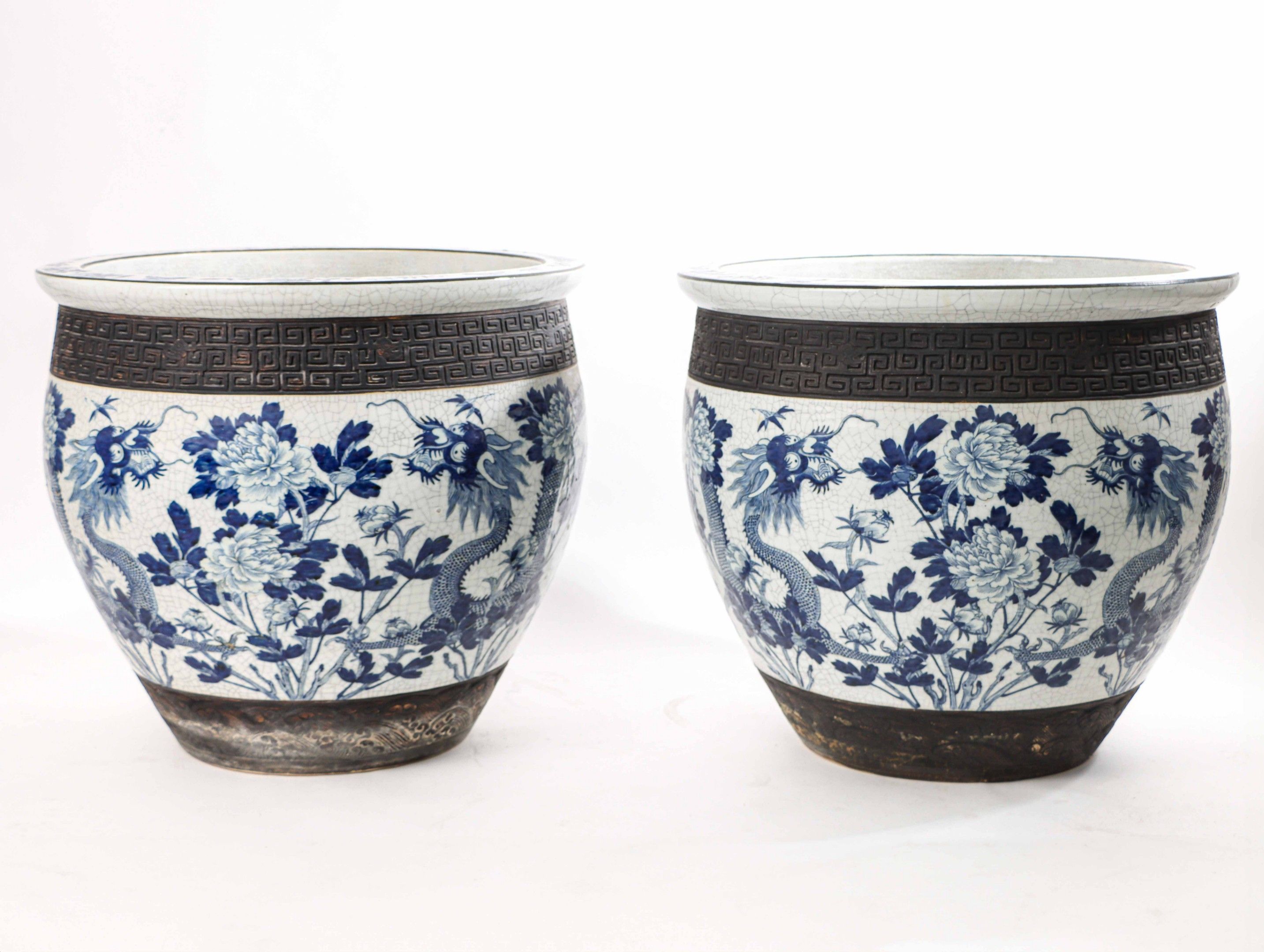An important pair of cracked beige glazed stoneware planters with blue decoration of two dragons facing each other among peonies in bloom.