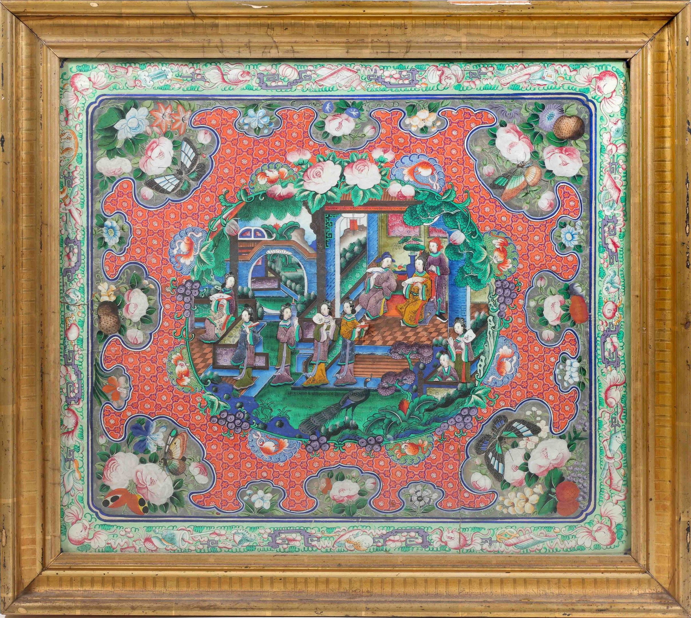 Gouache painting on paper, quadrangular in shape, decorated in the central part with animated palatial scenes, the figures treated in silk and in relief, the border decorated with brocades, the whole surrounded by a frieze of emblems, fish and bats.